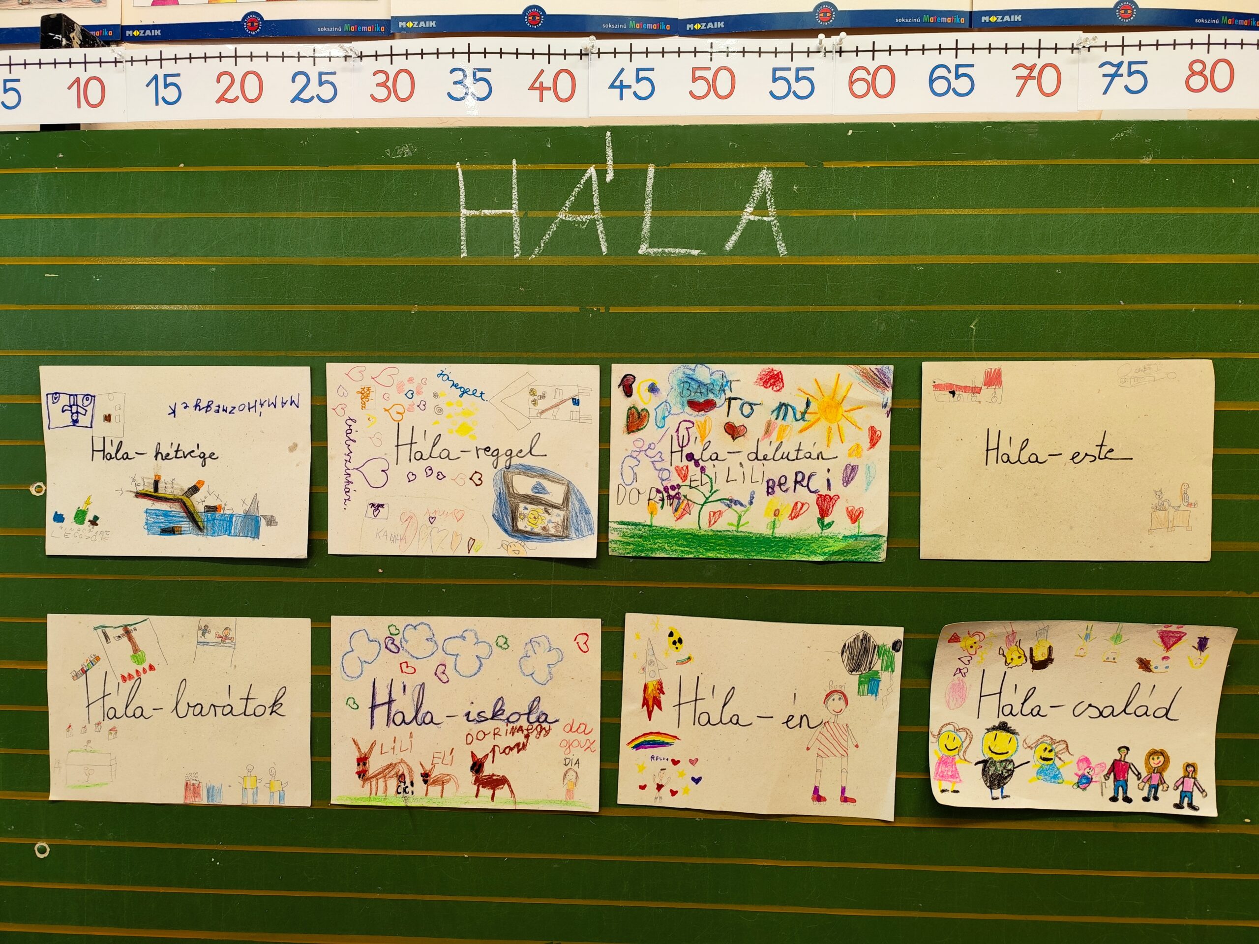 Majd iskolai eszközökkel, papuccsal, stb. kellett kirakniuk a HÁLA szót.