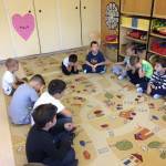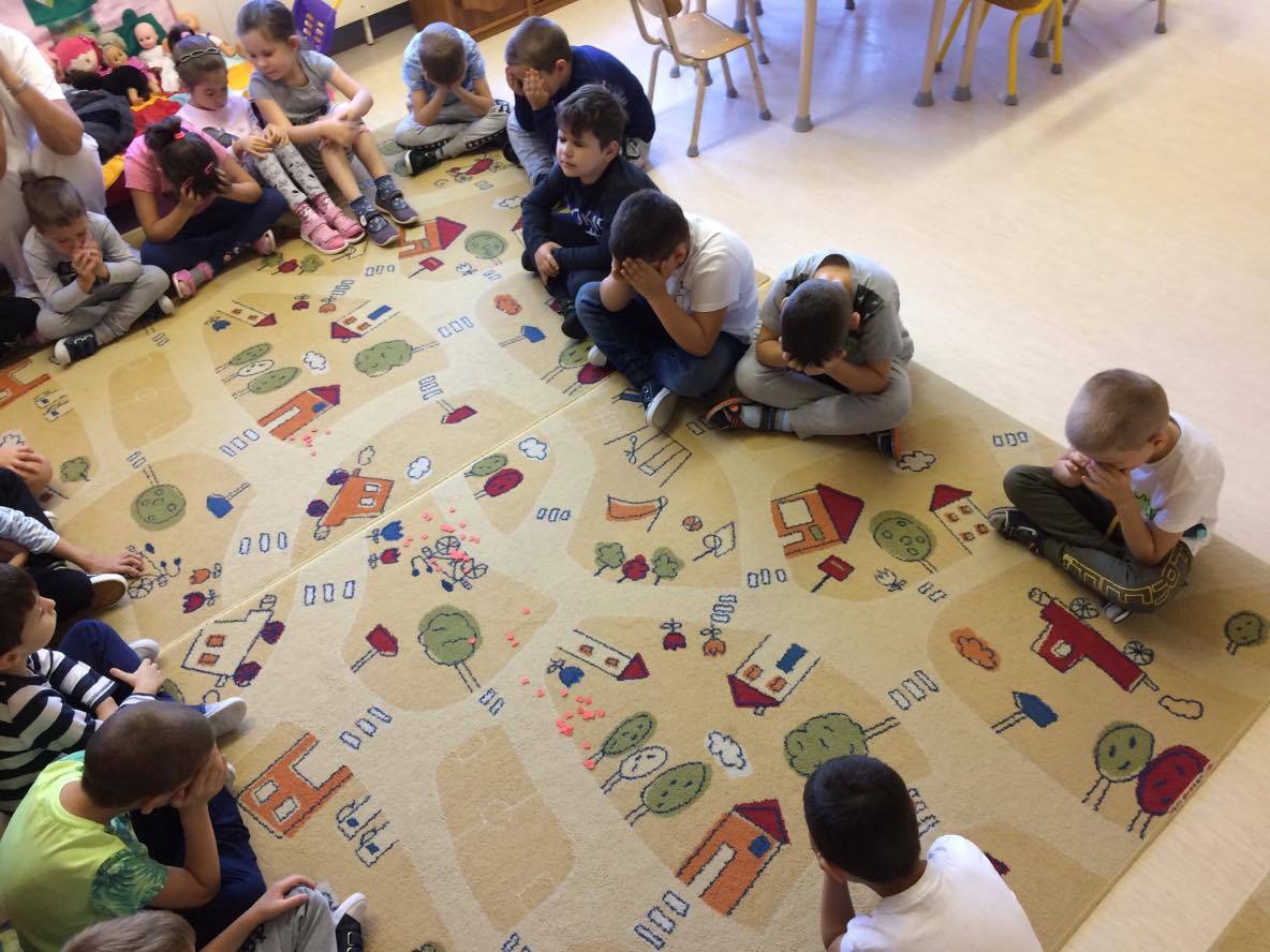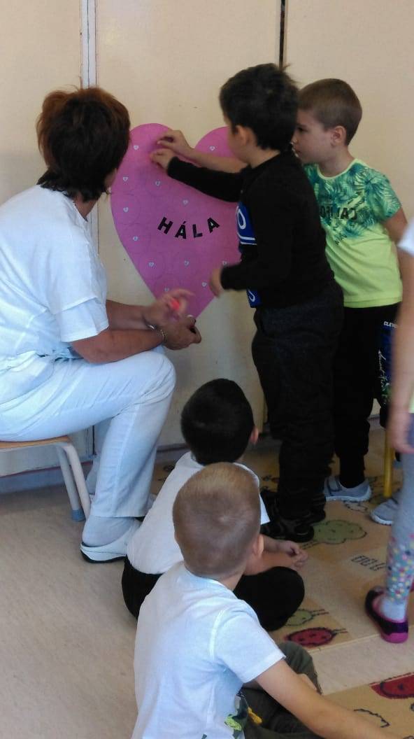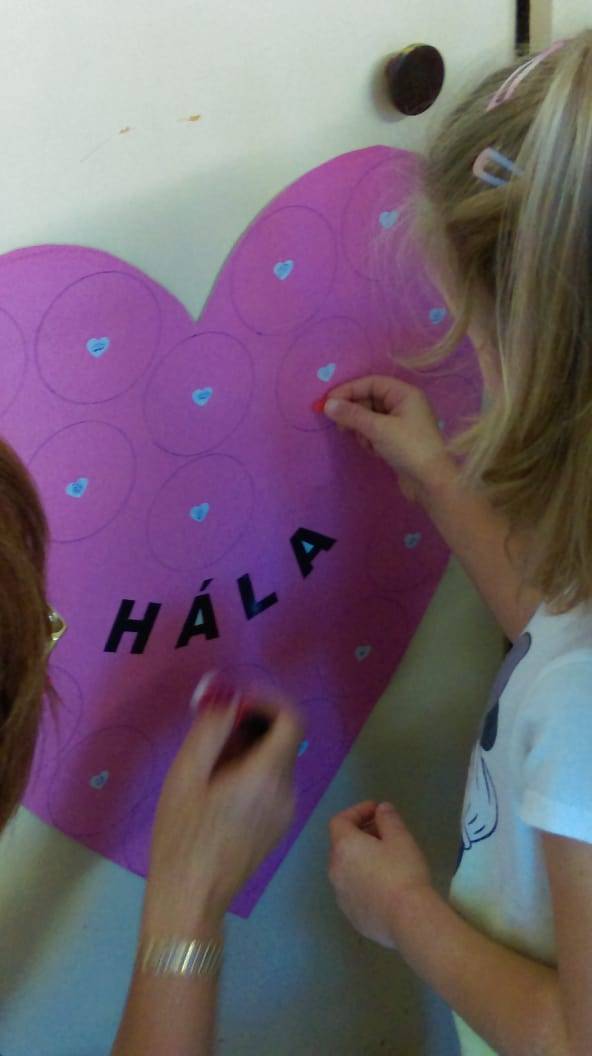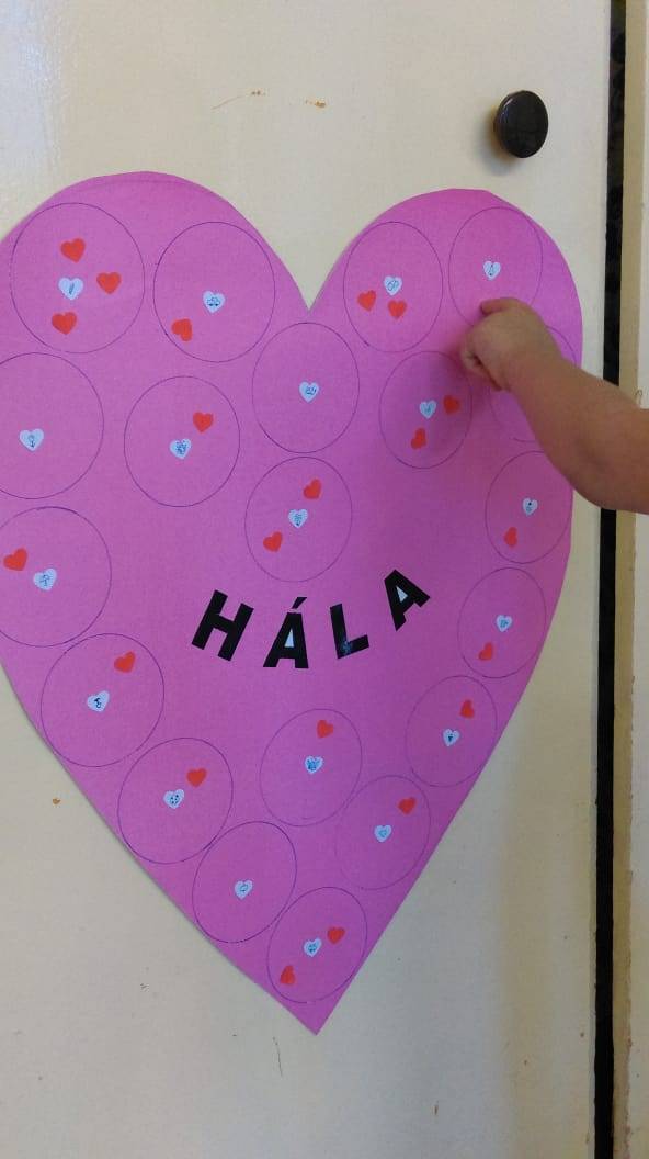 Minden gyermeknek van egy saját köre fehér szívecskével a közepén. A beszélgetés és zene meghallgatása után lehetőséget adunk minden gyereknek, hogy piros szívecskét ajándékozzon annak, akinek valamiért hálás a csoportban.
