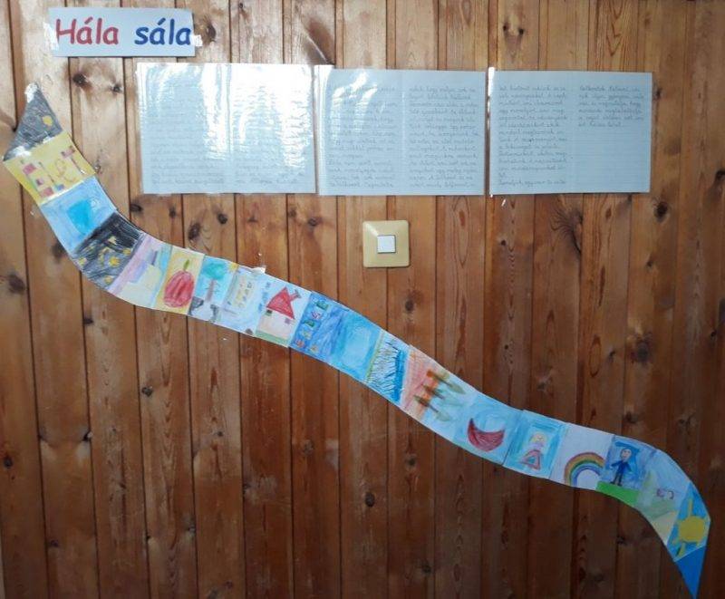 Nagyon tetszett nekünk a „Hála sála” feladat, bár mi másképp értelmeztük. Mindenki szerette volna rajzban megörökíteni, hogy miért hálás. Természetesen a sál formát választottuk, s ha már így volt, írtunk is egy mesét erről a csodálatos sálról. Egyetértettünk abban, hogy jó lenne, ha időnként megjelenne közöttünk Hála és ránk terítené a sálját….