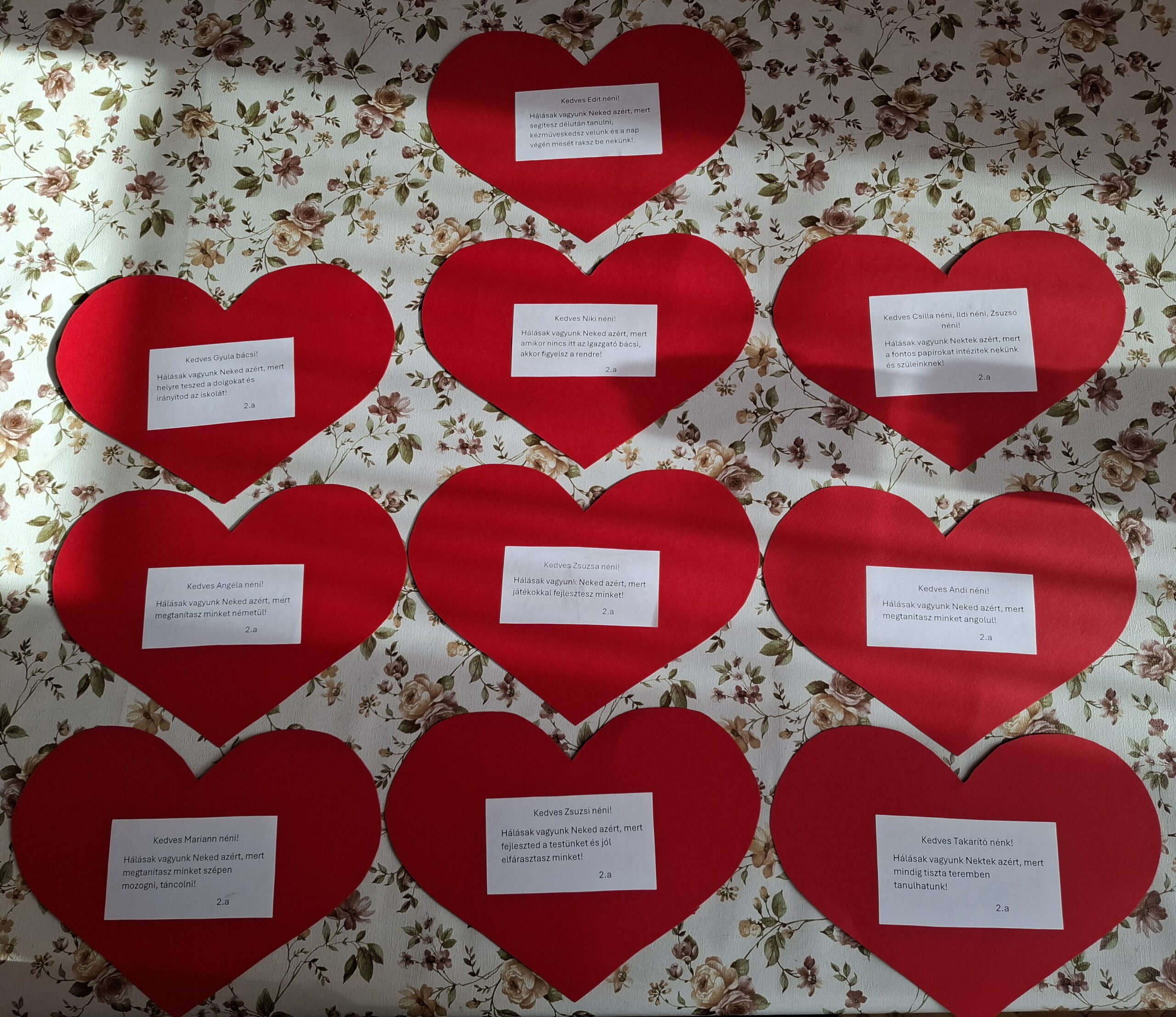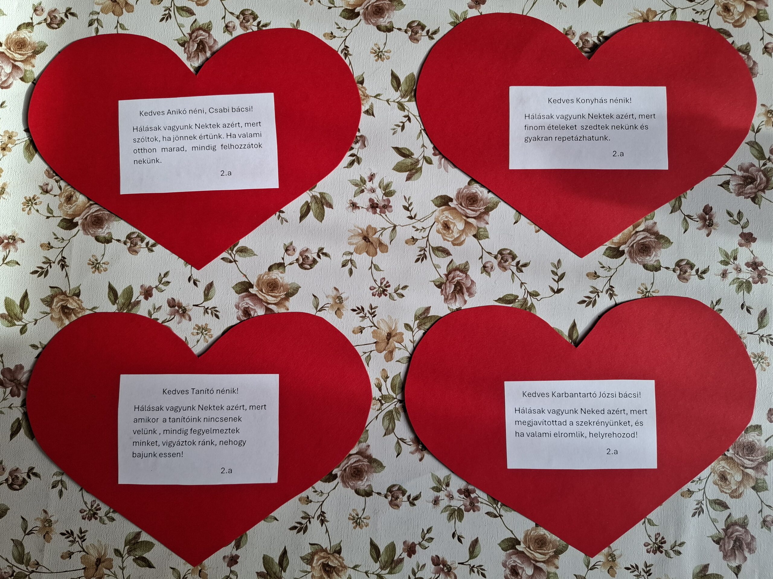 Szíveket adtunk az iskolánkban dolgozóknak, hálánk jeléül. A szívre került mondatokat a gyerekek fogalmazták meg.