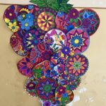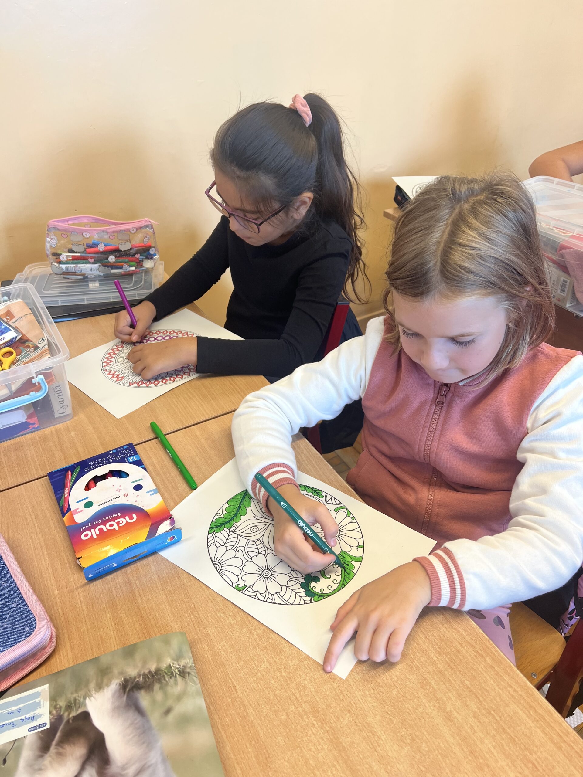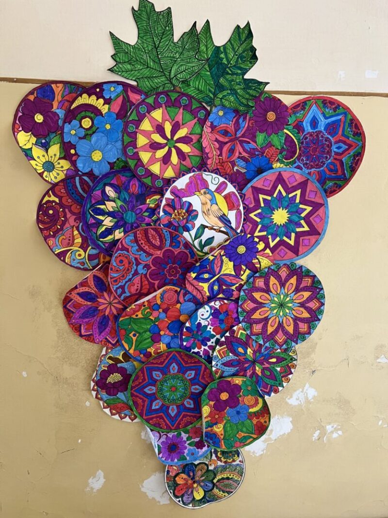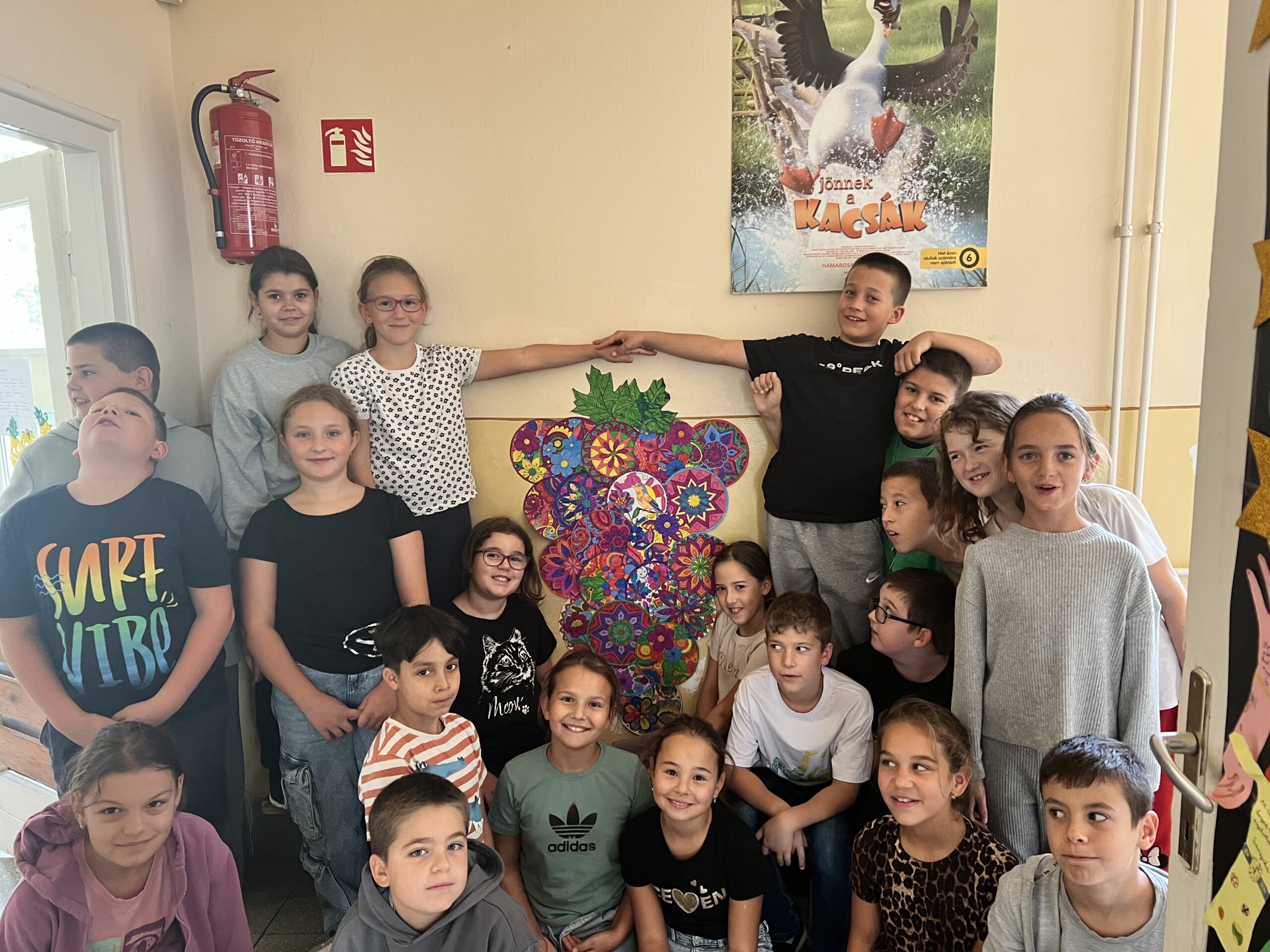 Ezután közös alkotás következett, egy Hála-fal, a mi esetünkben egy „Hála szőlőfürt” készítése. Mindenki választott egy mandalát, melyet filccel szépen kiszínezett és egy nagy szőlőfürtöt alakítottunk belőle. Minden egyes szőlőszem hátuljára egy szót írtak fel, amiről a hála jut eszükbe (pl. anya, játék, Fortnite, nyári emlékek, kiskutyám…)így fűztünk belőle egy közös „Hála szőlőfürtöt”.