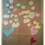 Egy kicsit megnehezítette a dolgomat, hogy az óra előtt két nappal az egyik kislányt elég komoly baleset érte, ez eléggé megviselte az osztályt, de ezt is kibeszéltük, és ebben a helyzetben is megfogalmazták, miért lehetnek hálásak. Az őszre való tekintettel egy boldogság -fát készítettünk, ezen egész hónapban folyamatosan teremnek majd a hála-gyümölcsök.A fa alatt a kis betegünk kórházból küldött, szívecskékre írt kis üzenetei kaptak helyet melyben megköszönte osztálytársainak a sok jókívánságot , kedves üzenetet amit tőlük kapott.Úgy gondoltuk, ezeknek is a hála tablón a helyük.