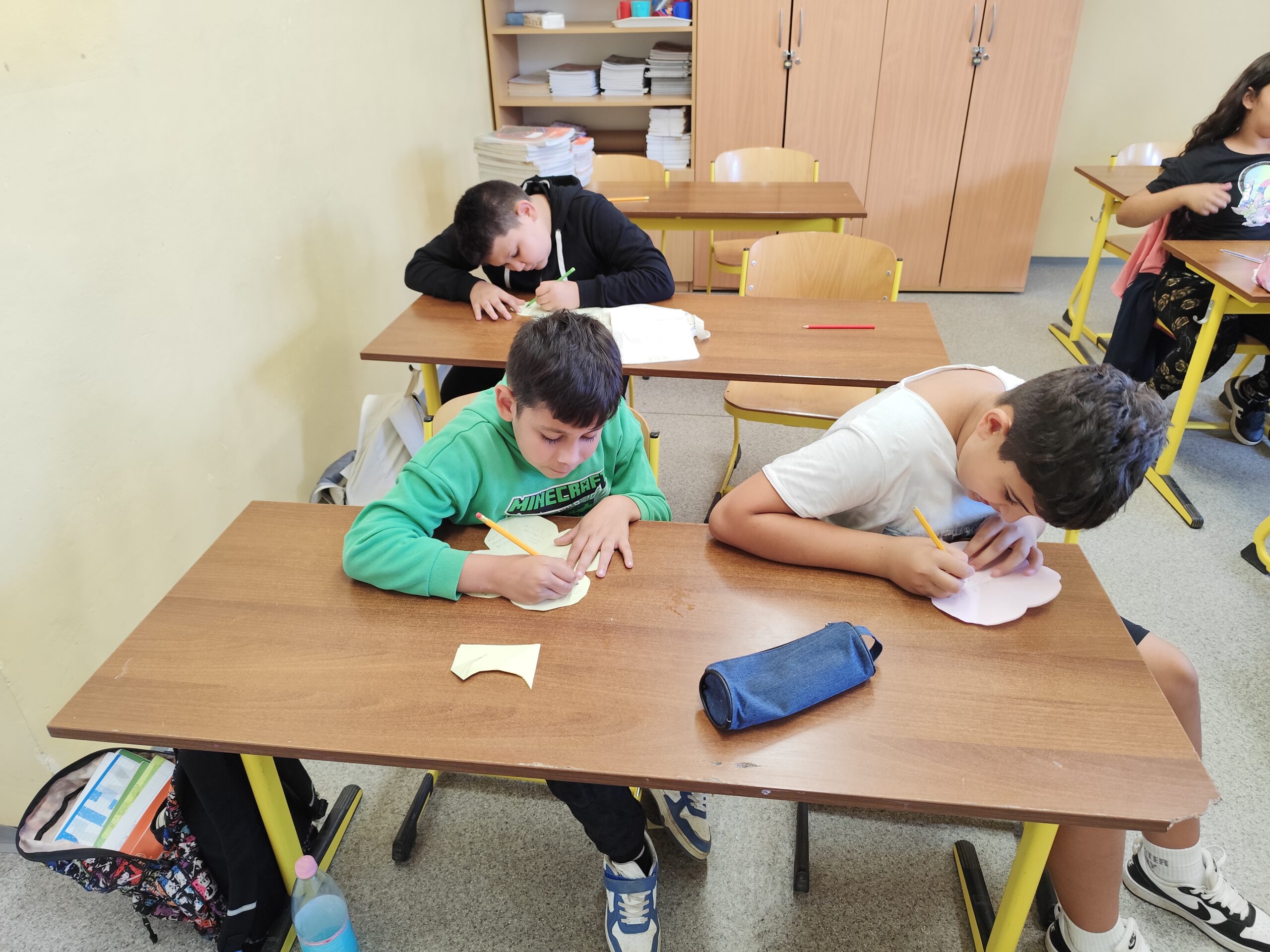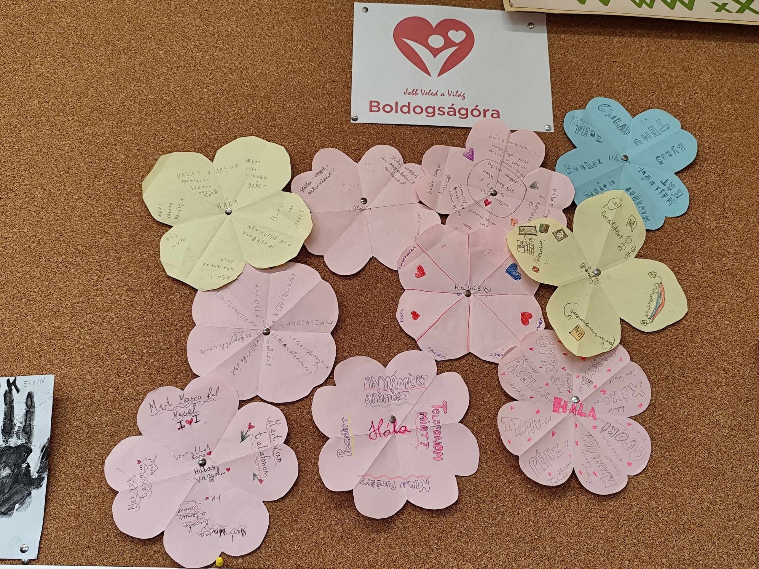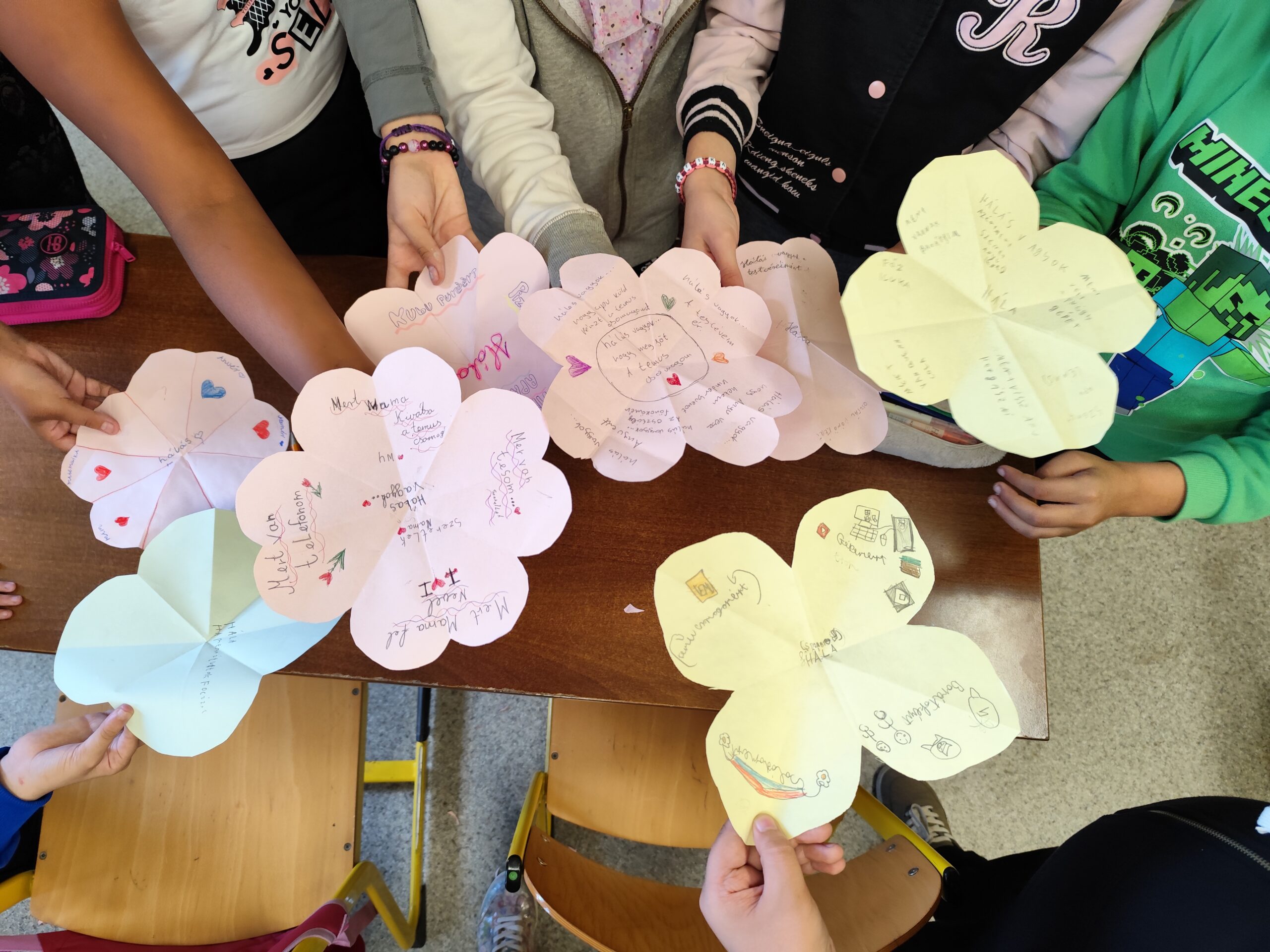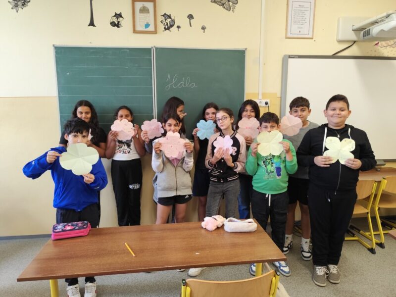 A hála gyakorlása során a gyerekekkel megbeszéltük, miért fontos a hála, miért érezhetünk hálát. Közösen gyűjtöttünk néhány példát. Majd a gyerekek virág formát vágtak ki, minden szirmára egy-egy számukra fontos dolgot írtak, melyekért hálát éreznek.