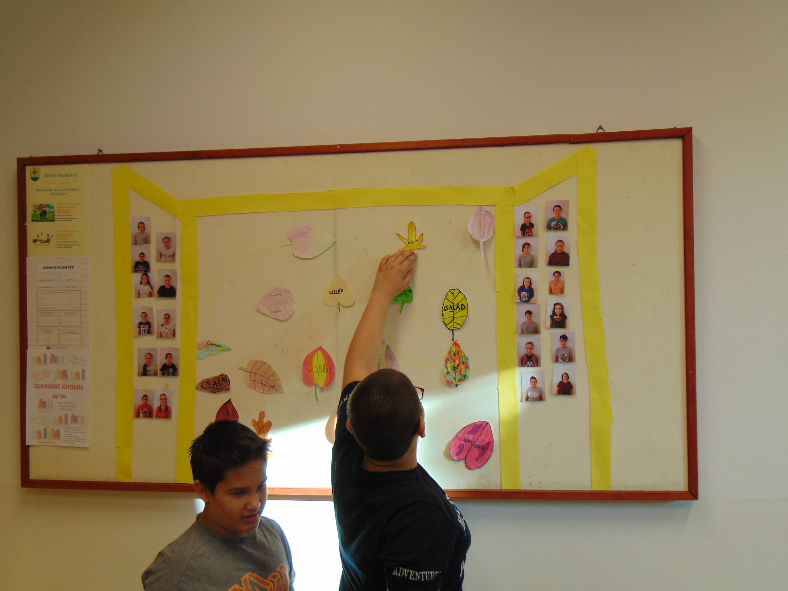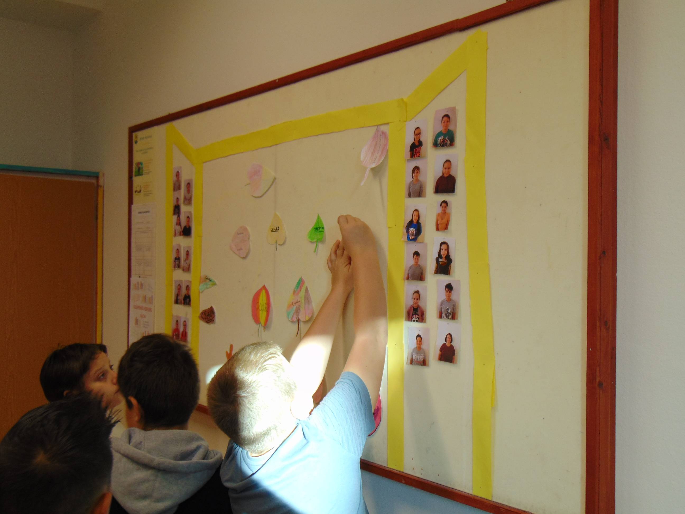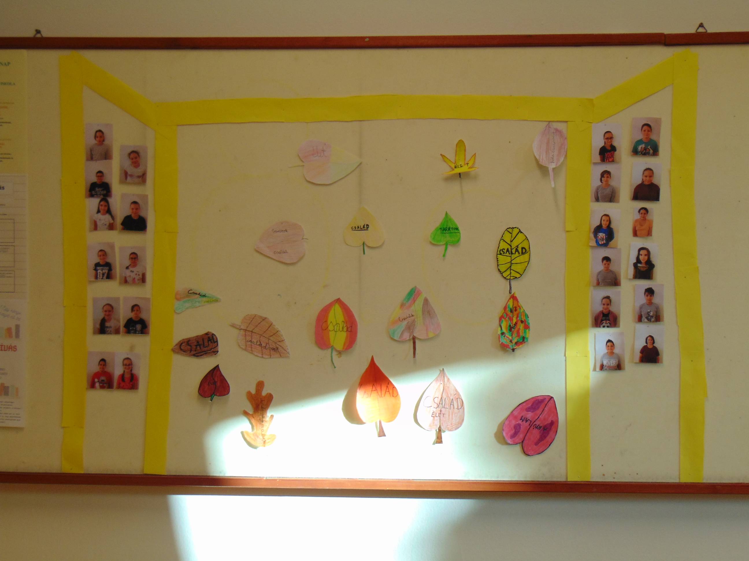 A gyerekek ötlete alapján az ablakkeretbe a saját fényképüket tűzték, az ablakba pedig a hála-szavukat az évszakhoz kapcsolódóan saját készítésű falevelekre írva.