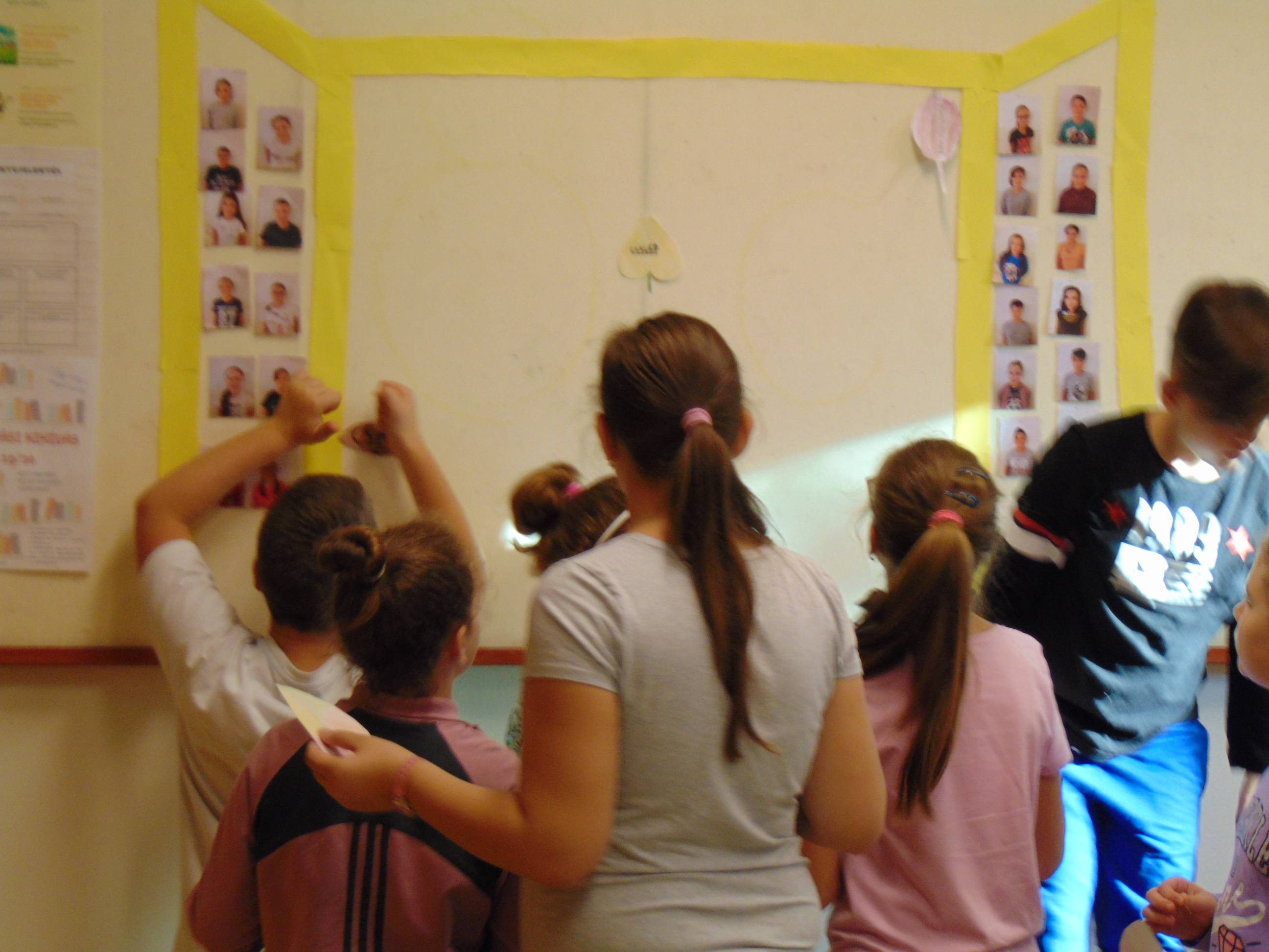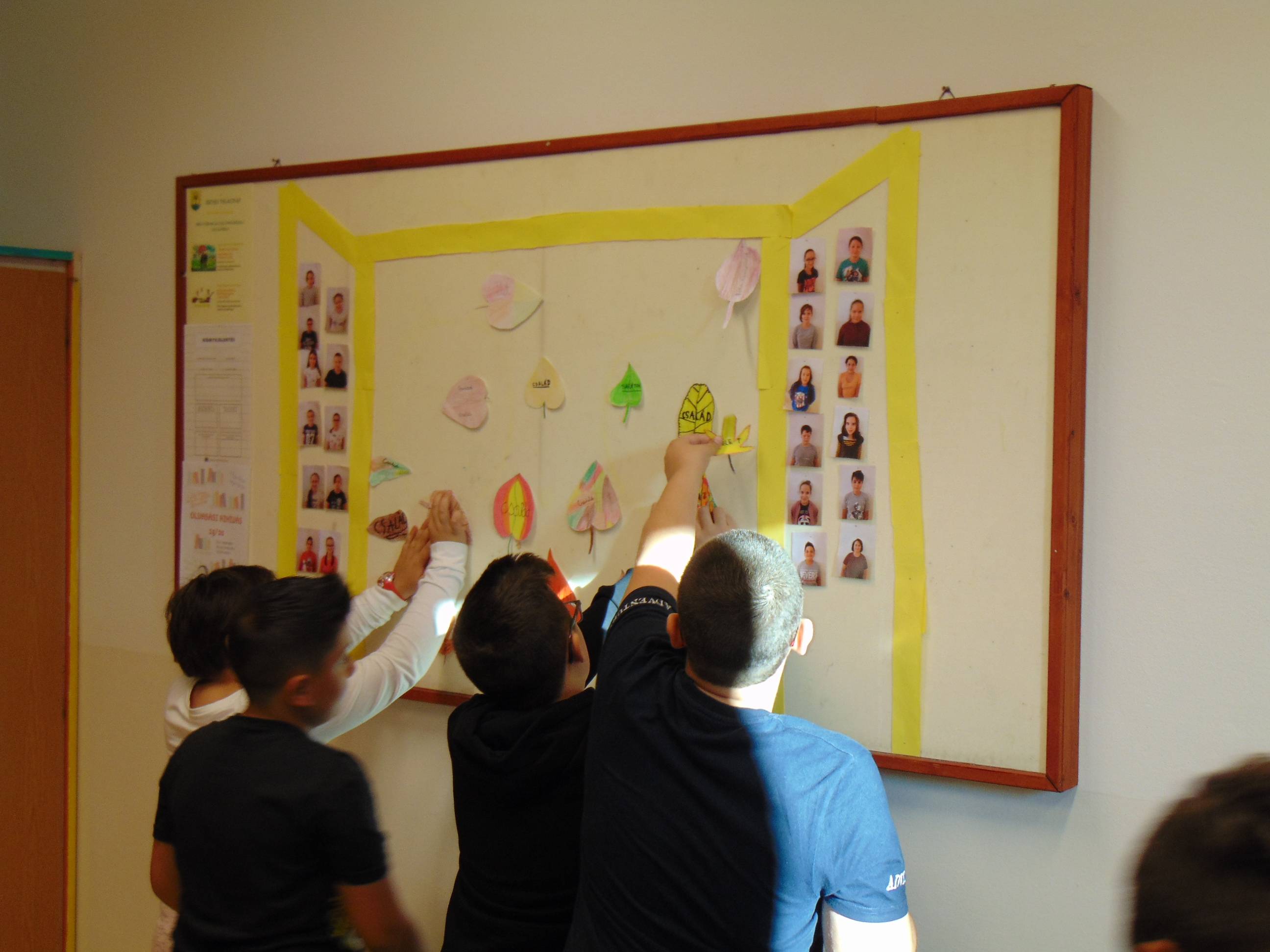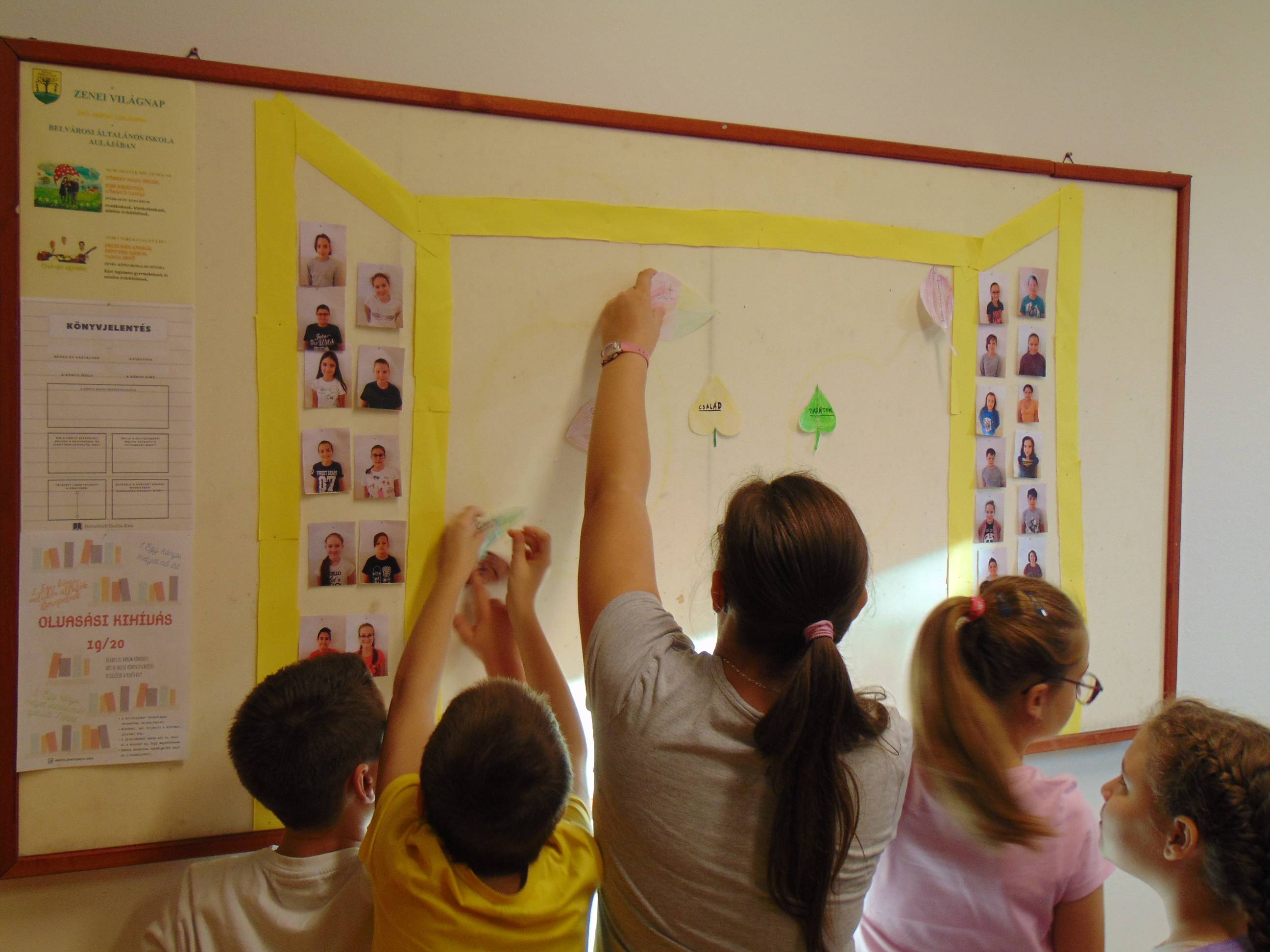 A gyerekek ötlete alapján az ablakkeretbe a saját fényképüket tűzték, az ablakba pedig a hála-szavukat az évszakhoz kapcsolódóan saját készítésű falevelekre írva.