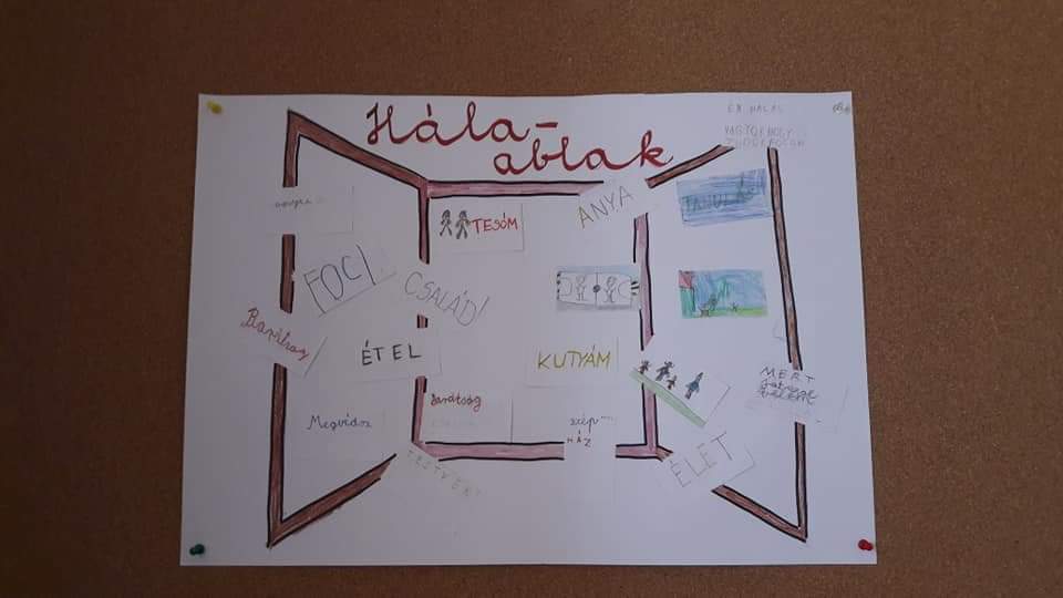 Két tanórán keresztül foglalkoztunk a témával. A gyerekeknek nagyon tetszett a „miért vagyunk hálásak” beszélgetőkör. A hálaablak készítése közben spontán megnyilatkozások alakultak ki a saját kis életükről. Kellemes óra volt.
