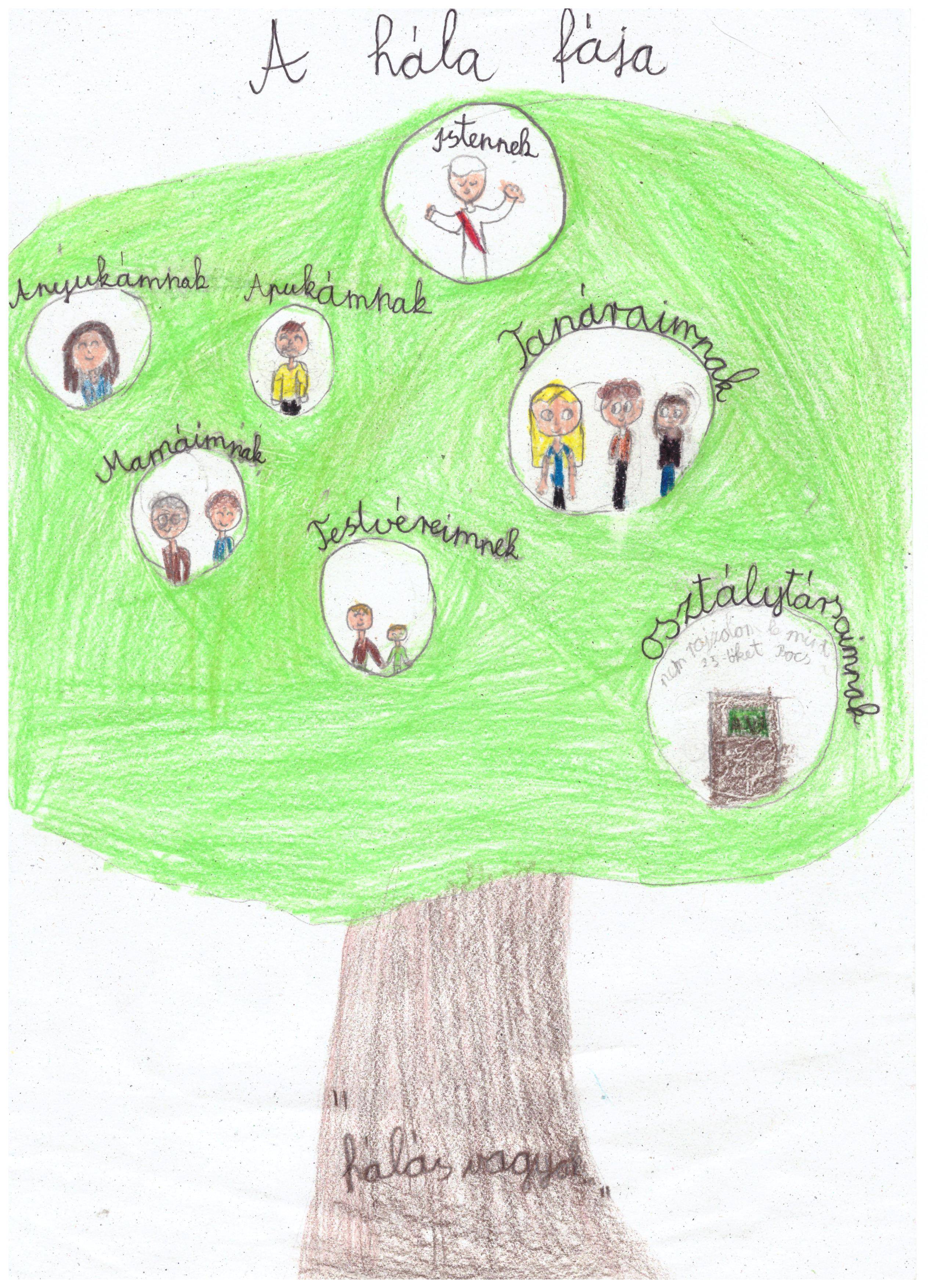 A hónap dala meghallgatása után beszélgetőkört indítottunk. Megvitattuk mi is az a hála? Ki mi miatt érzi magát hálásnak? Miután meghallgattuk mindenki véleményét, a tanulók nekikezdtek alkotásaik elkészítéséhez. Az alkotó munkafolyamat nagy örömmel telt, jókedvűen rajzoltak lágy, relaxáló dallamok kíséretében.