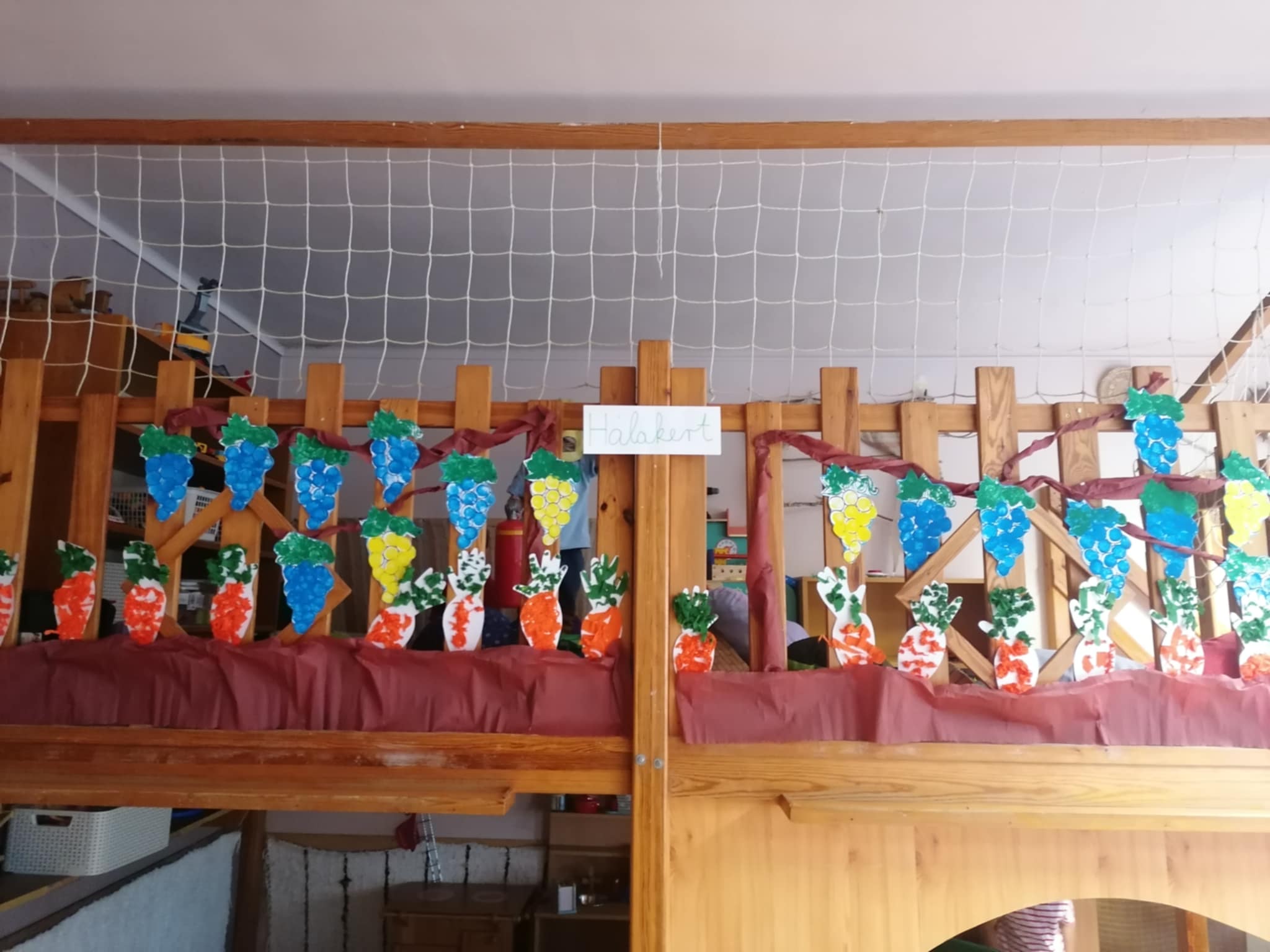 Középső csoportunkban nagyon szép kis hálakertet kerteltek a gyerekek, telis- tele finomabbnál- finomabb őszi zöldségek teremtek benne, „amiből” a hét vége felé ízletes zöldségsalátát készítettek, és az egész óvodát megkínálták.