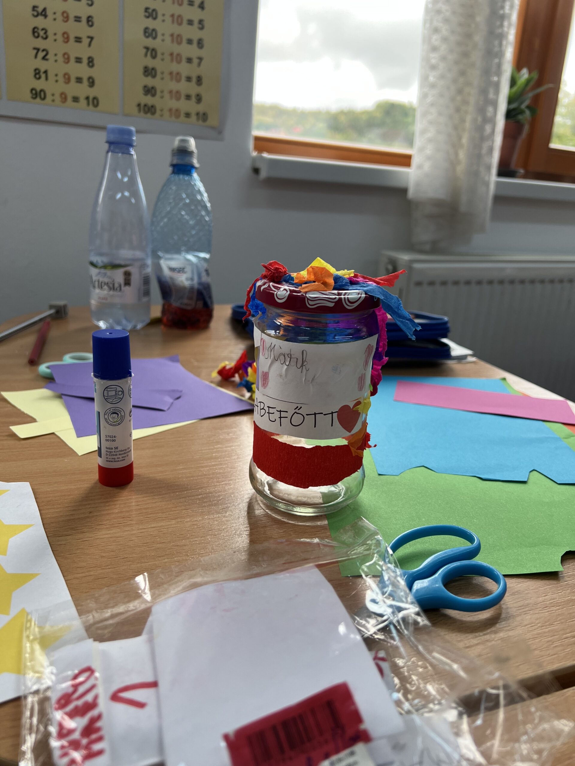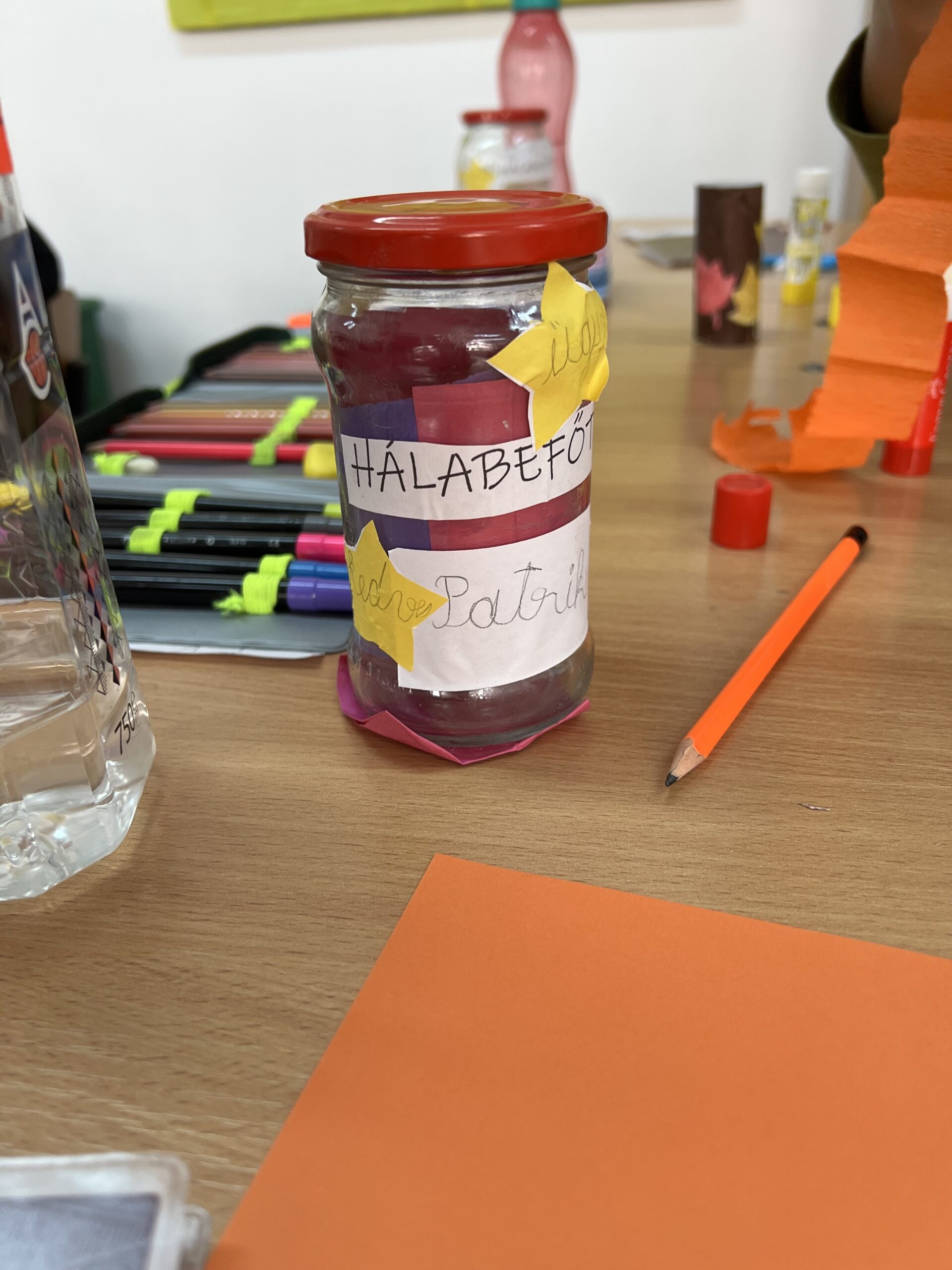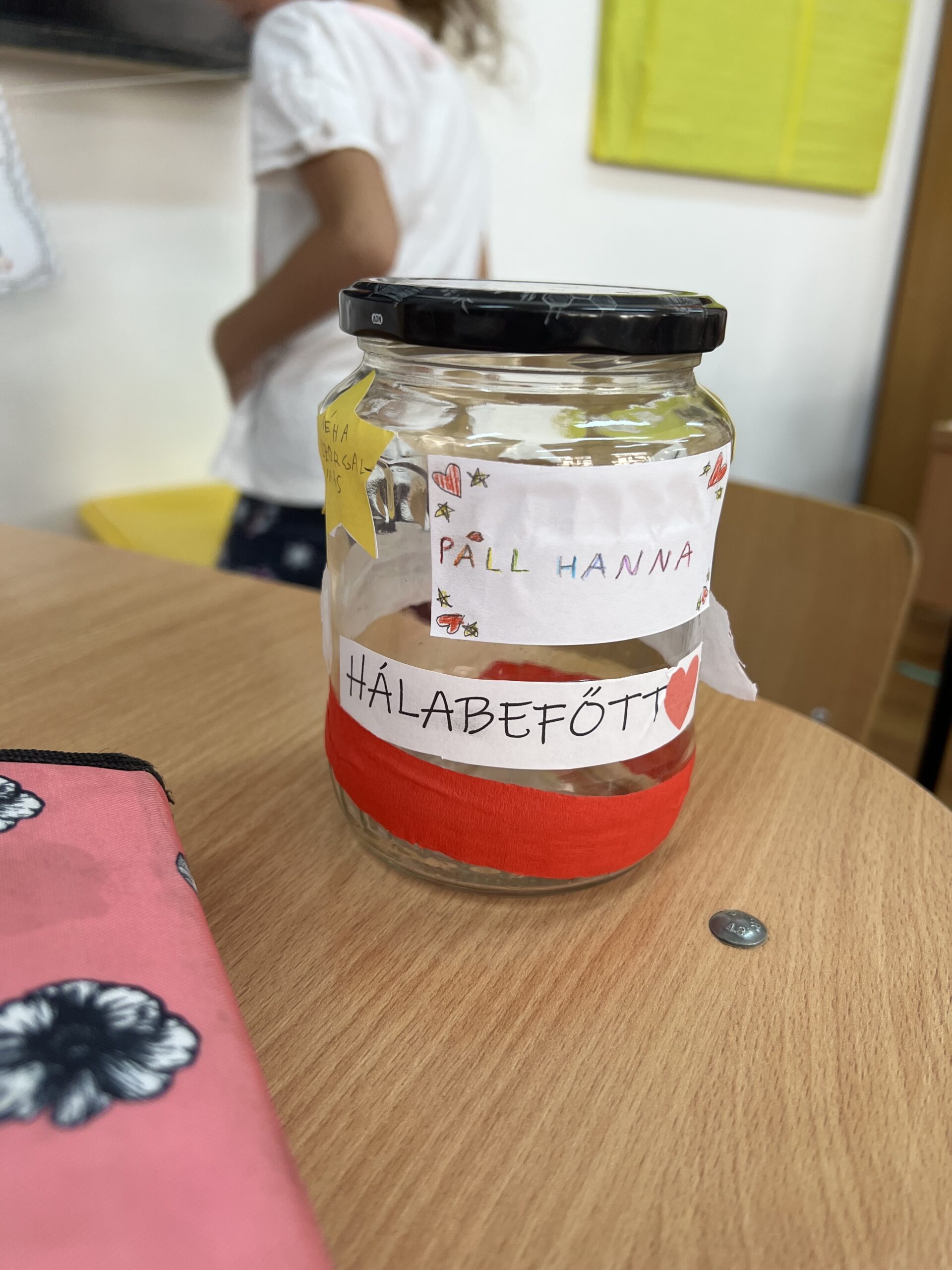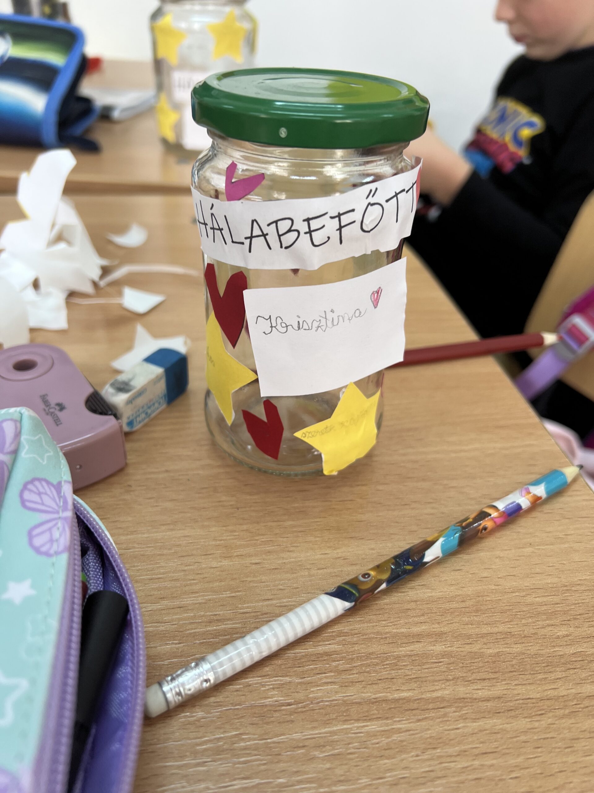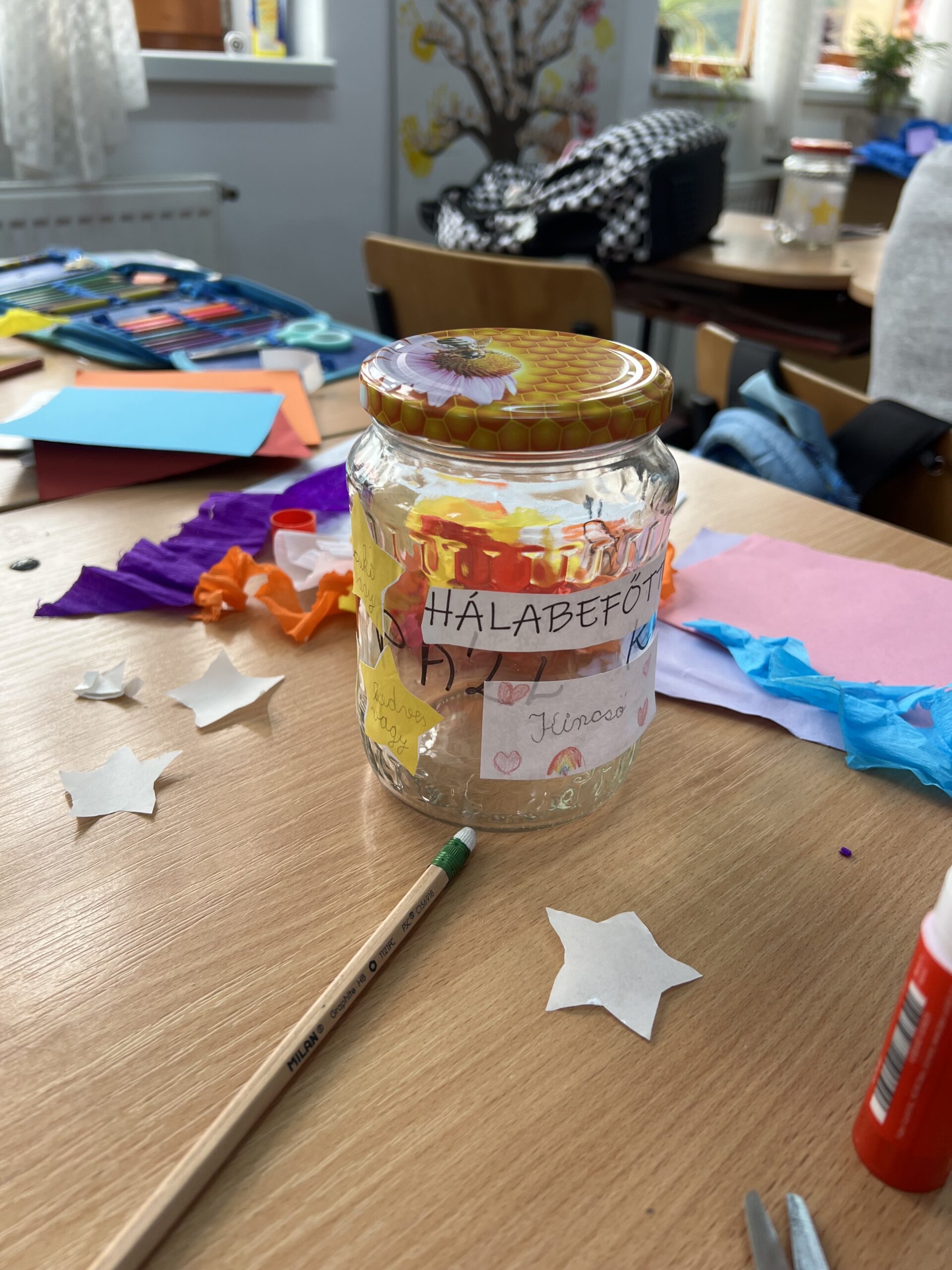 A hála téma tovább gondolása céljából hála befőttet készítettünk, amire a gyerekek csillagokat ragasztottak és arra azt írták fel, amiért maguknak hálásak lehetnek. A hálabefőttet mindenki tetszés szerint díszítette.