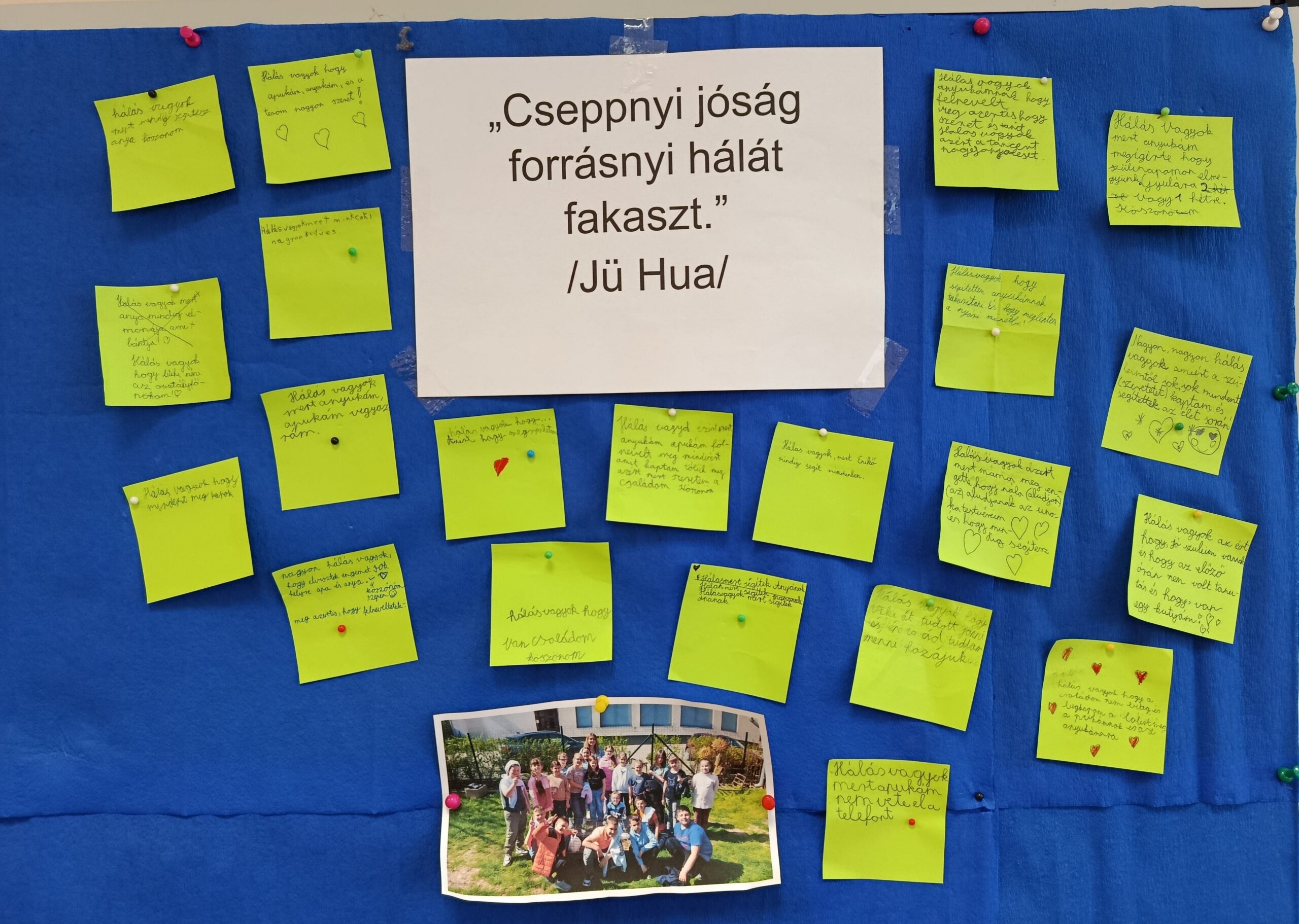 A foglalkozáson le kellett írniuk egy dolgot, amiért hálásak. A cetliket kiragasztottuk az osztályfalra.