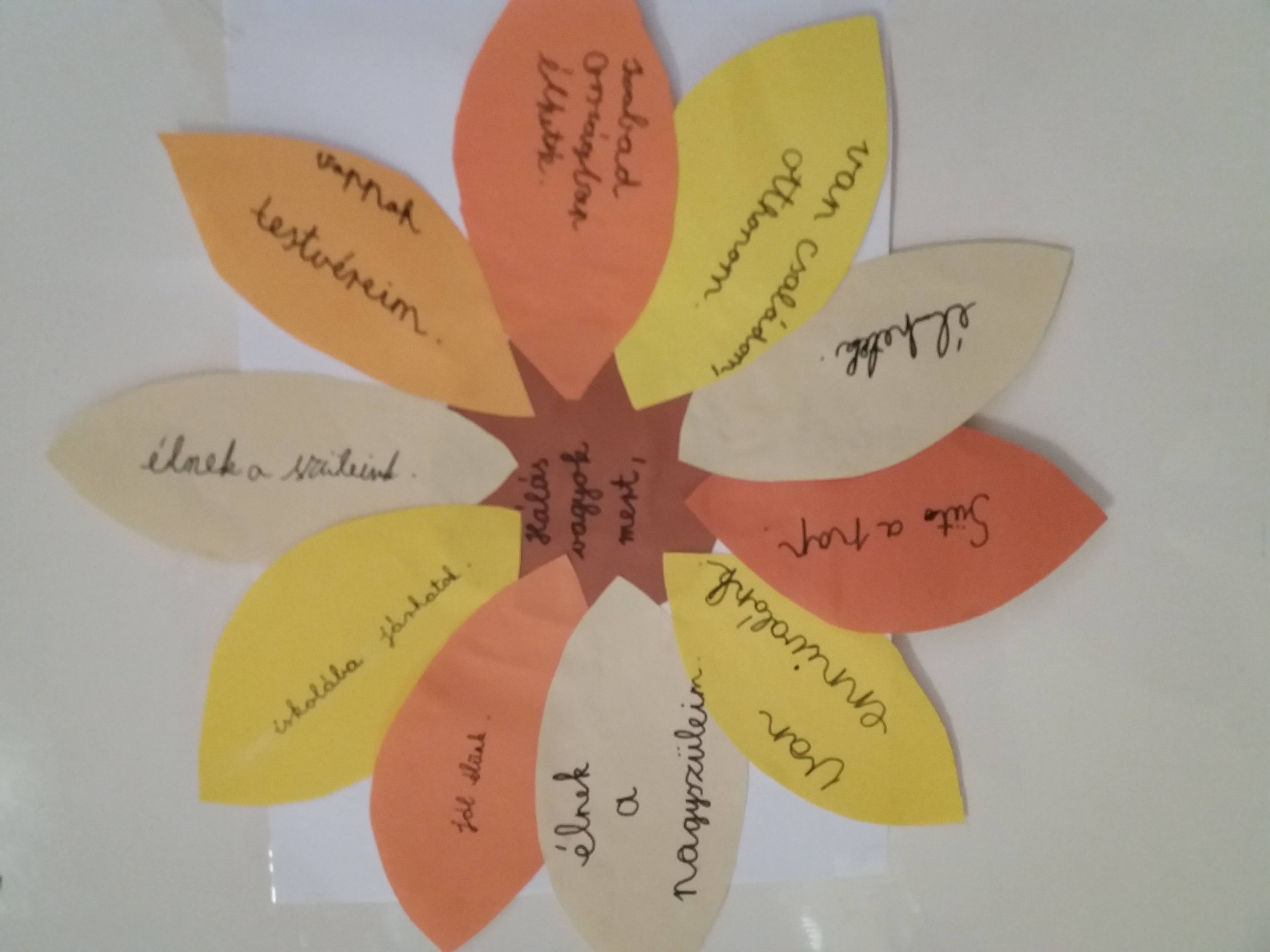 + hálavirág – Amiért hálás vagyok. ( csoportunk neve, jele: napvirág, napraforgó virág, ennek szirmaiba írták amiért hálásak )