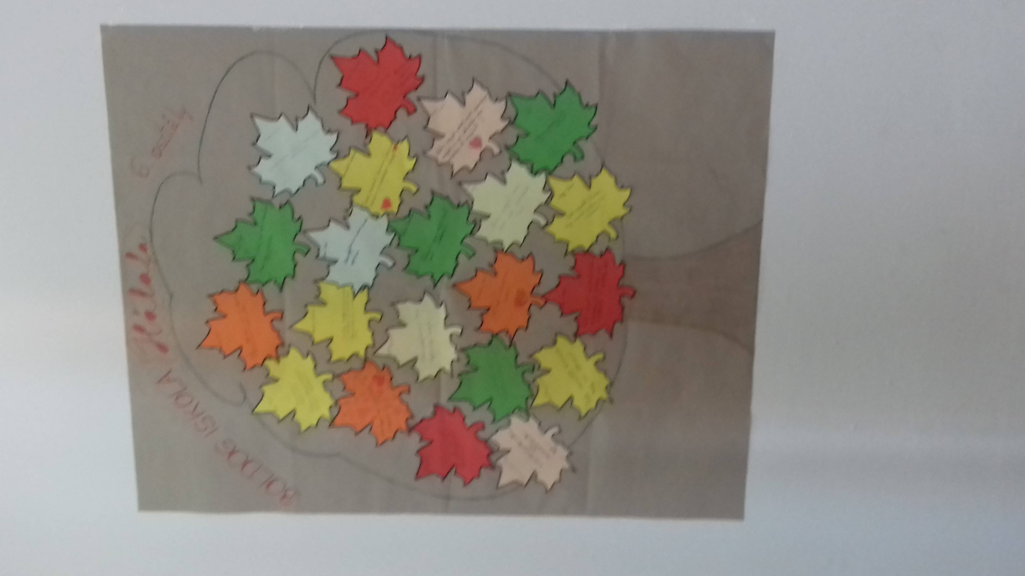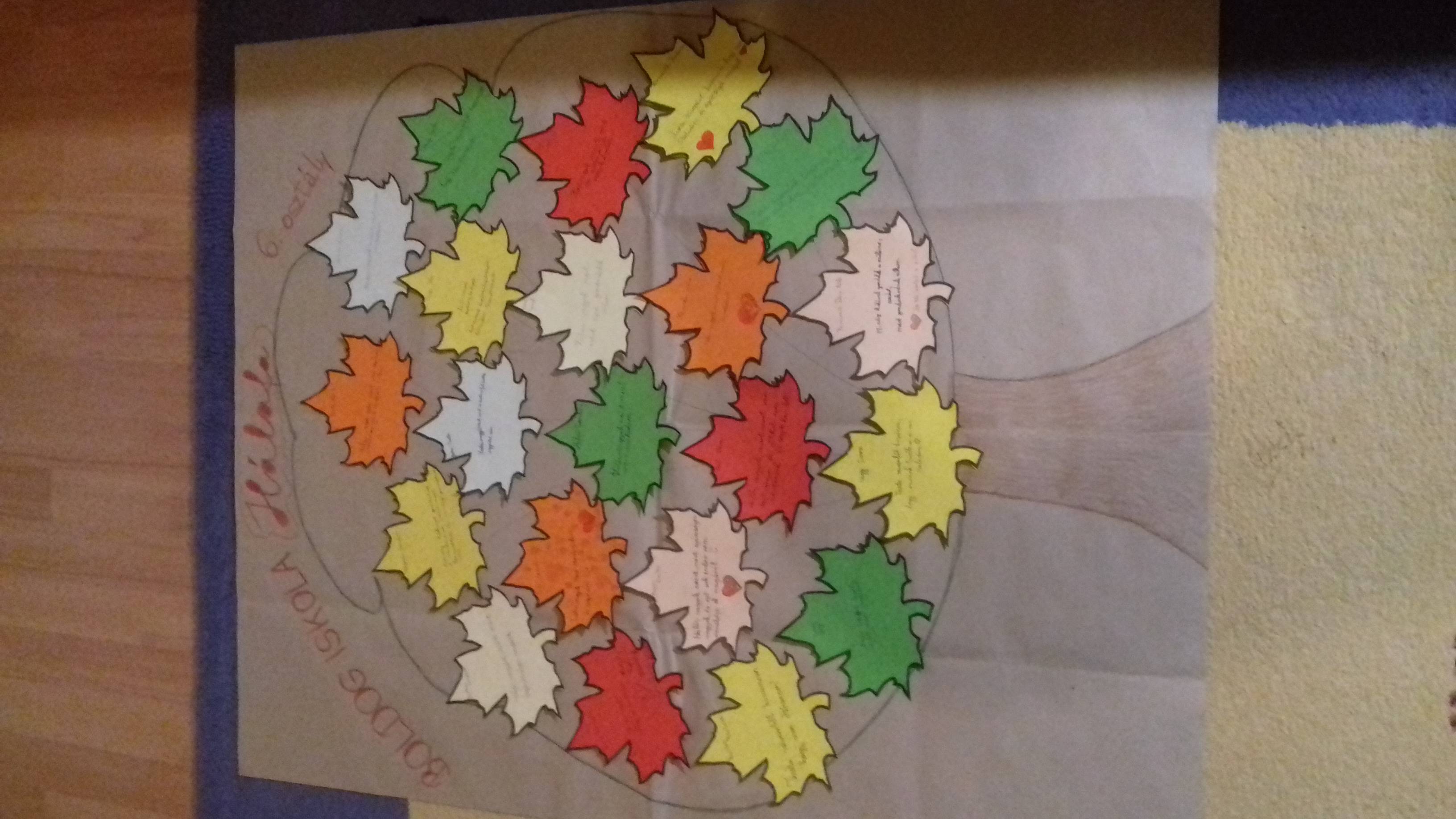 Majd a munkafüzet 12. oldalán található, a hála kifejezésére szolgáló mondatok közül közösen kiválasztottuk hármat, amit felírtam a táblára, és saját magukra vonatkoztatva nekik kellett megfogalmazni, befejezni ezeket a gondolatokat, majd színes papírra fénymásolt levélsablonba beleírni, amit aztán a „Hálafa” rajzán elhelyeztünk, és kiraktunk a tanterem falára.