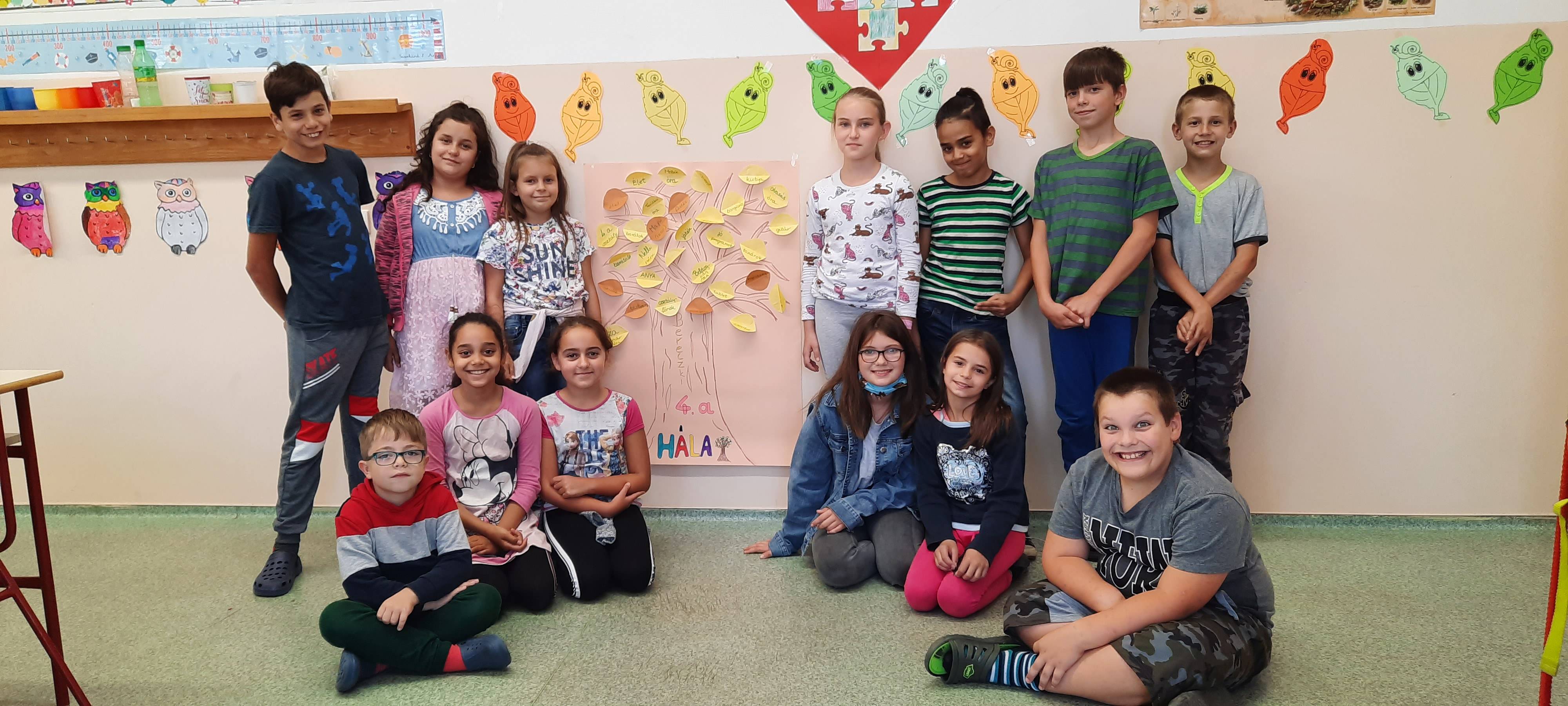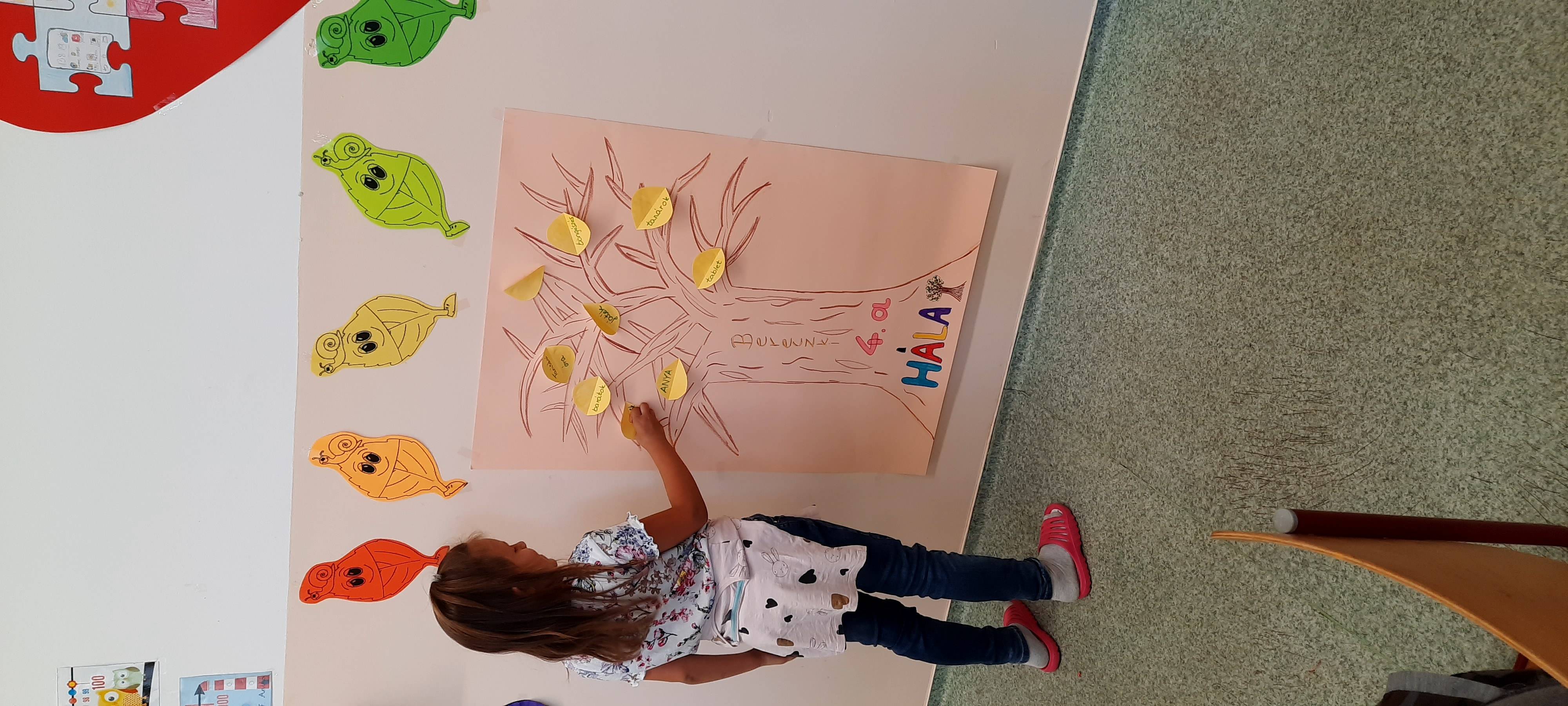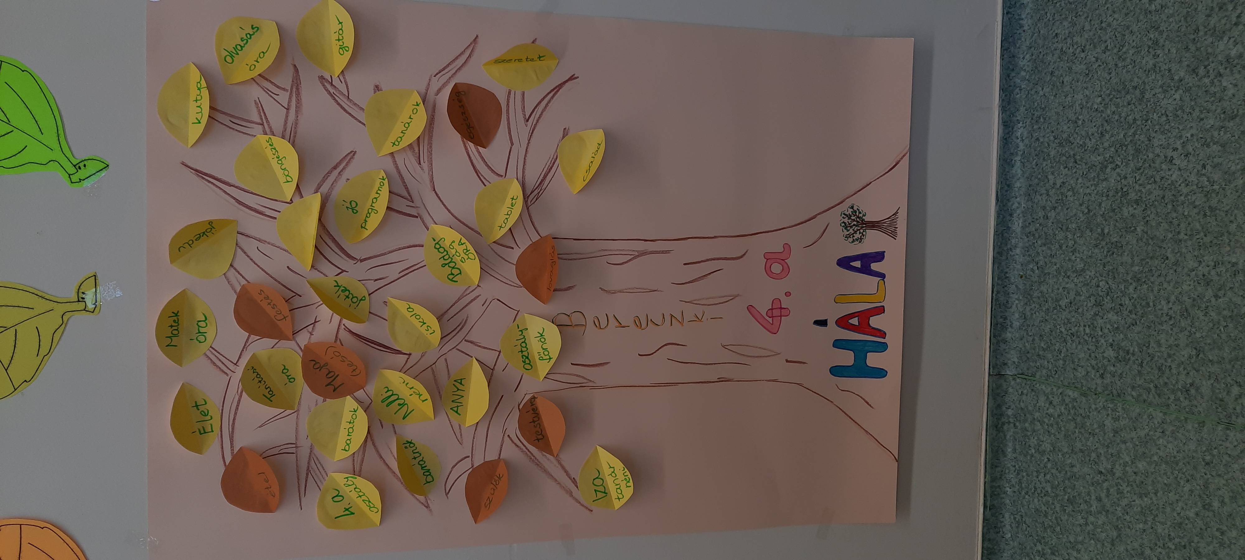 Előrerajzolt fa kontúrjait átrajzolták a gyerekek és saját kedvükre díszítették. Levelekre írtak 1-1 szót, amiért hálásak, majd ezeket egyesével felragsztották a fára.