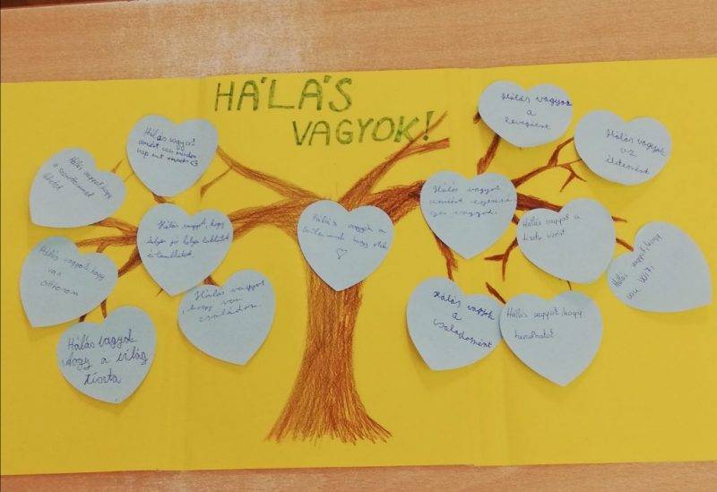 A tanóra elején meghallgattuk a hála dalt. Ezután elbeszélgettünk a 7.A osztályos tanulókkal arról, hogy mi is az a hála. Végül közösen hálafát készítettek, aminek a szív alakú leveleibe beleírták, ők miért hálásak az életben. A tanulók leggyakrabban a családjukért, a szülőkért, az egészségükért, az otthonukért, a tiszta levegőért, a tiszta vízért, a mindennapi ételért, a tanulási lehetőségért és az iskoláért hálásak… de volt olyan is, aki a wifit írta fel a falevélre. Nagyon tanulságos és meghitt perceket éltek át a gyerekek a hálafa készítése közben.