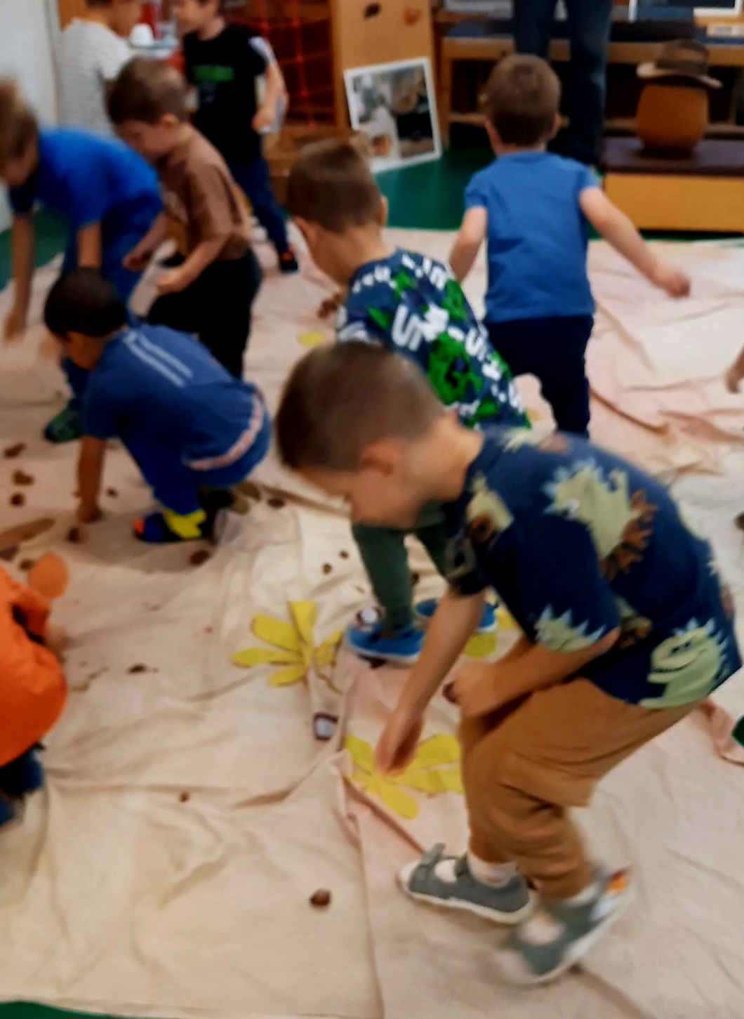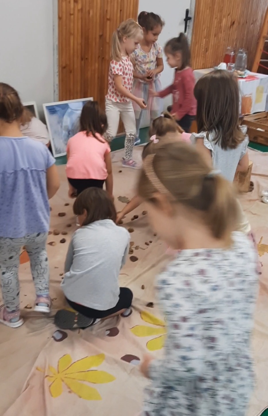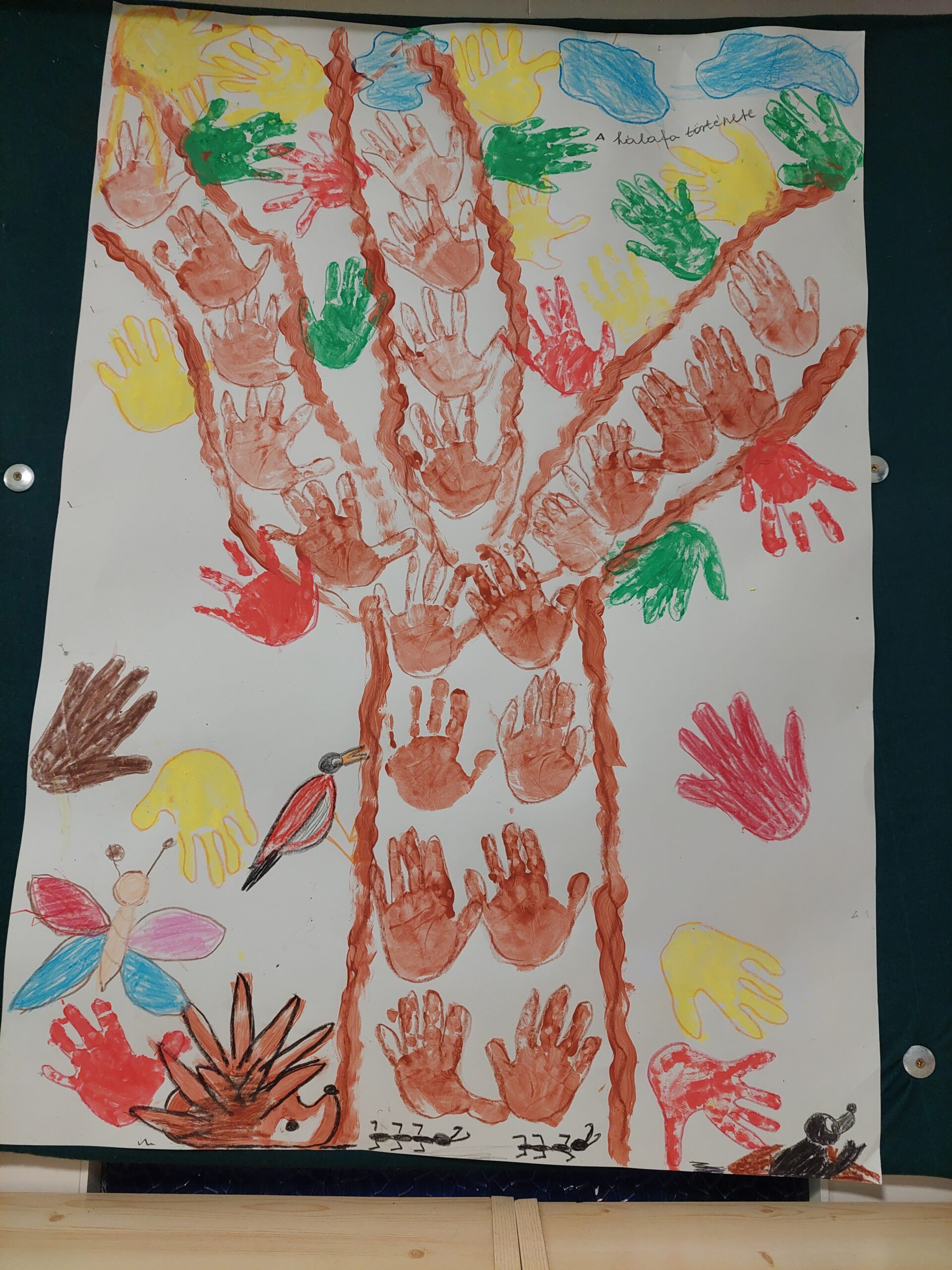 A hét további részében az általunk elkészített kép háttérként szolgált a Hálafa története meséhez, amit bábok segítségével hívtunk életre. A mesében hallott állatoknak elemózsiát is gyűjtöttünk meseerdőnkben, hogy legyen mit elraktározni az odú mélyén. A közös élmények nagyban hozzájárultak az új közösség összekovácsolódásához, az új kicsik beszoktatásához, az örömteli pillanatok megélésében.