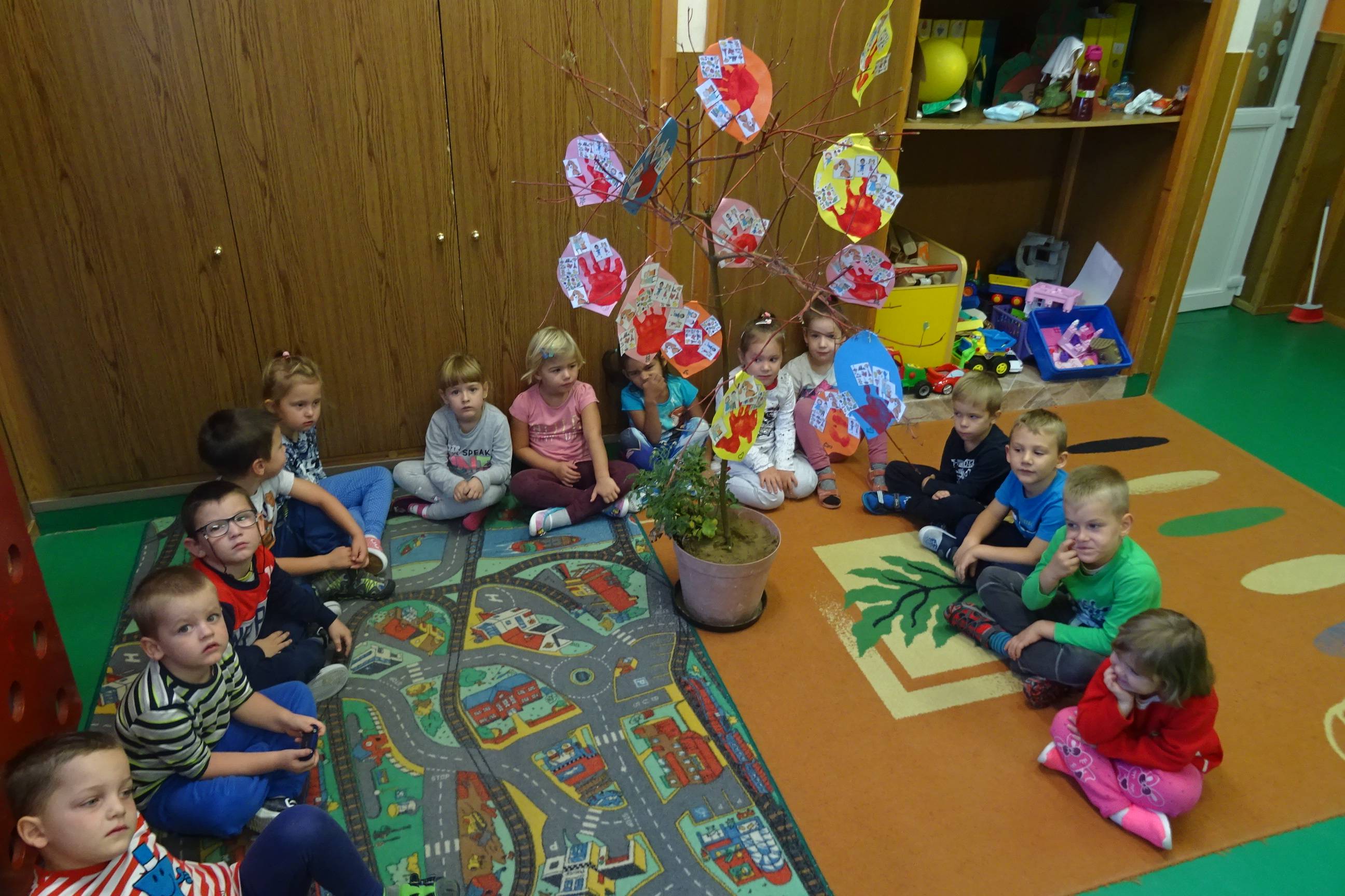 A Boldogságóra szeptemberre vonatkozó témaköre a hála gyakorlása. Nyitnikék Tagóvoda Méhecske csoportja hála faleveleket készített a csoport hálafájára,de előtte körbe ültünk a szőnyegen és beszélgettünk a háláról , hogy ők kinek , miért hálásak. Egy bábot választottak a pillanatnyi hálaérzésüknek megfelelően. Aztán színes levélformákra tenyérlenyomatot készítettünk, és a kezek végére azokat a szimbólumokat ragasztották fel , amiért ők hálásak és ezeket elhelyezték a hálafára.