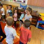 Később meglátogatta csoportunkat Sün Samu, a kis kesztyűbáb, aki nagyon megijedt a hangos zajoktól, ezért arra kértük a gyerekeket, hogy csendben, szeretettel simogassák meg a kis Samut. Relaxációs zenére körbe jártunk a csoportszobába, és kézről kézre adták a kis sünikét. Samu nagyon hálás volt nekik a sok simogatásért, és teljesen megnyugodott. Elbúcsúzott a gyerekektől, visszavonult az avarba pihenni.