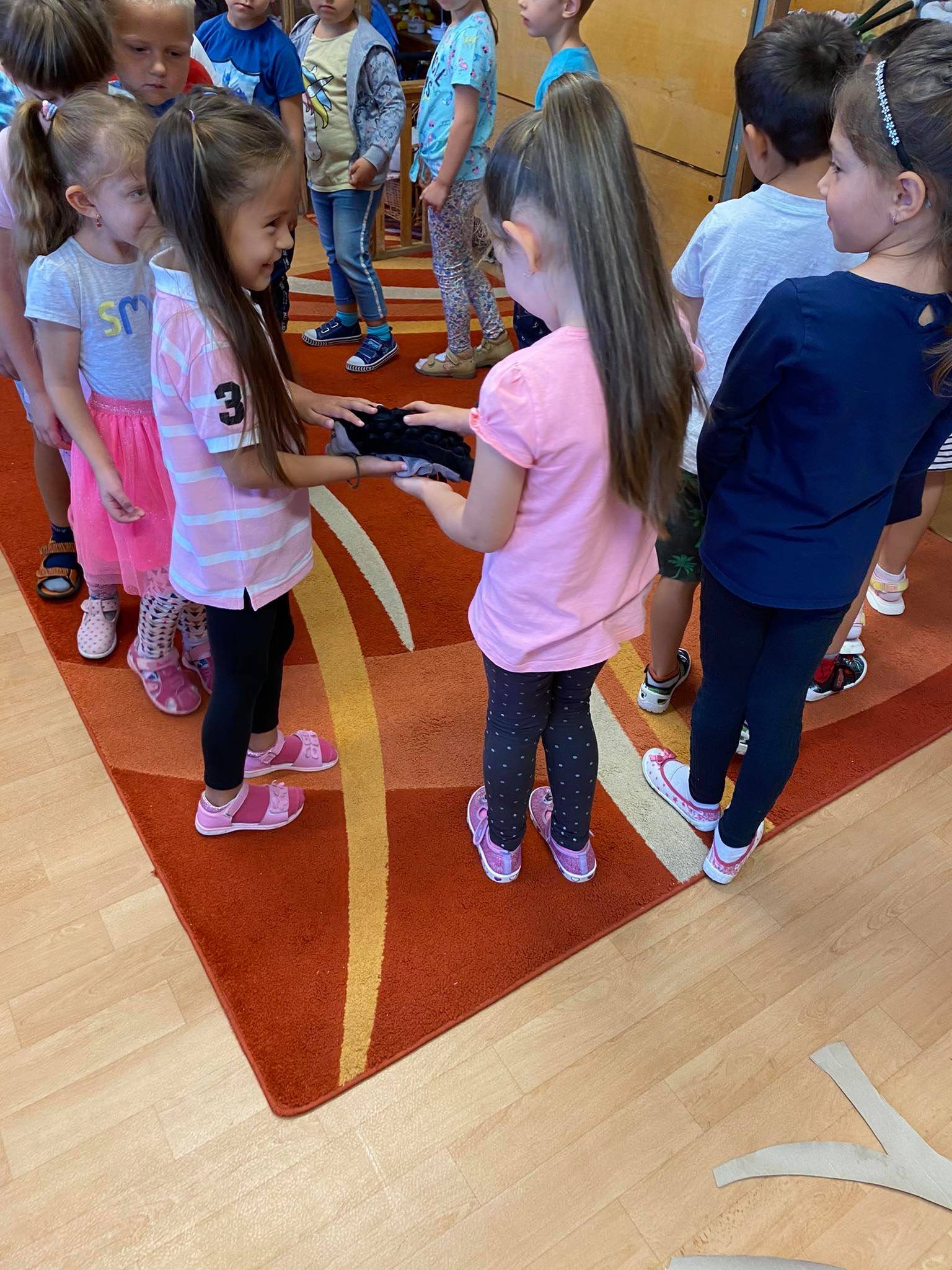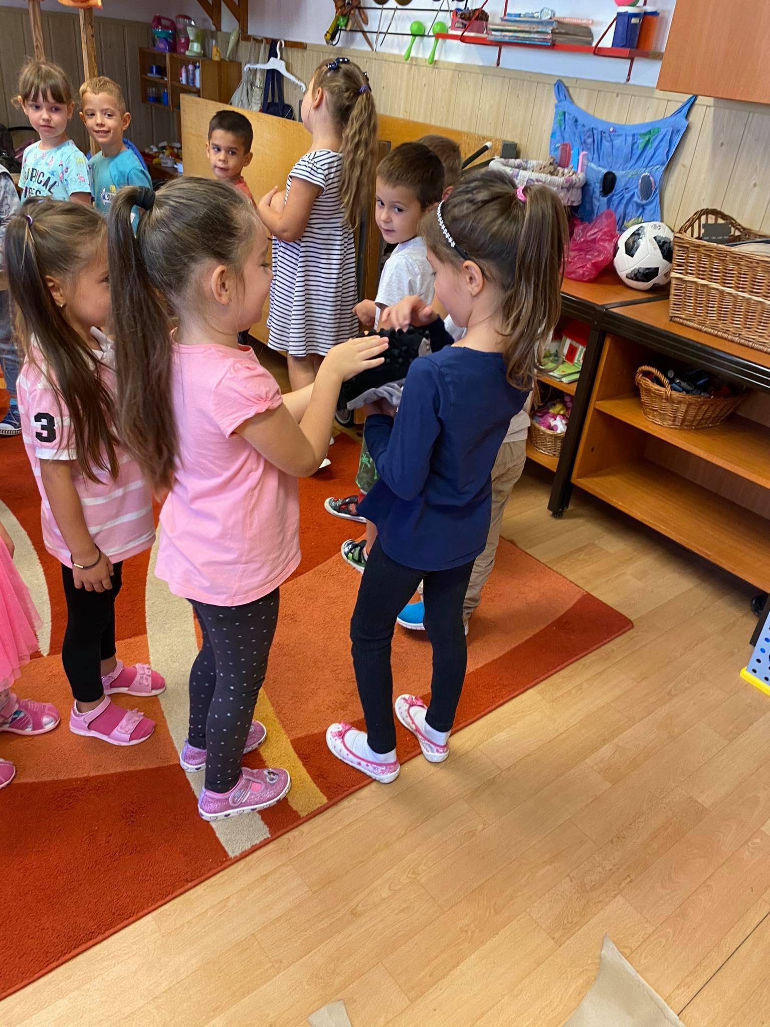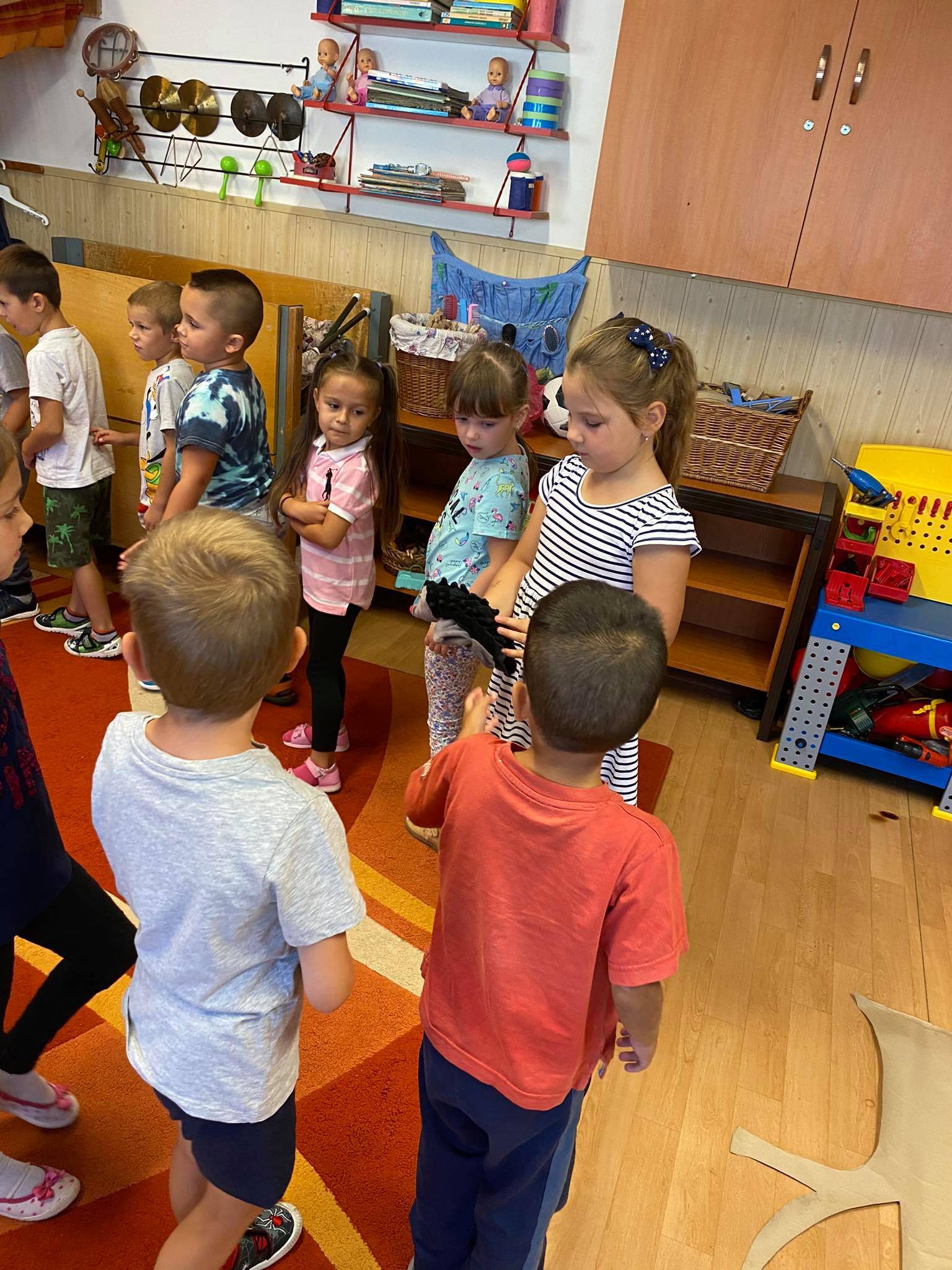 Később meglátogatta csoportunkat Sün Samu, a kis kesztyűbáb, aki nagyon megijedt a hangos zajoktól, ezért arra kértük a gyerekeket, hogy csendben, szeretettel simogassák meg a kis Samut. Relaxációs zenére körbe jártunk a csoportszobába, és kézről kézre adták a kis sünikét. Samu nagyon hálás volt nekik a sok simogatásért, és teljesen megnyugodott. Elbúcsúzott a gyerekektől, visszavonult az avarba pihenni.