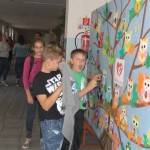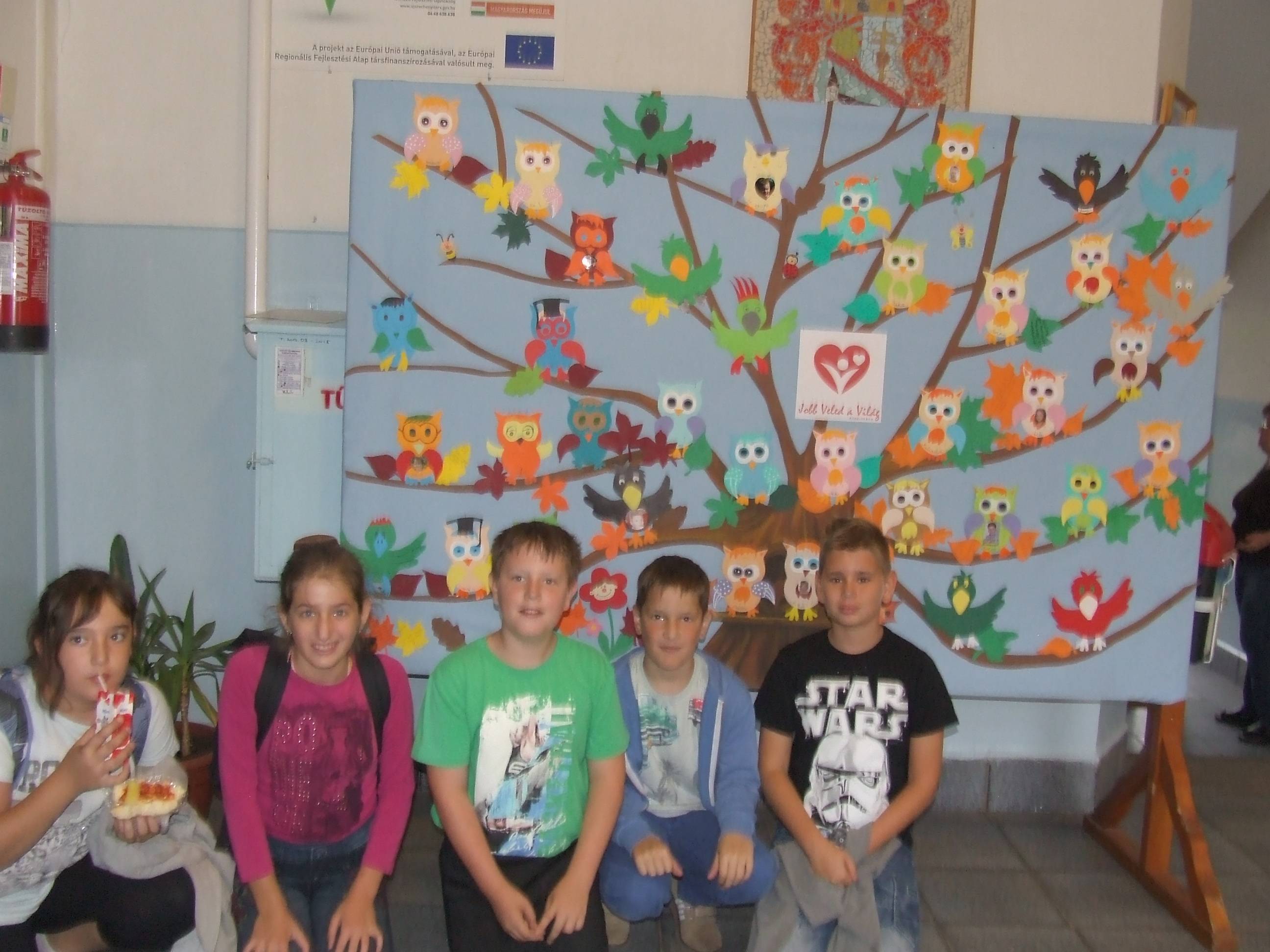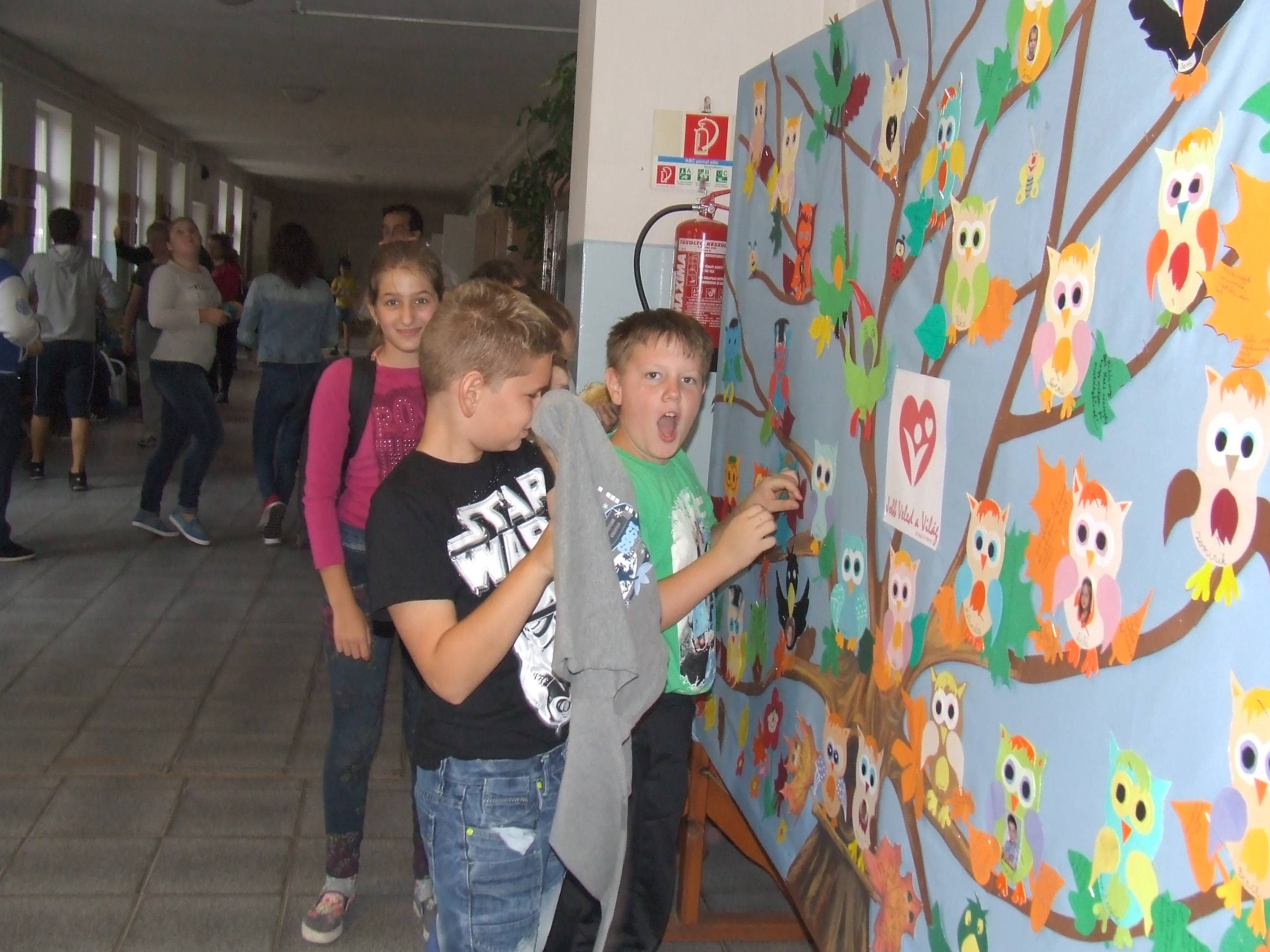A gyerekek színes papírból vágtak ki két-két levelet, mindkettőre egy-egy hála üzenetet írtak. Az egyiket egy osztálytársuknak (akinek a nevét egy kalapból húzták ki, így minden tanuló kapott a végén egy hálalevelet), a másikat bárkinek írhatták. Mindenki átadta a hálalevelét a társának. Az elkészült levelek végül a boldogságfal fájára kerültek, a gyerekeket szimbolizáló baglyok és madarak mellé, amit előzőleg technika és rajz órán készítettek. A gyerekek vidáman és felszabadultan mentek ki az óráról. Bízom benne, hogy ez a derű és pozitivitás a szürke hétköznapokra is megmarad.