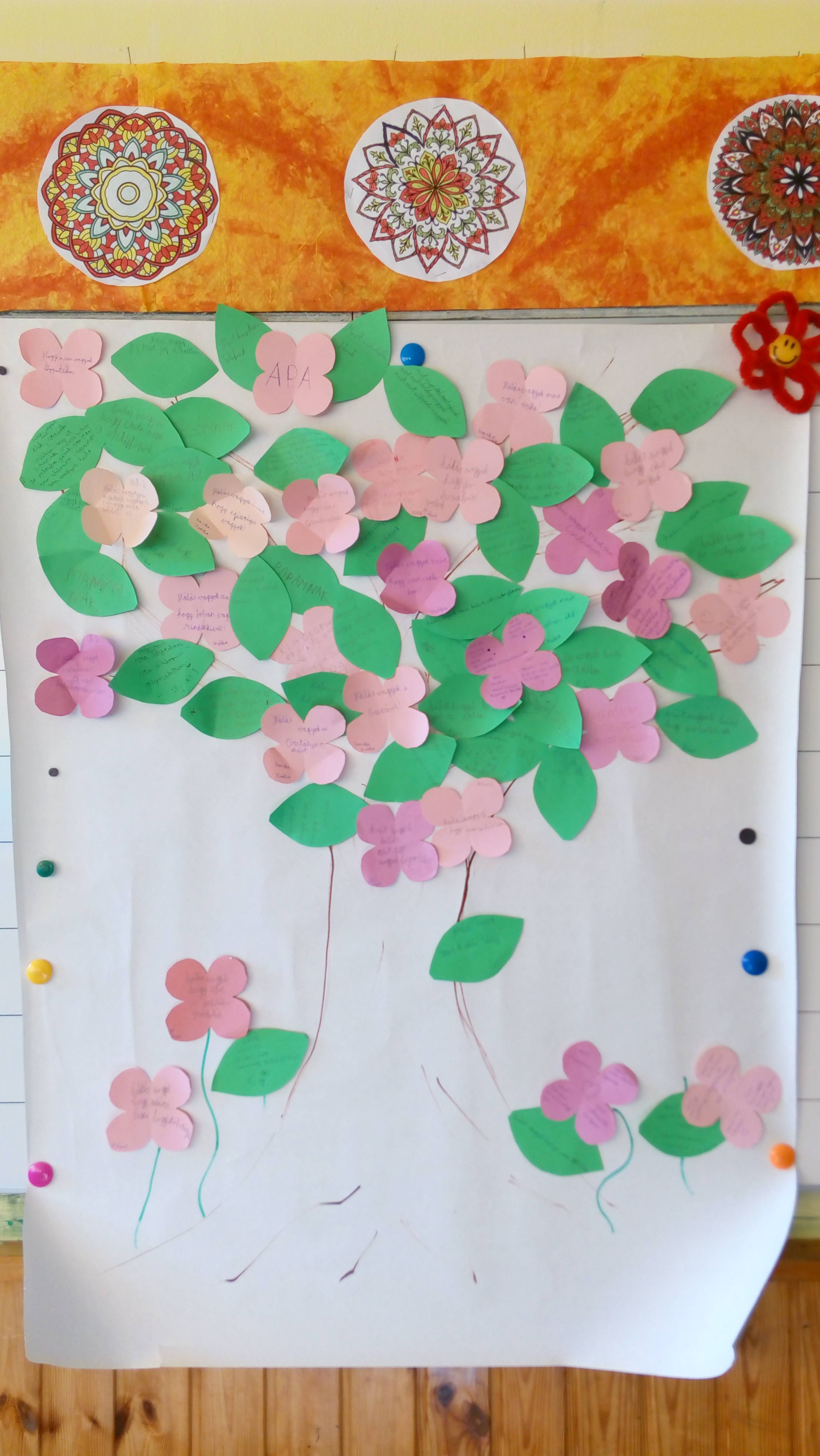 A hála témakörén belül, az egyik órán megbeszéltük és összegyűjtöttük általánosságban, hogy kinek, minek, és miért lehetünk hálásak. A következő órán, a gyerekek virágokra és levelekre írták rá, hogy ők miért, illetve kinek hálásak, amit ráragasztottak egy általam rajzolt fa körvonalaira. A végeredmény annyira megtetszett nekik, hogy az így készített plakátot délután ráragasztottuk egy nagy hullámkartonra, és azóta is ott lóg az osztálytermünkben a falon. A szülők is mindig érdeklődve olvasgatják, és találgatják, vajon melyiket írta az ő csemetéje…