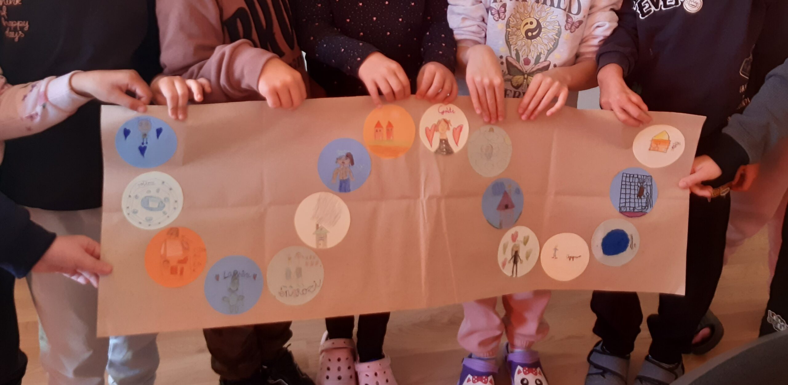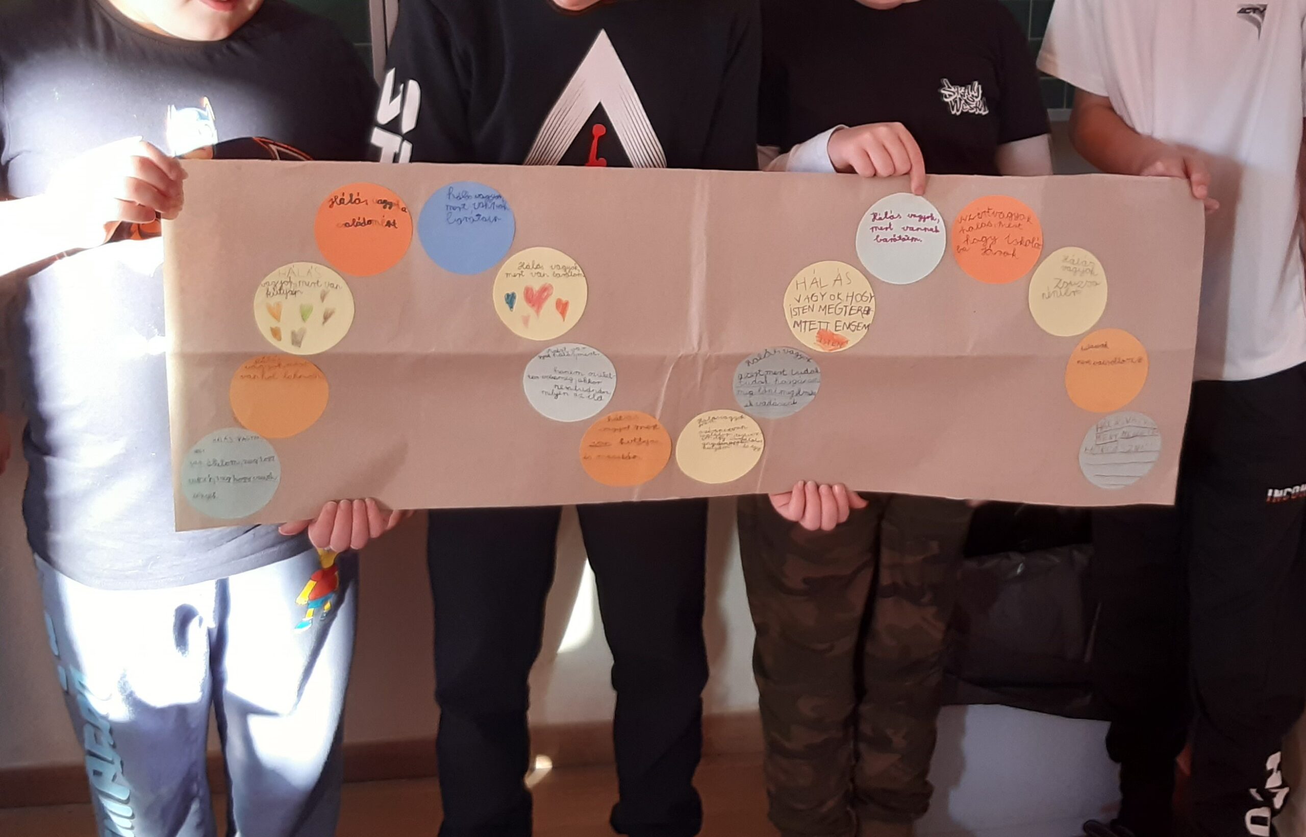 Az órát Bagdi Bella: “Szép nap, ölelj most át engem ”című dalának meghallgatásával kezdtük, majd A csodakantár c. mesét olvastam föl a gyerekeknek. Ennek kapcsán beszélgettünk arról, miért voltak a szereplők hálásak a főszereplő Jancsinak. Ezután kezdtük közösen összegyűjteni, hogy ők a mindennapokban kinek, miért lehetnek hálásak. Színes hálagyöngyöket osztottam szét, amelyekre mindenki két dolgot rajzolhatott, ill. írhatott. Így készült el osztályunk két hálagyöngysora.