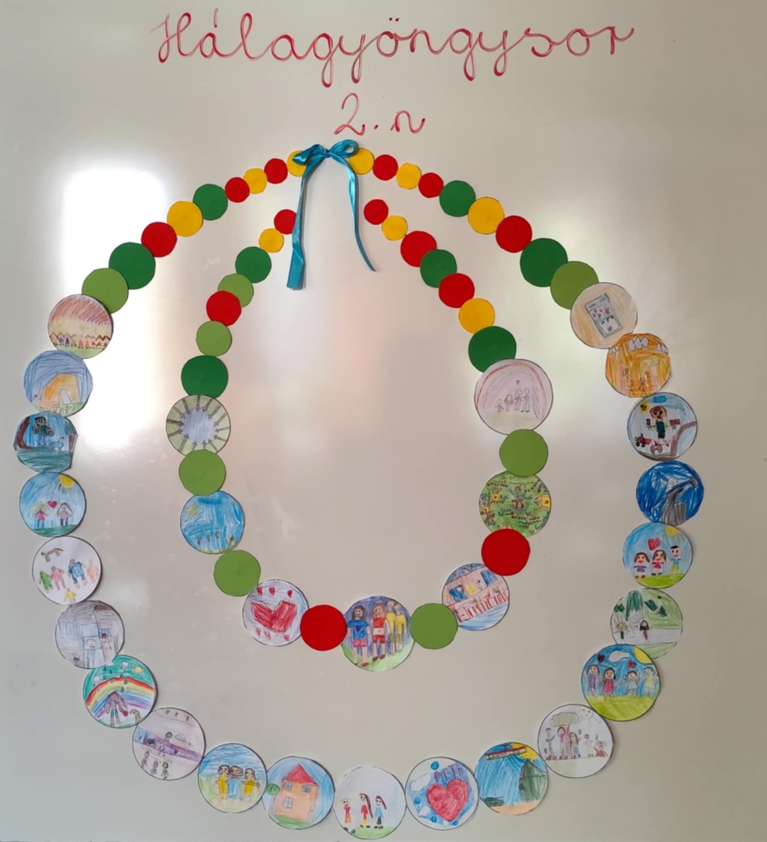 Meghallgattuk a hónap dalát, közben pedig elkészítettük az osztály HÁLAGYÖNGYSORÁT: mindenki hozzátette a számára legfontosabb gyöngyszemet.