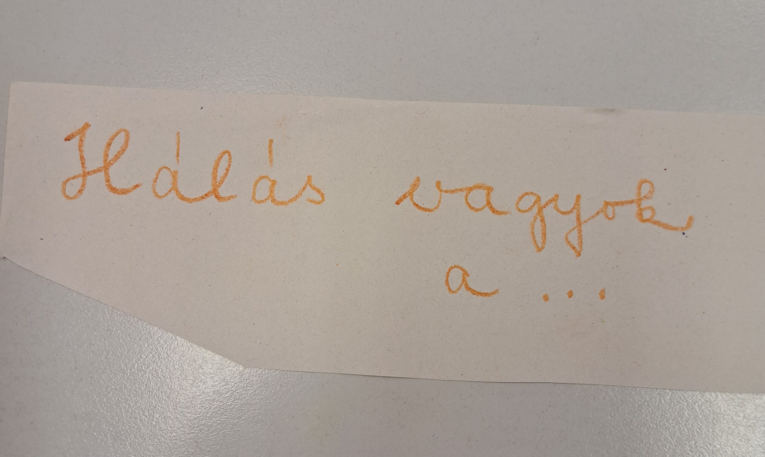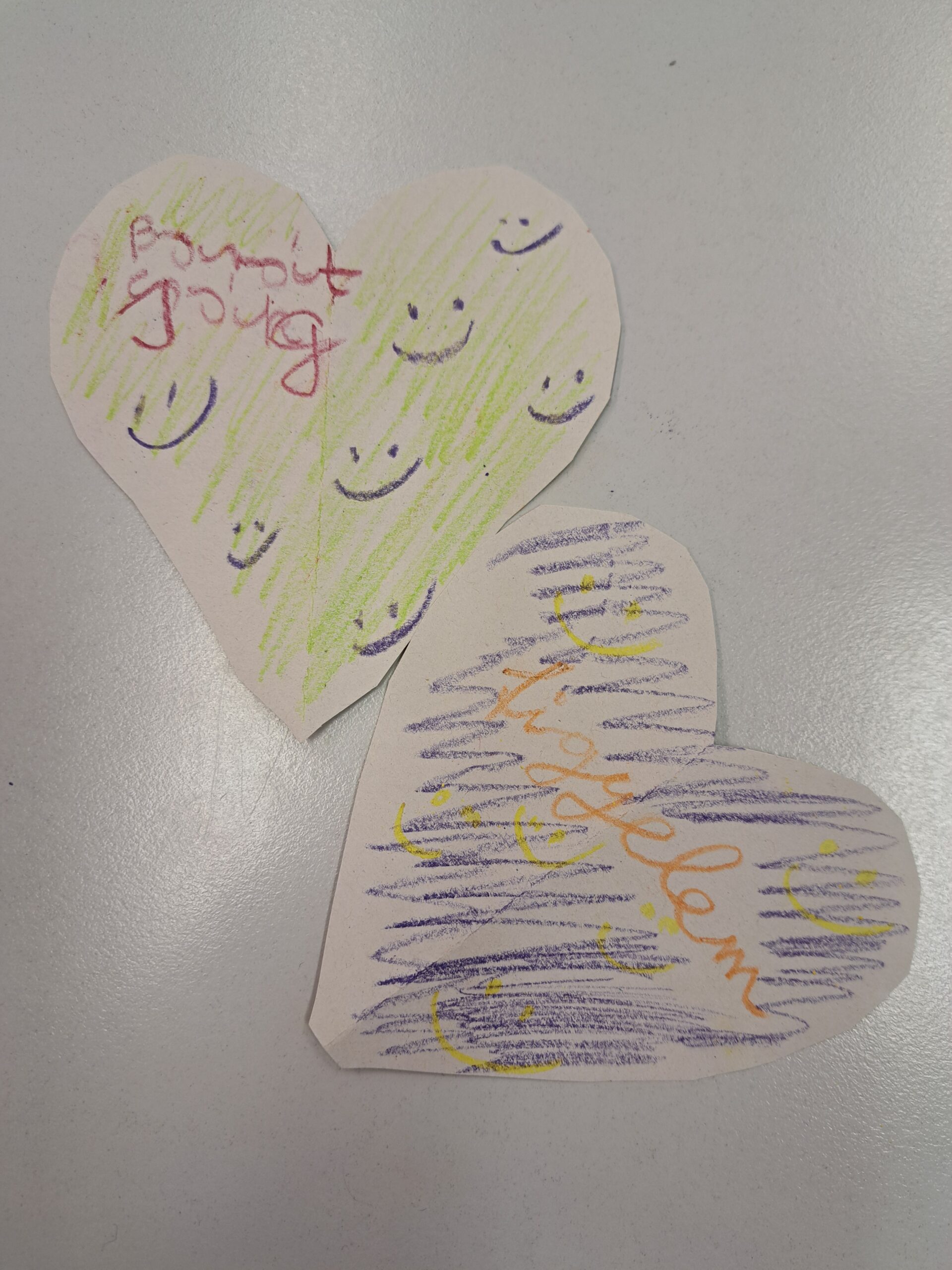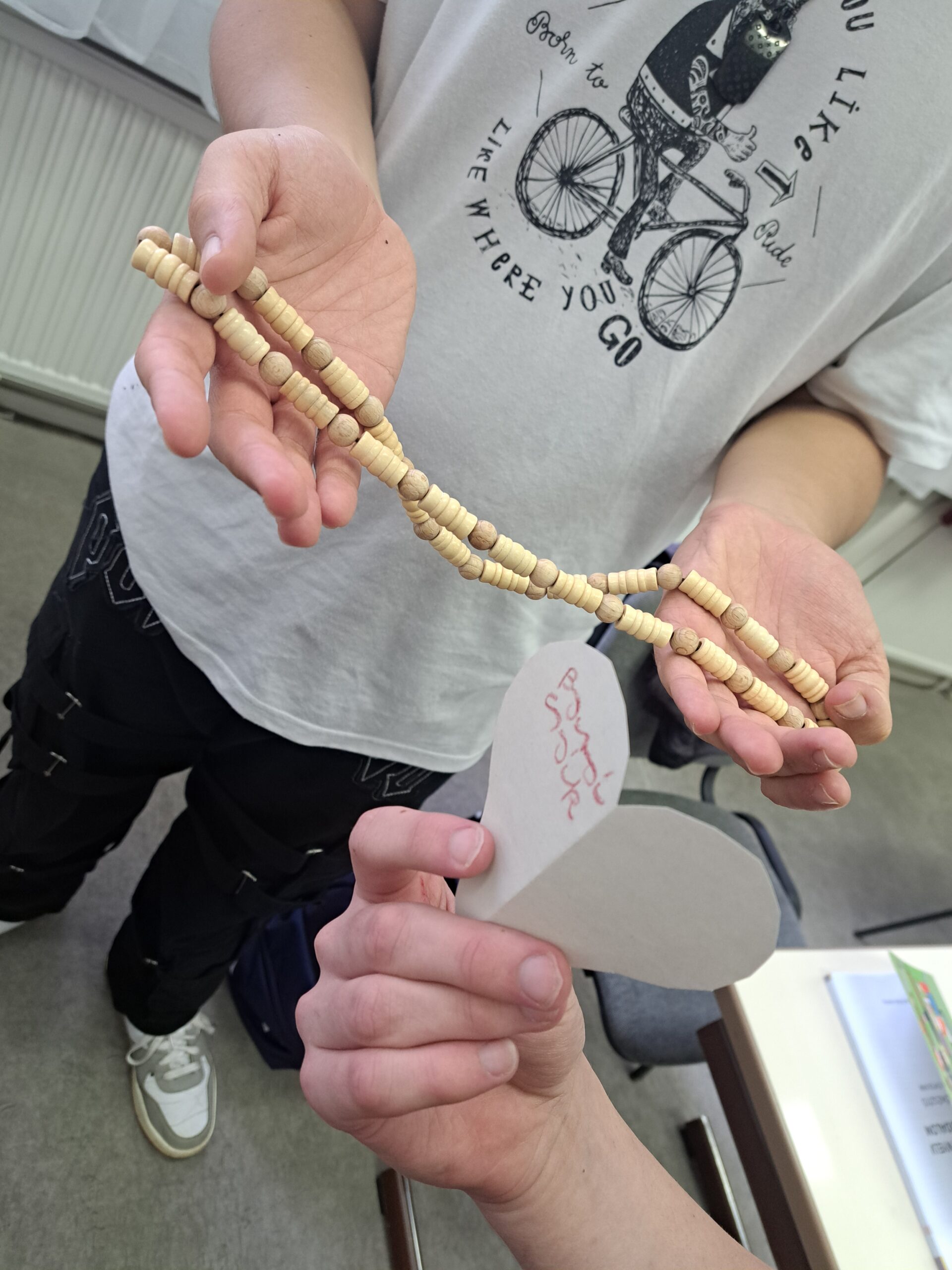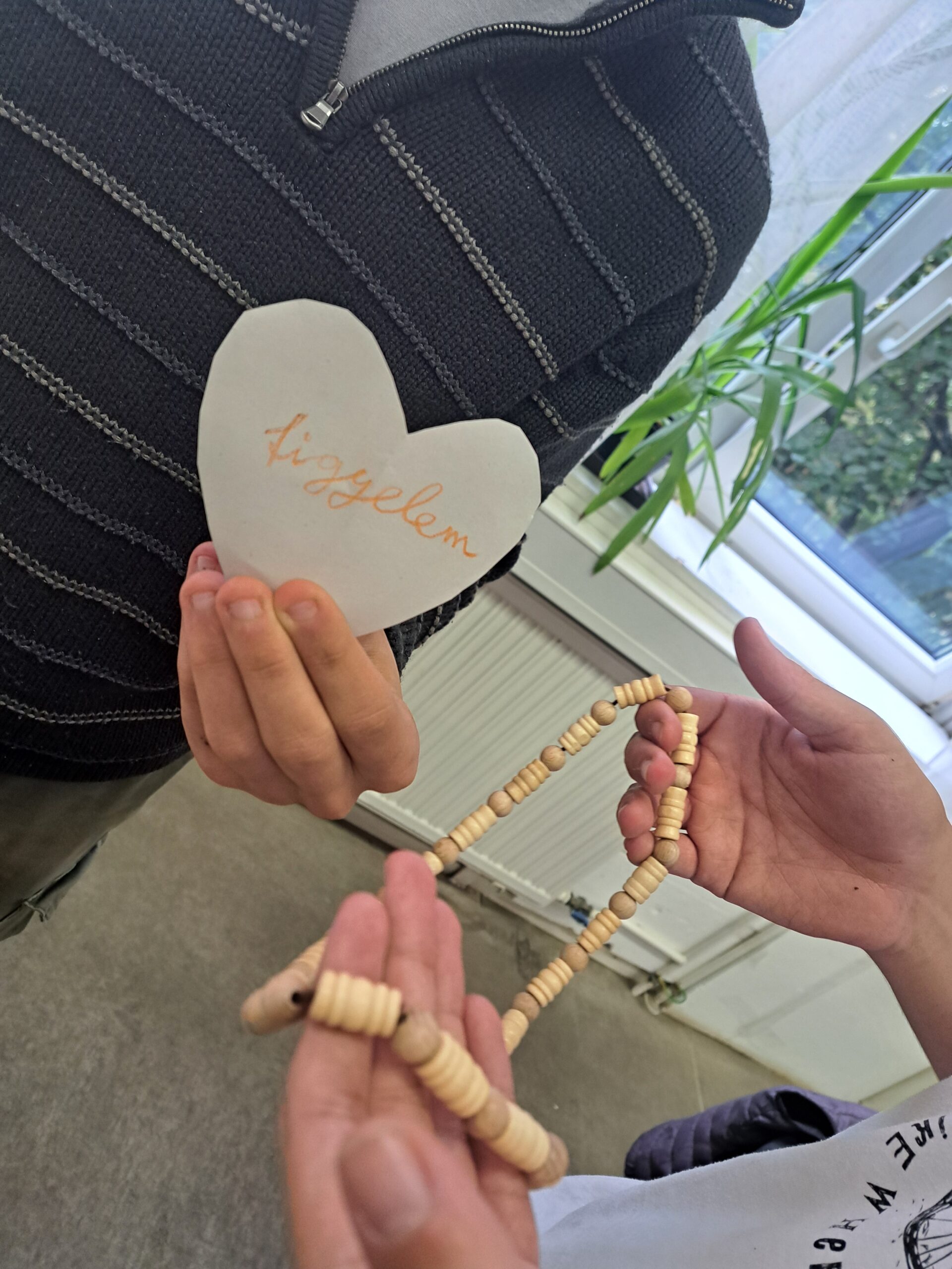 Gyöngyöt fűzni jó, közben beszélgetünk, zenét hallgatunk. Az osztályban a gyöngyfűzés után megterveztünk és megrajzoltunk egy-egy szívet, ki is színeztük. A fiatalok osztálytársaikat nevezték meg címzettnek, és amiért sokan hálát éreztek: figyelem, törődés, barátság.