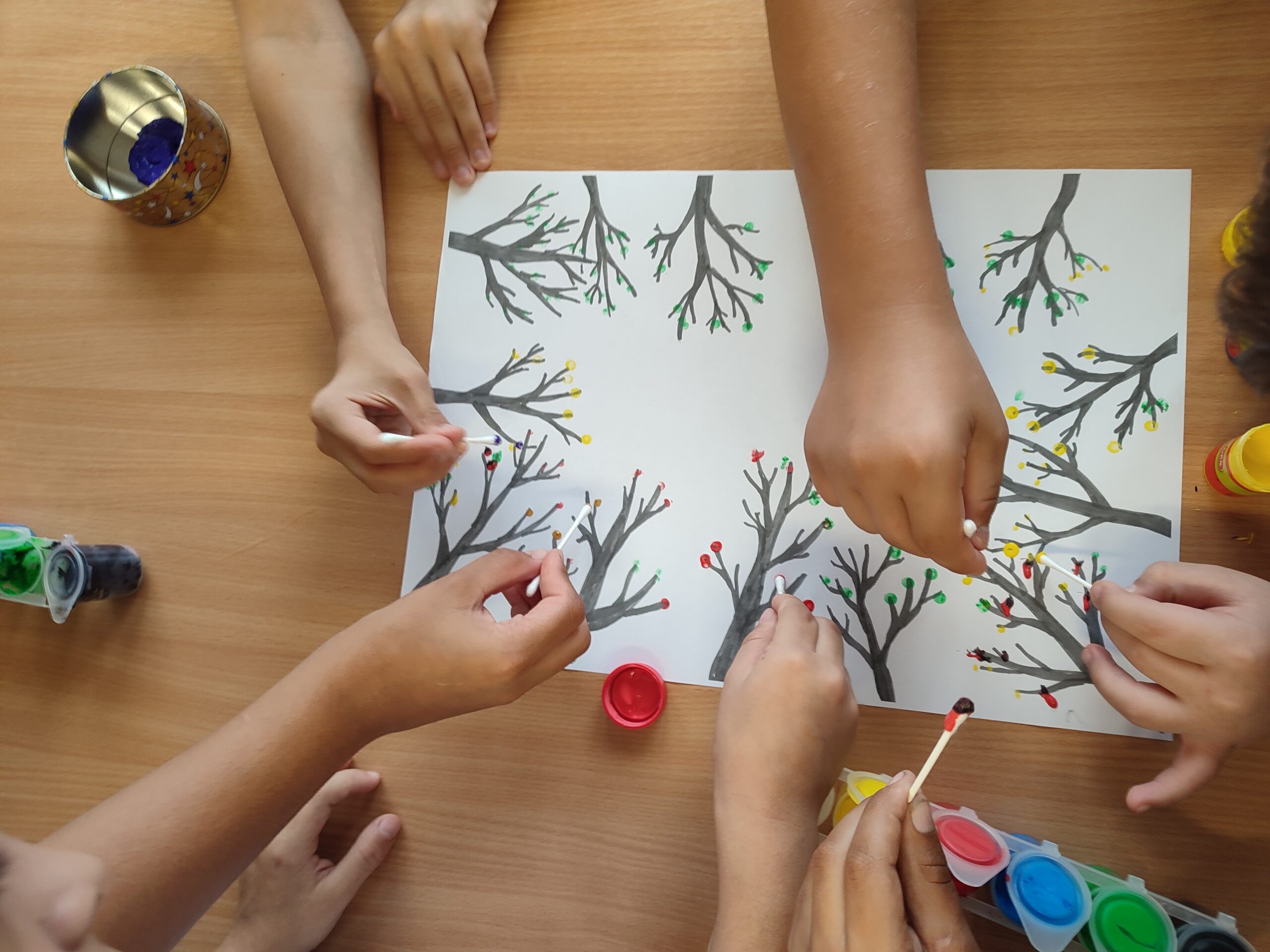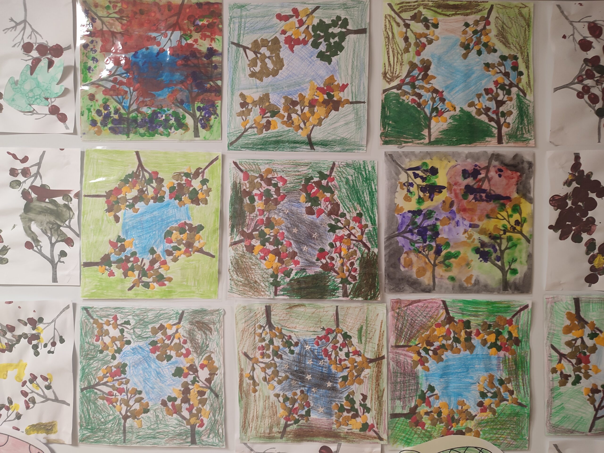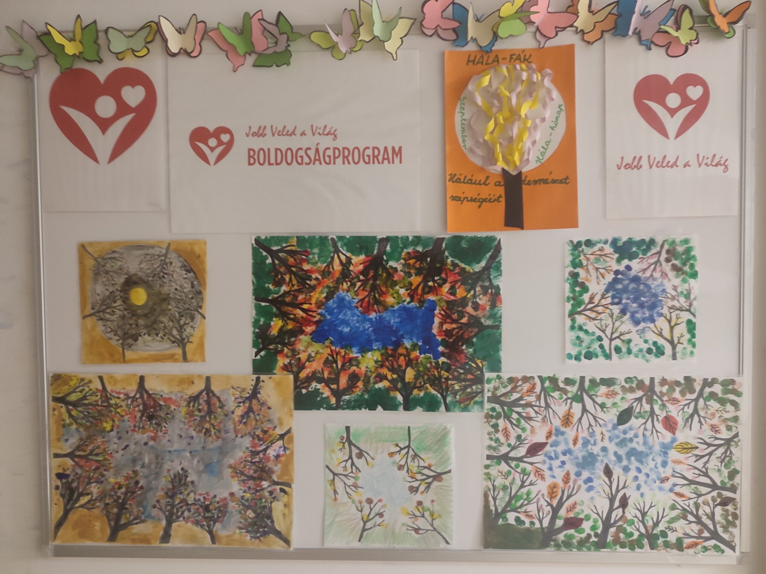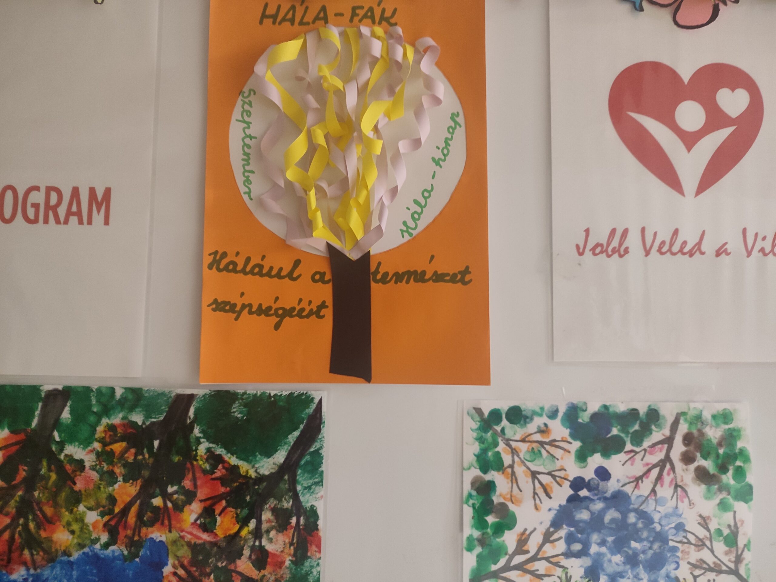 Majd ezekről beszélgetve a mese színhelyéről, az erdőkről beszélgettünk, és megalkottuk a saját hálafáinkkal teli erdőinket. Közben hálás mondatokat alkottunk a szépsége, színei, titokzatosságairól. Arról, mennyi állatnak ad biztonságot, élő helyet, élelmet. Milyen szép az erdőben kirándulni. Hálásak voltunk azért is, hogy mi a Bükk lábánál lakunk, közel van mindaz, amit festettünk.