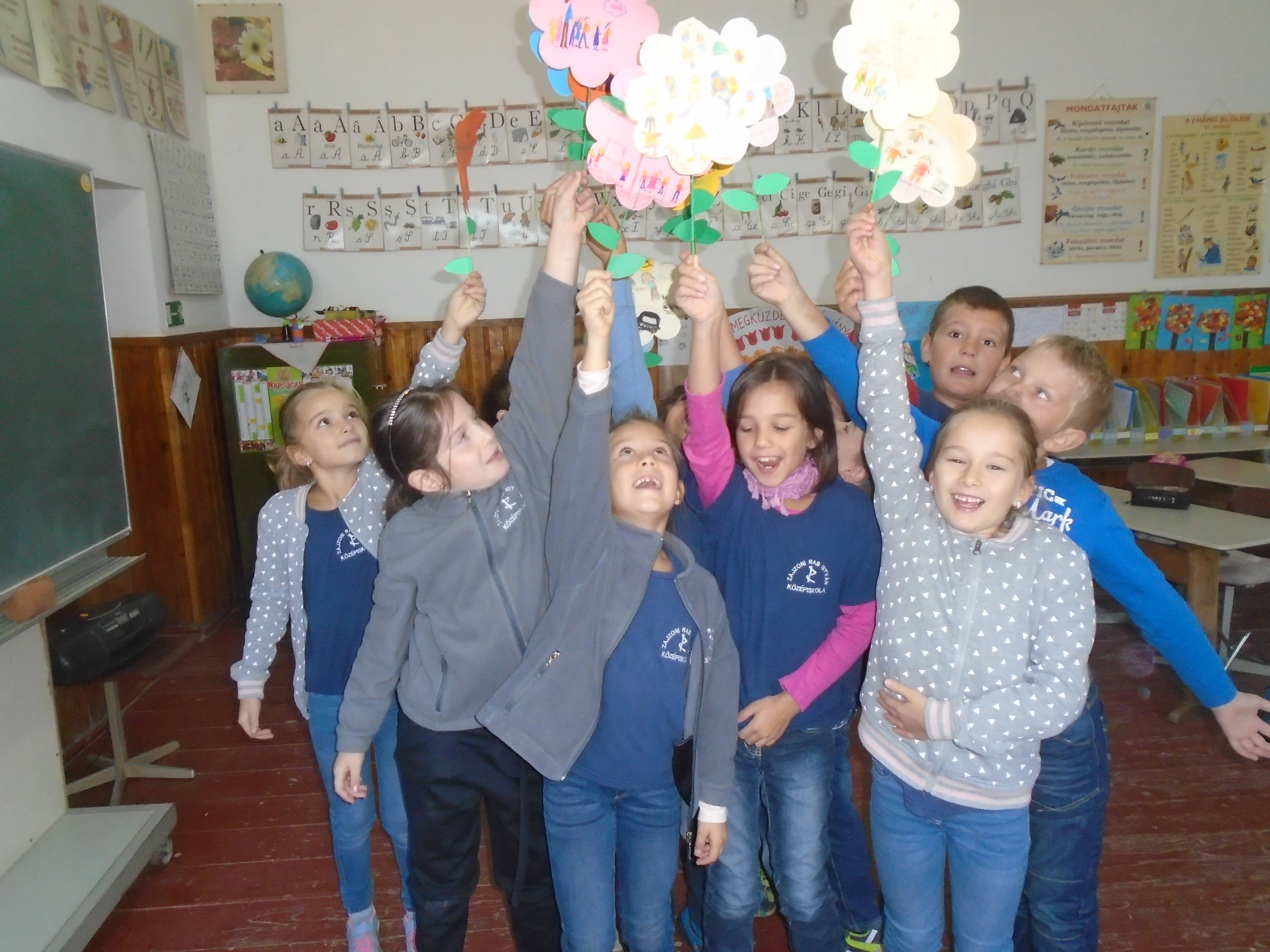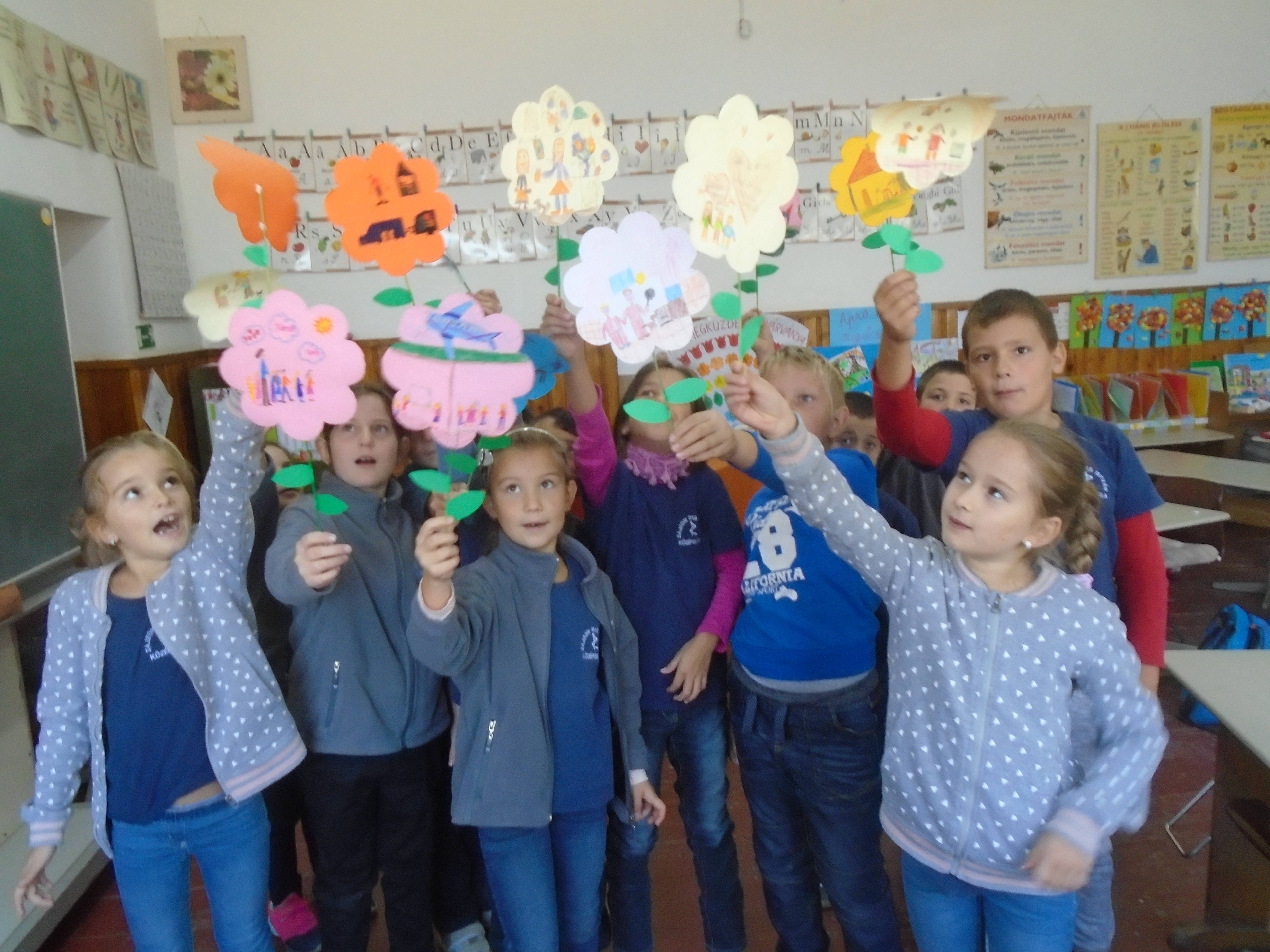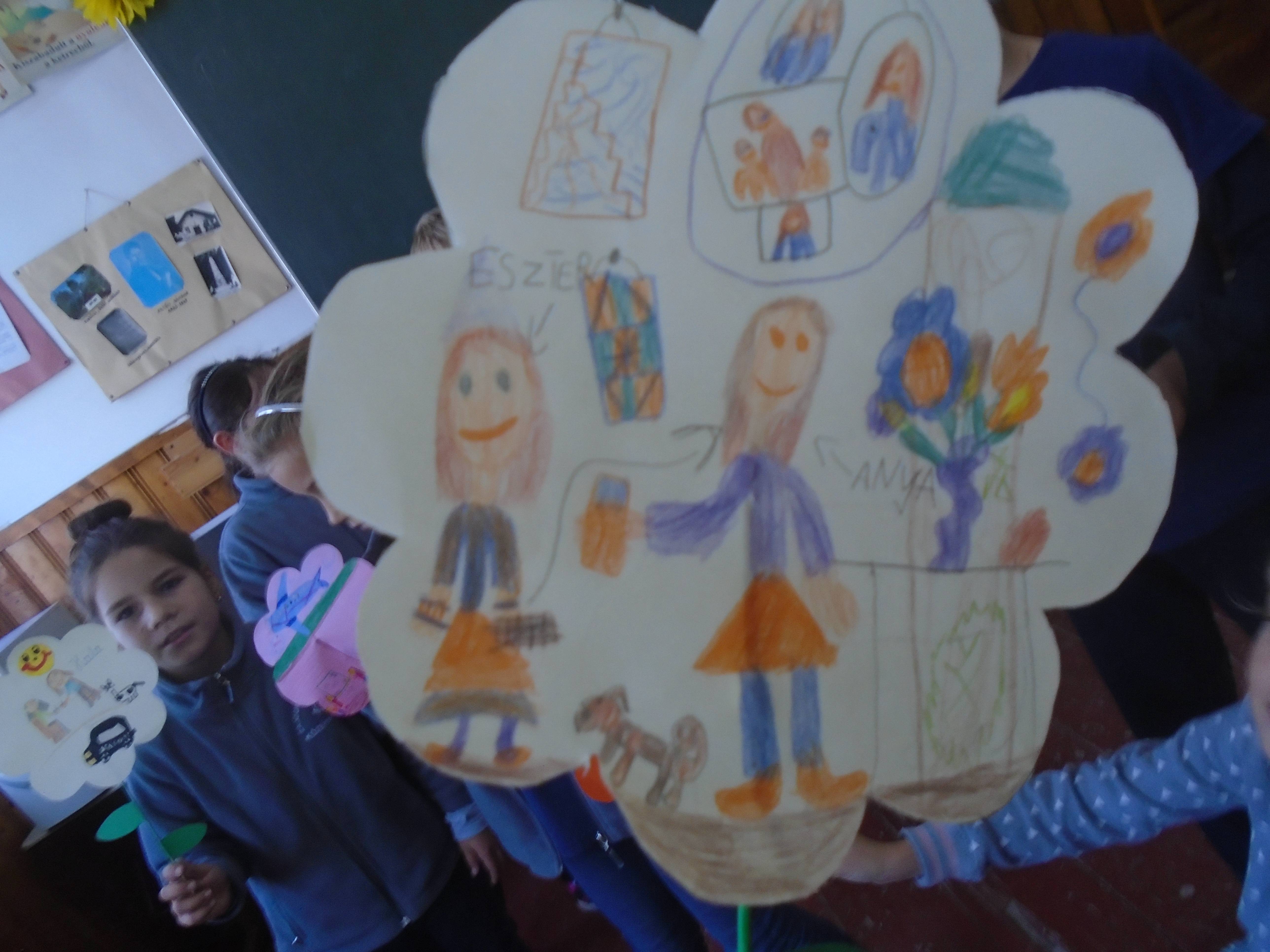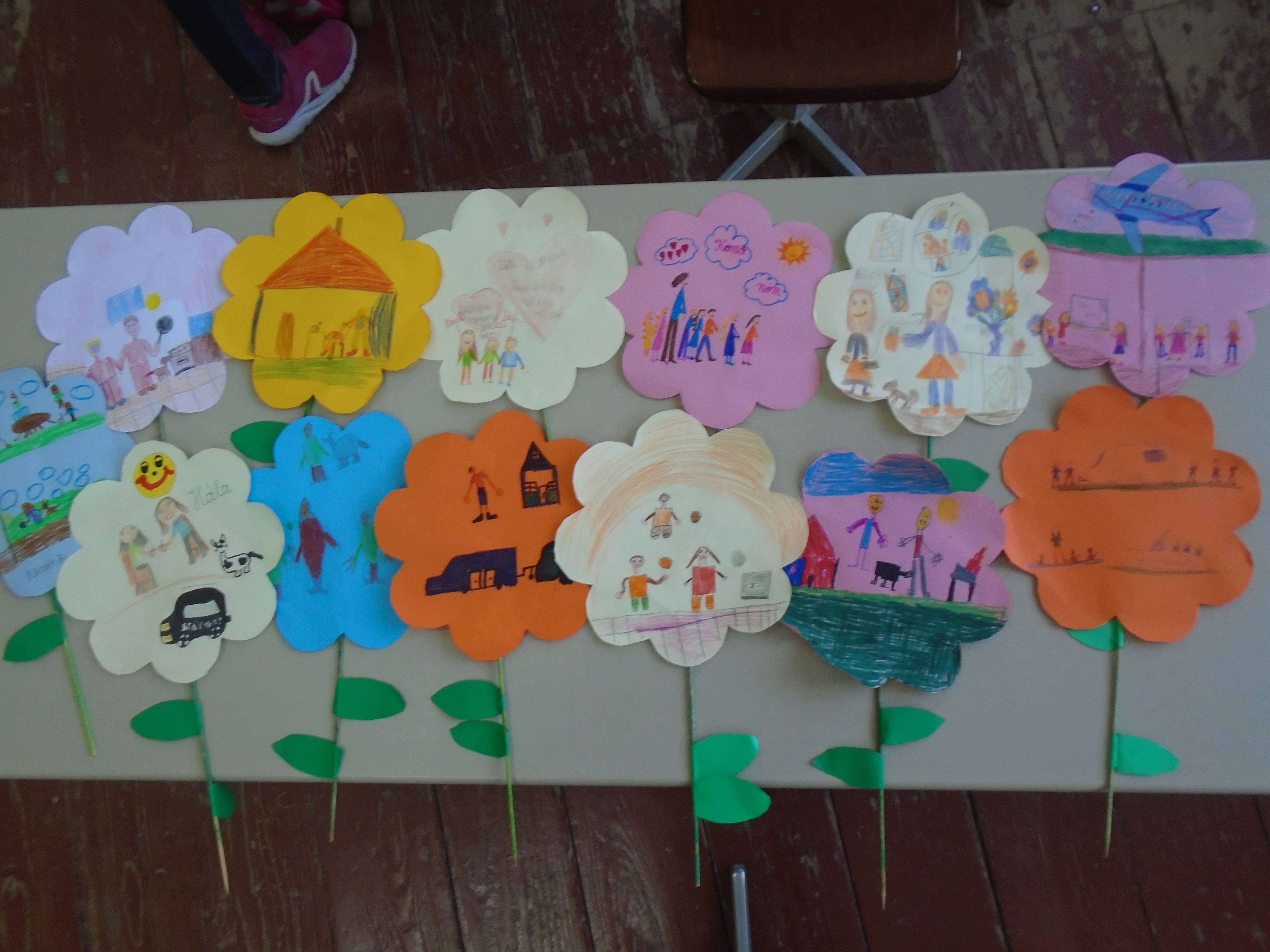 A mi hálakertünk tele van vidám gyerekekkel és színes virágokkal. A virágokon a rajzok azt jelképezik, hogy hálásak vagyunk anyukának, apukának, a testvéreknek, a nagyszülőknek, a tanító néninek, az osztálytársaknak, a barátoknak, de még a kutyusunknak és a cicánknak is. Milyen jó, hogy vannak ők nekünk!