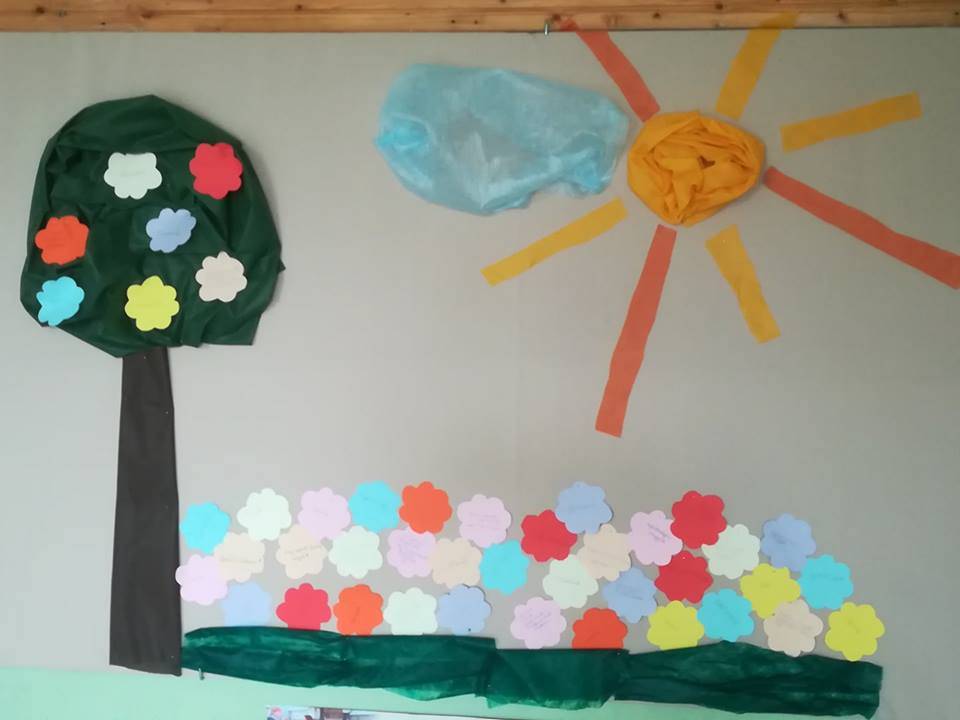 Osztályunk faliújságját díszíti a hálakertünk, ahol a kis virágokra írták rá a gyerekek, miért hálásak.