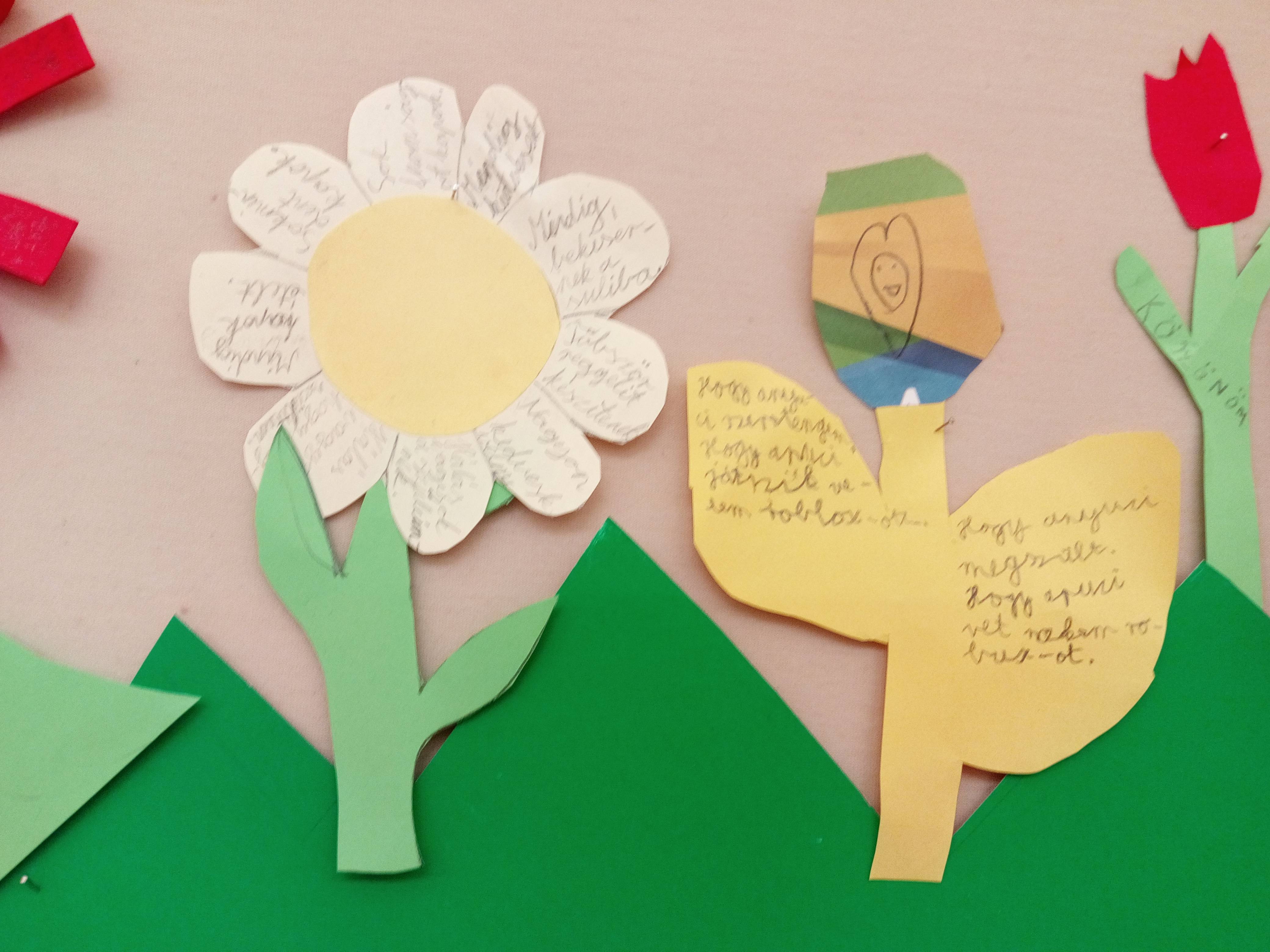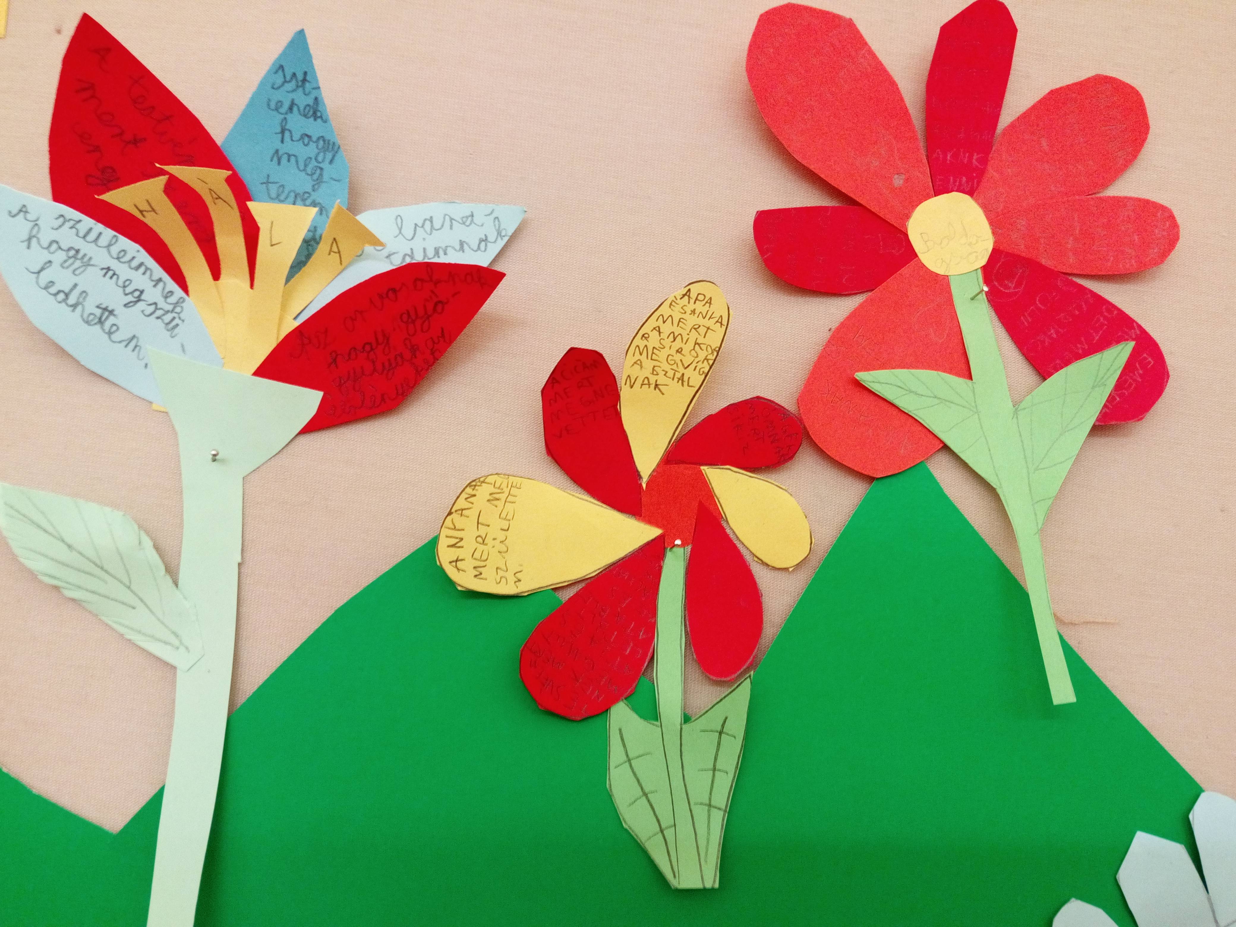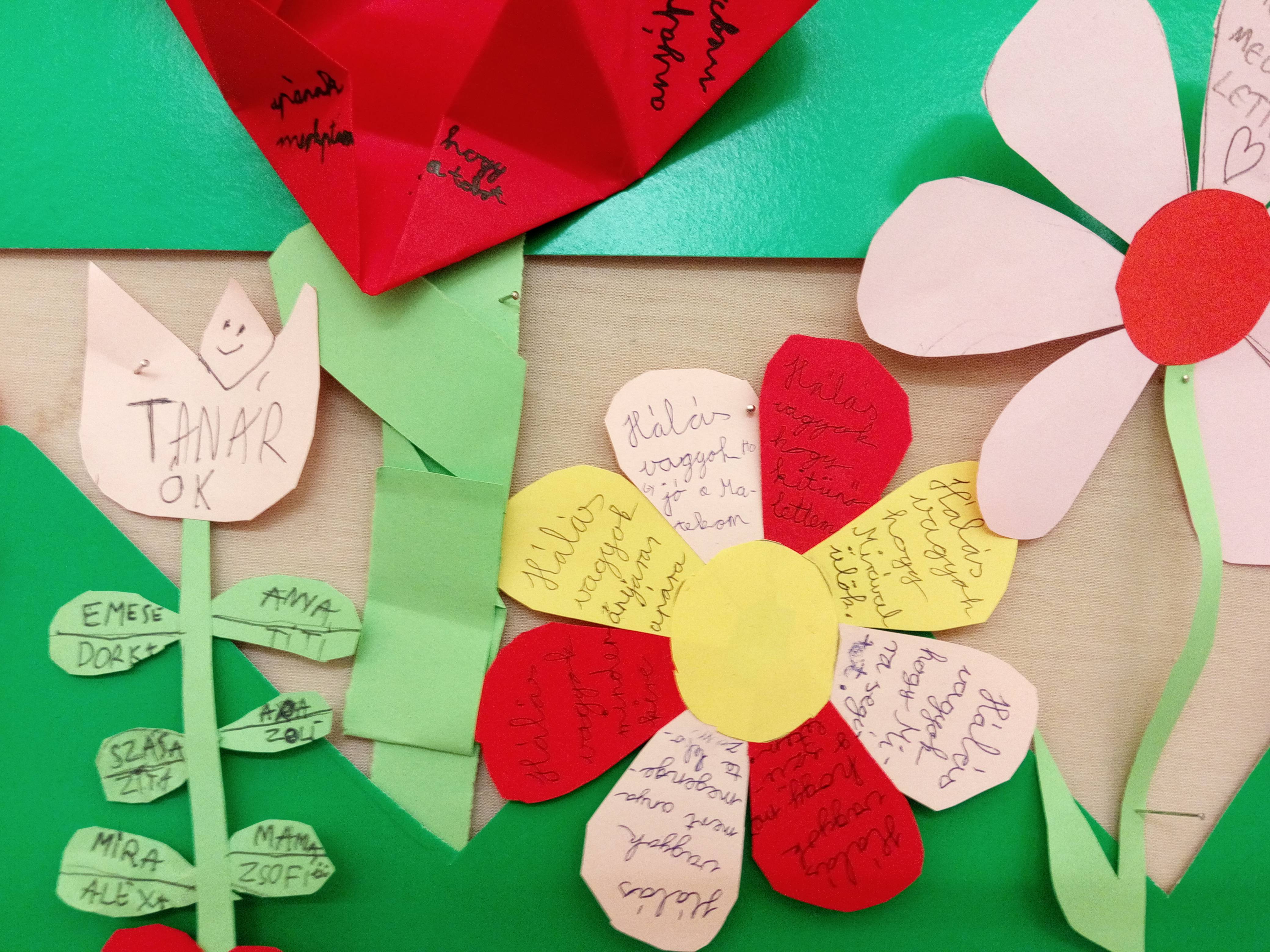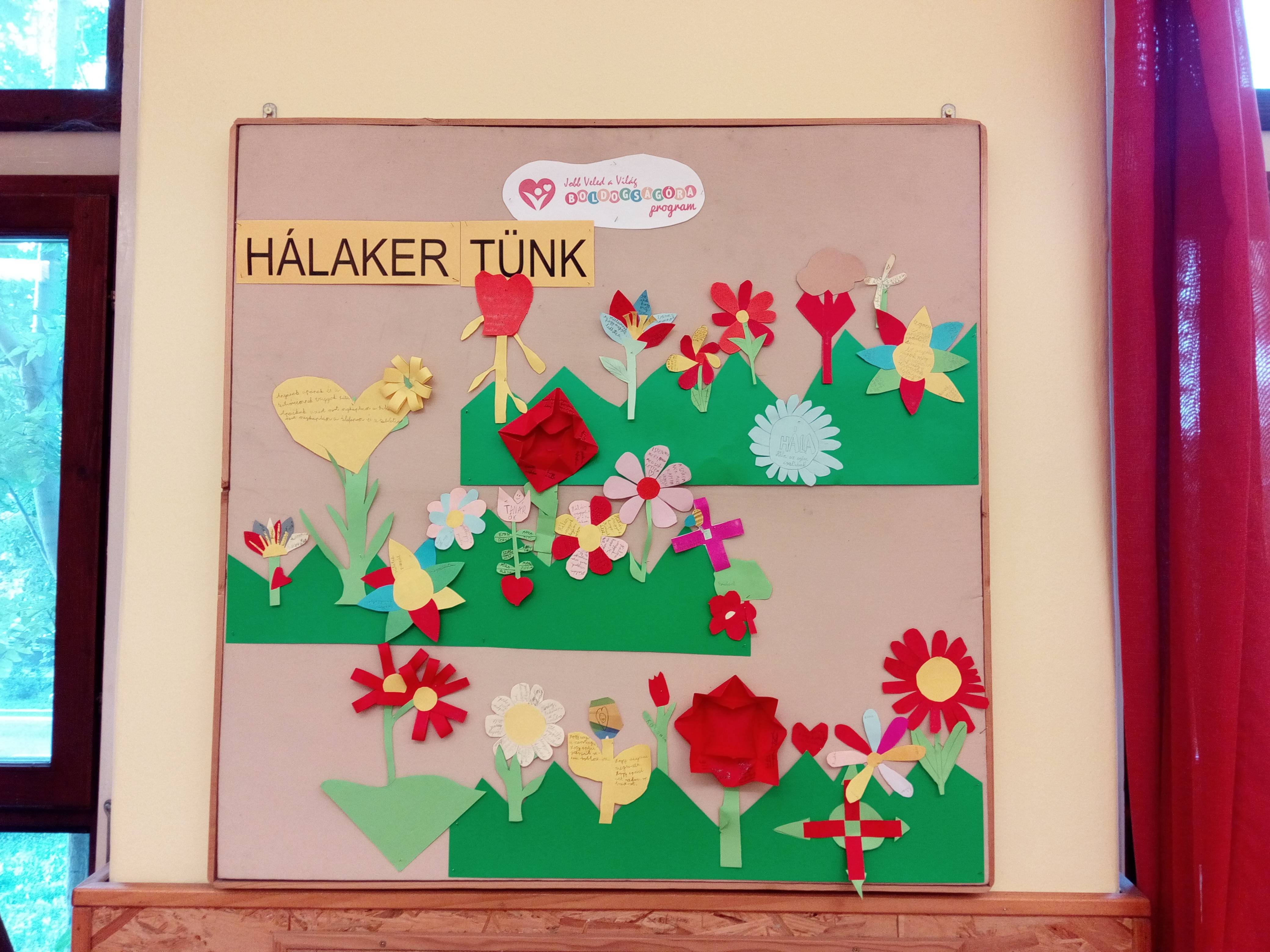 Sokat beszélgettünk arról, hogy kinek miért lehetünk/vagyunk hálásak. Végül elkészítettük hálavirágainkat, melyek szirmaira mindenki a saját háláit írta. A hálakertünk egész évben termünket fogja díszíteni.