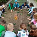 A jó időt kihasználva sok időt töltöttünk a szabadban. Eper, saláta palántákat ültettünk, őszi termésbábokat készítettünk, levelest gereblyéztünk. A munka előtt mondókáztunk, verseltünk, énekeltünk, tornáztunk a friss levegőn. Dolgunk befejeztével jóízűen fogyasztottuk el a kerti kiülőnkben tízóraira felkínált gyümölcsöket.