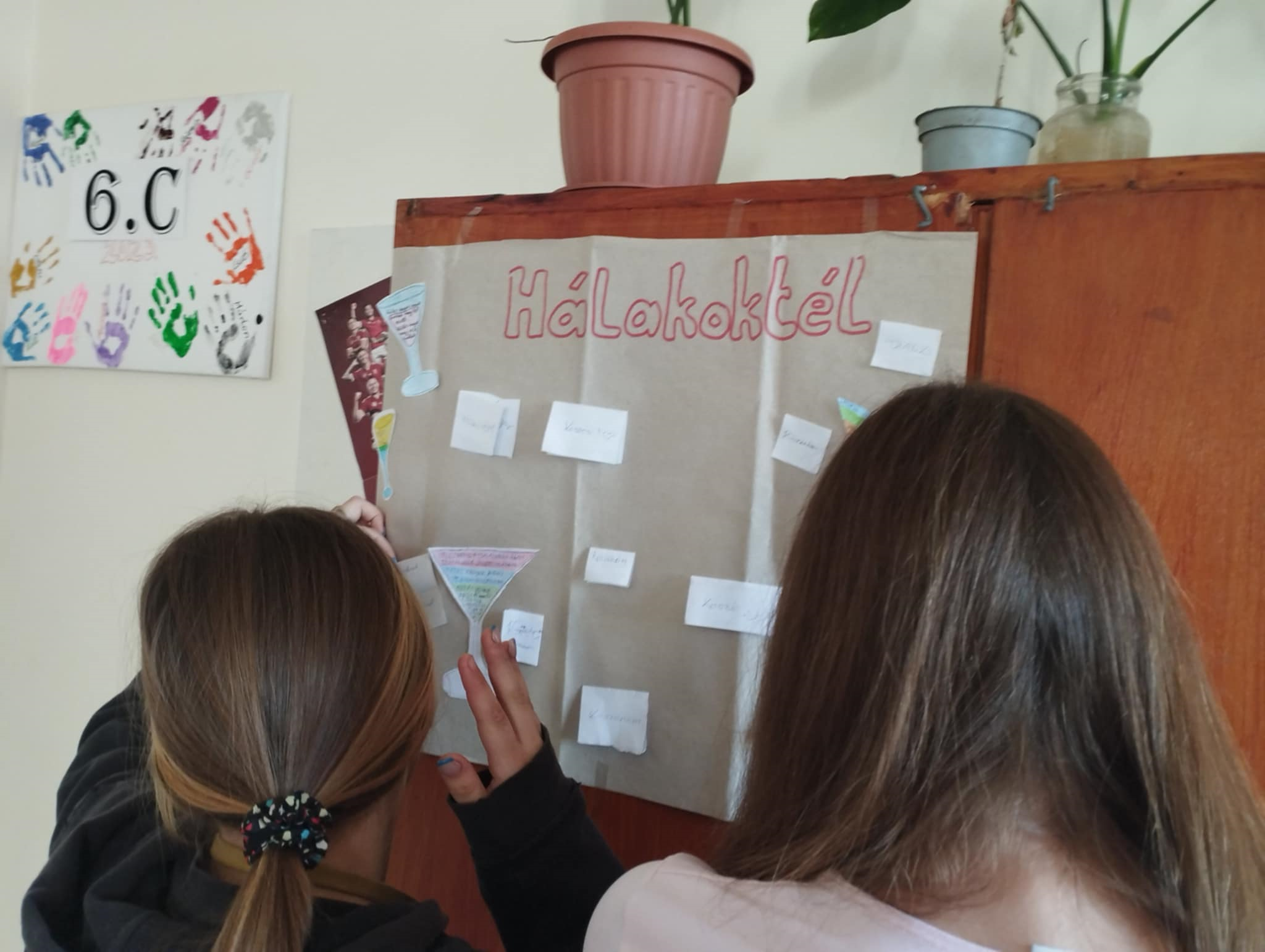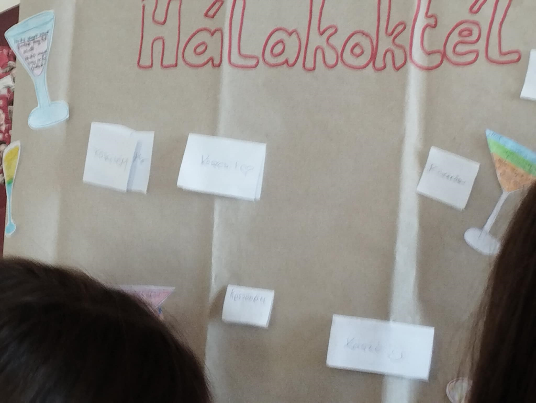 Ezután „Hálakoktél” címmel egy plakátkészítő tevékenységet végeztünk. Minden tanuló „összetevőket” írt fel egy koktélpohárba: olyan dolgokat, embereket, élményeket, amelyekért hálás. A poharak színes elemekből, „hozzávalókból” álltak – például „család”, „barátok”, „egészség”, „zene”, „nevetés”, „kutya”, „tanár”, stb.
