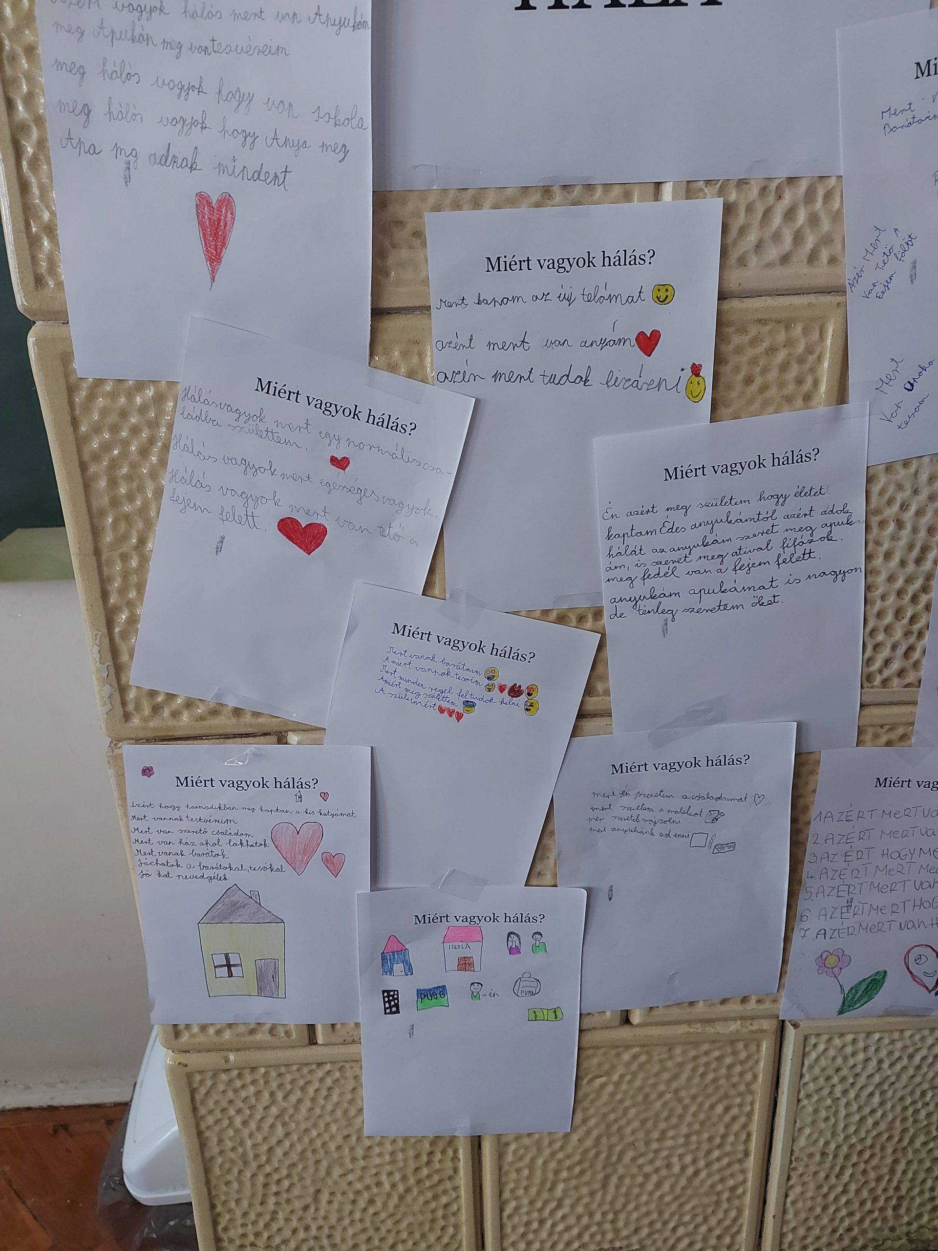 Az ötödik osztályban a háláról szóló boldogságórát a felsősöknek szánt dal meghallgatásával kezdtük. A tanulók behunyták a szemüket, csak a dalra koncentráltak. A végén összegyűjtöttük a kulcsszavakat és mindenki megfogalmazta magának, hogy miért érez hálát. A videó megtekintése tovább bővítette a témához való eddigi hozzáállásukat, mivel az anyagi javakon túl hétköznapi, magától értetődő értékek is szóba kerültek (család, barátok, egészség stb.). Végezetül minden diák összegyűjtötte gondolatait írásban egy saját „hálalapon”. Ezeket névtelenül kihelyeztük a faliújságra. A hónap többi részében a tanulók szabadon olvashatják mások gondolatait, ezzel is bővítve látásmódjukat.