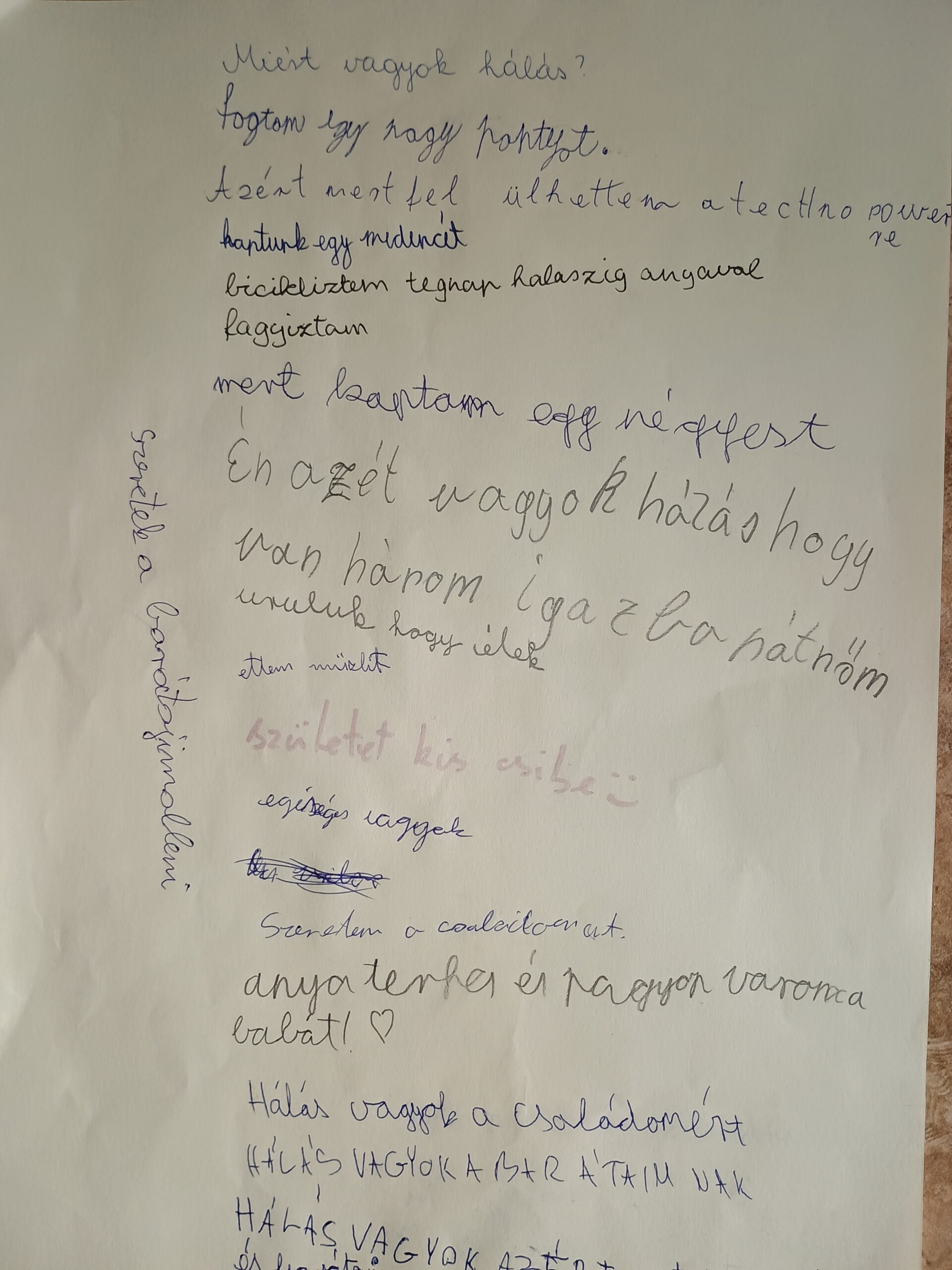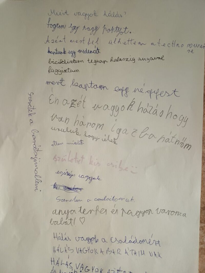 Ezután meghallgattuk a „Jól érzem magam” Bagdi Bella dalt. Végül arra kértem a gyerekeket, hogy válasszanak az óra elején leírt dolgok közül egyet, és egy színes lapra írják le mindannyian, hogy ők miért hálásak. Ezzel elkészítettük az osztály közös hála lapját.