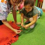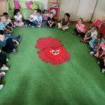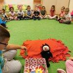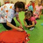 Elsőként a párnát középre tettem, a gyerekek jeleit pedig egy katicás dobozba rejtettem, majd a témára hangolódás érdekében meghallgattuk a hónap dalát. Egy rövid, kitalált, tanító jellegű történetet meséltem el a gyerekeknek, amiben egy kislány és egy szegény bácsi barátságot kötnek és kölcsönösen segítenek egymáson. A kislány meleg teával, süteménnyel kínálja a hidegben átfázott bácsit, ő pedig hálája jeléül egy szívecskés medált ajándékoz a kislánynak. A gyerekek közül néhány elmondták, hogy találkoztak már szegény emberekkel, családdal és a szüleik pénzt vagy a kinőtt gyerek ruhákat adták oda. Ennek kapcsán megbeszéltük, hogy bizony hálásak lehetünk szüleinknek, hogy felnevelnek minket, hogy van mit felvennünk, van mit ennünk és, hogy egészségesek vagyunk. Tudunk szaladgálni, énekelni, beszélni. Okos gondolatokkal színesítették a foglalkozást: -„Hálás vagyok, hogy anyukám ebbe az óvodába íratott be!”- „Hálás vagyok, hogy van itt az oviban sok szép játékunk!” -„Hálás vagyok, hogy van sok barátom!” – „Hálás vagyok, hogy a doktorbácsi azt mondta anyának, minden rendben a kisbabával a pocakjában!”