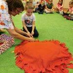 Ezután elmeséltem a gyerekeknek, hogy milyen fontos, hogy minden este hálás szívvel feküdjünk le, hogy ne legyen bennünk harag, félelem. A katicás dobozt kinyitva megmutattam, hogy a jeleiket rejti, és hogy közösen elkészítjük a Katicák Hálapárnáját. A párnát csomózás technikájával készítettük, és a gyerekek egyesével jöhettek a jelüket is rákötni. Megkértem a gyerekeket válasszák következőnek azt, aki a szívükhöz közel áll és egy öleléssel fejezzék ki hálájukat felé. Bárhova helyezhették a nagy párnán a jelüket, érdekes volt megfigyelni, hogy a barátok valóban egymás mellé akasztották. Nem feledkeztünk meg a beteg társakról sem, az ő jelüket is együtt elhelyeztük. Végül mindenki megölelhette a barátait és még egyszer meghallgattuk Bagdi Bella – Hálás vagyok című dalát. A tevékenység zárásaként mindenki megfoghatta, magához ölelhette a Hálapárnánkat, ami végül a kanapén kapott helyet. Nagy becsben tartjuk. Másnap kipróbáltuk a Hálajátékot, amit kértek, hogy máskor is játsszunk majd el.
