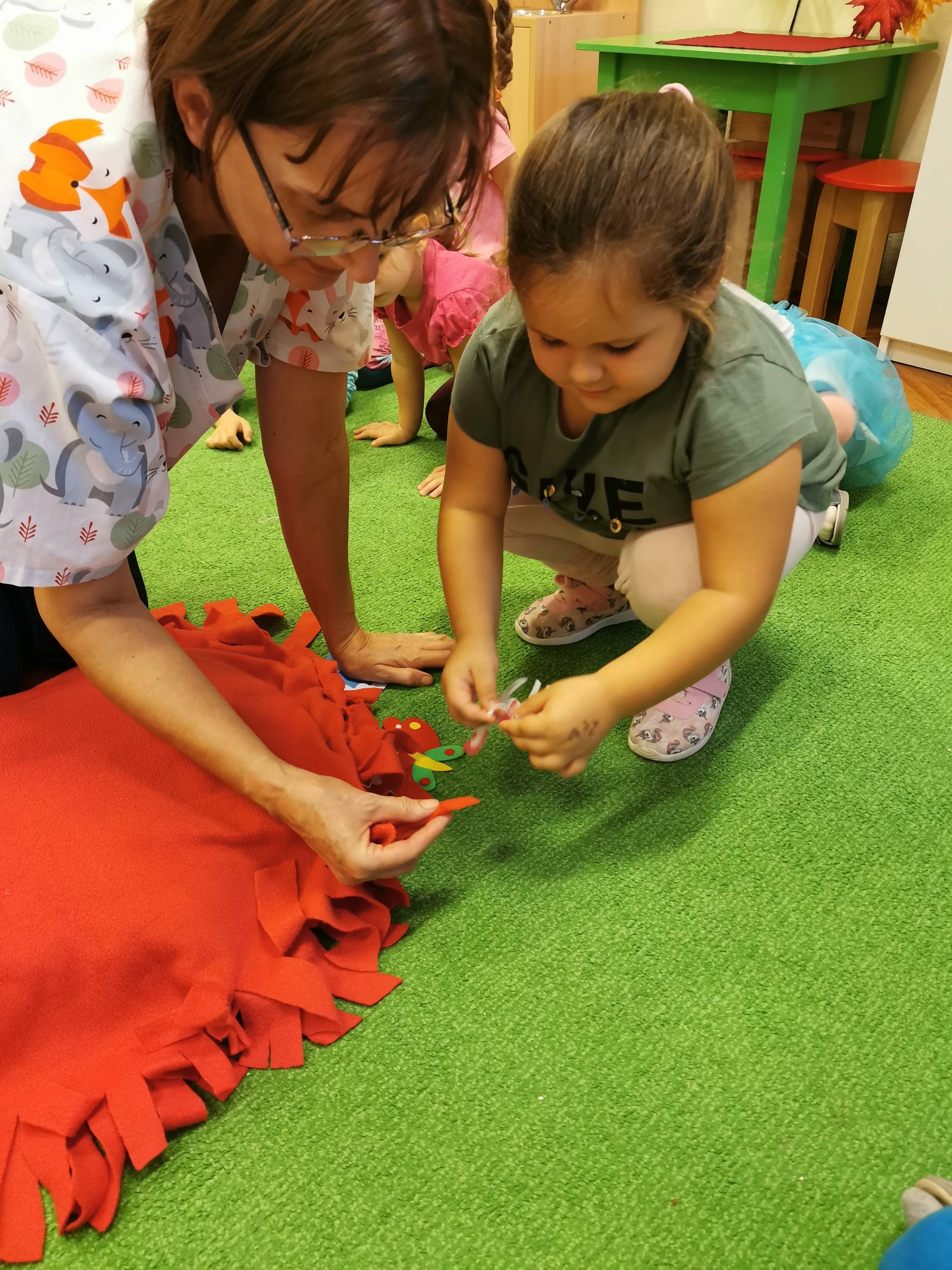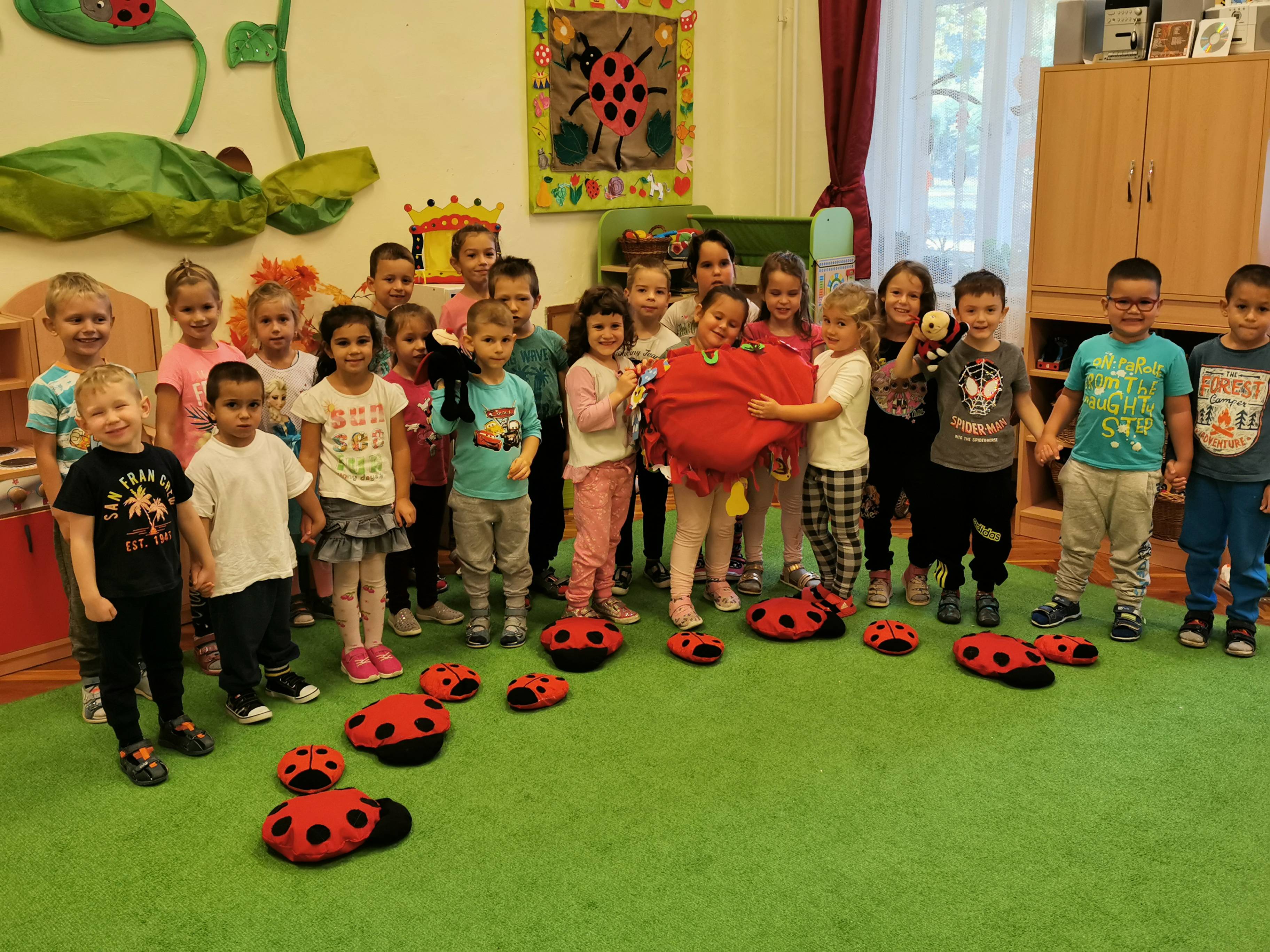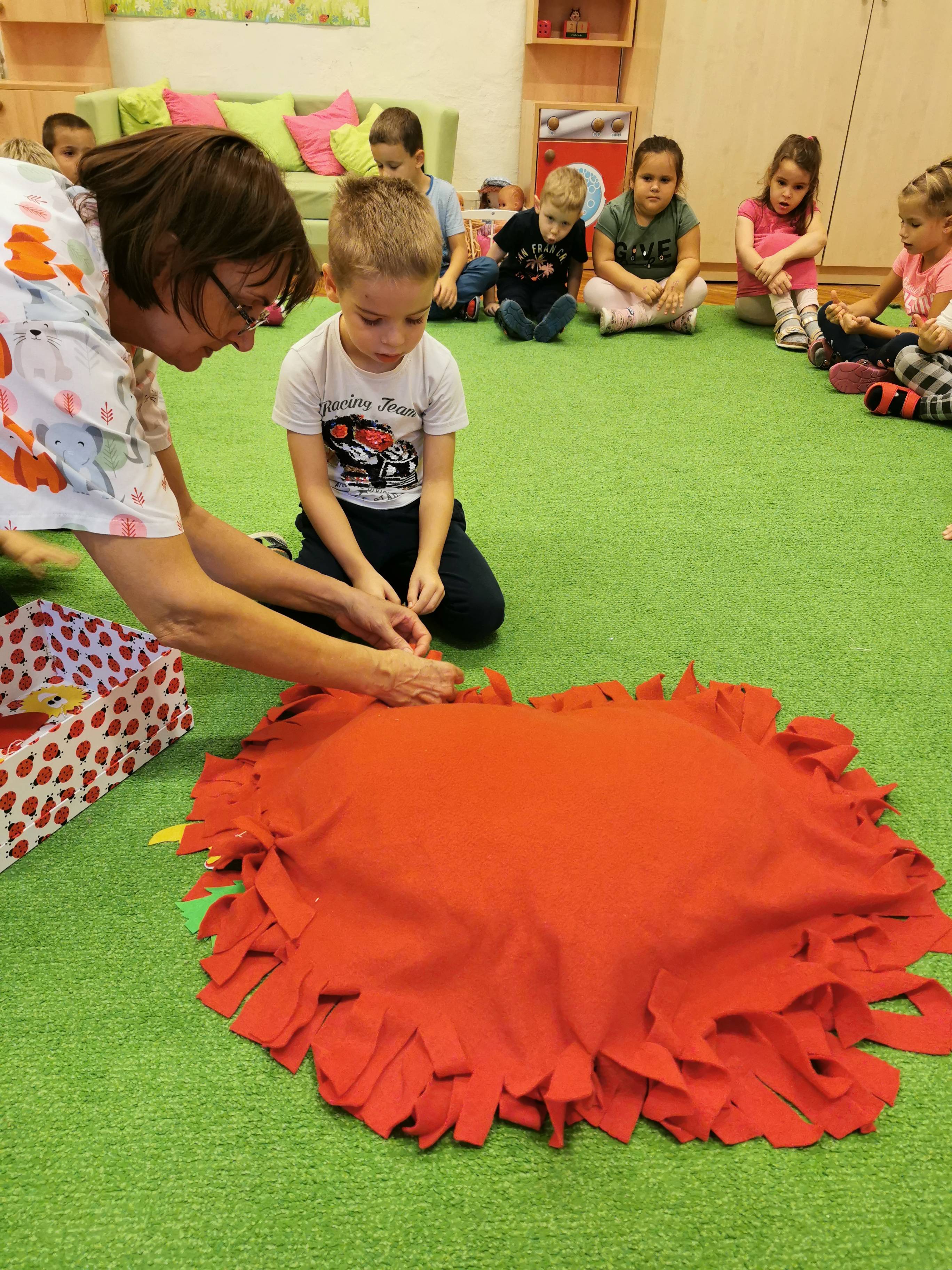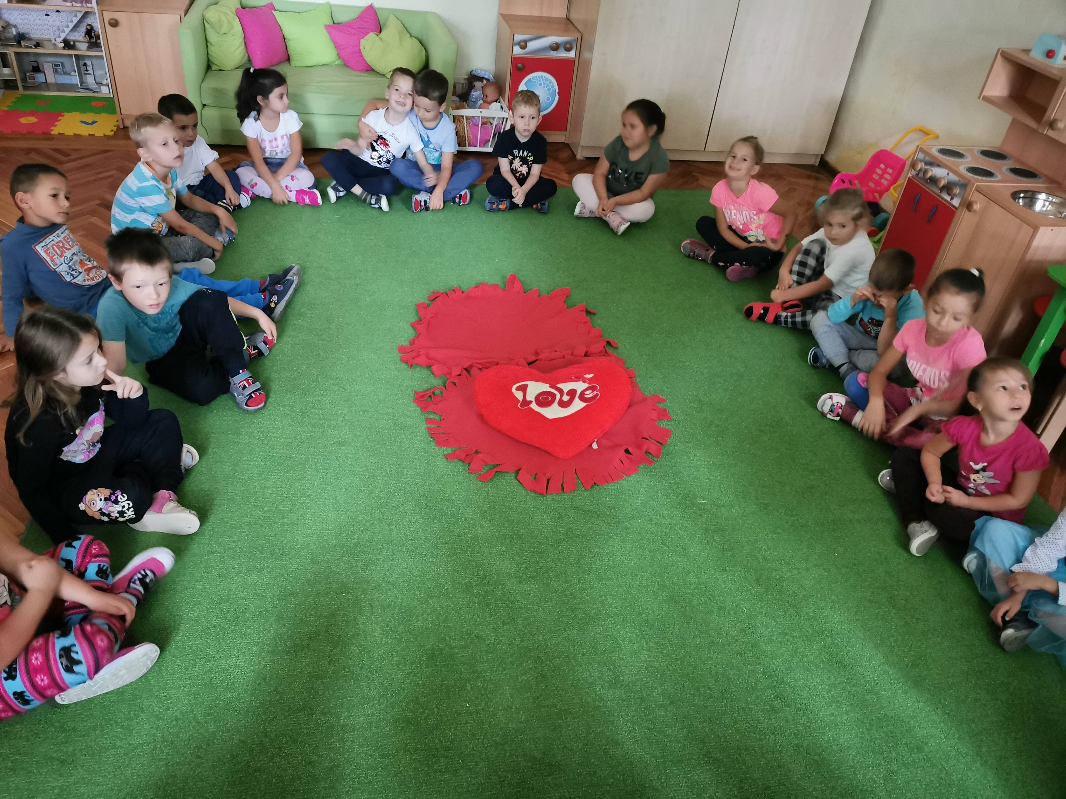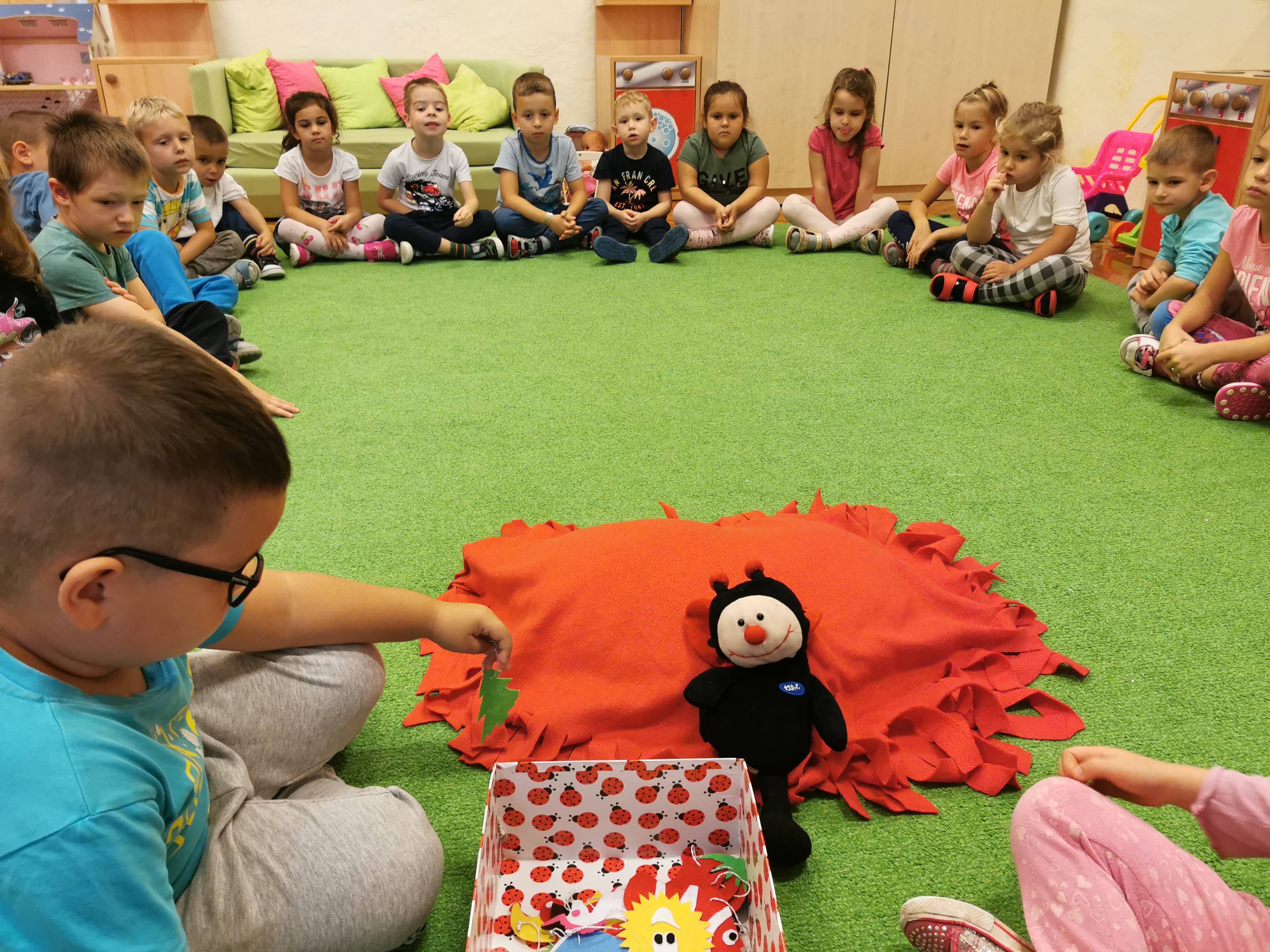 Elsőként a párnát középre tettem, a gyerekek jeleit pedig egy katicás dobozba rejtettem, majd a témára hangolódás érdekében meghallgattuk a hónap dalát. Egy rövid, kitalált, tanító jellegű történetet meséltem el a gyerekeknek, amiben egy kislány és egy szegény bácsi barátságot kötnek és kölcsönösen segítenek egymáson. A kislány meleg teával, süteménnyel kínálja a hidegben átfázott bácsit, ő pedig hálája jeléül egy szívecskés medált ajándékoz a kislánynak. A gyerekek közül néhány elmondták, hogy találkoztak már szegény emberekkel, családdal és a szüleik pénzt vagy a kinőtt gyerek ruhákat adták oda. Ennek kapcsán megbeszéltük, hogy bizony hálásak lehetünk szüleinknek, hogy felnevelnek minket, hogy van mit felvennünk, van mit ennünk és, hogy egészségesek vagyunk. Tudunk szaladgálni, énekelni, beszélni. Okos gondolatokkal színesítették a foglalkozást: -„Hálás vagyok, hogy anyukám ebbe az óvodába íratott be!”- „Hálás vagyok, hogy van itt az oviban sok szép játékunk!” -„Hálás vagyok, hogy van sok barátom!” – „Hálás vagyok, hogy a doktorbácsi azt mondta anyának, minden rendben a kisbabával a pocakjában!”
