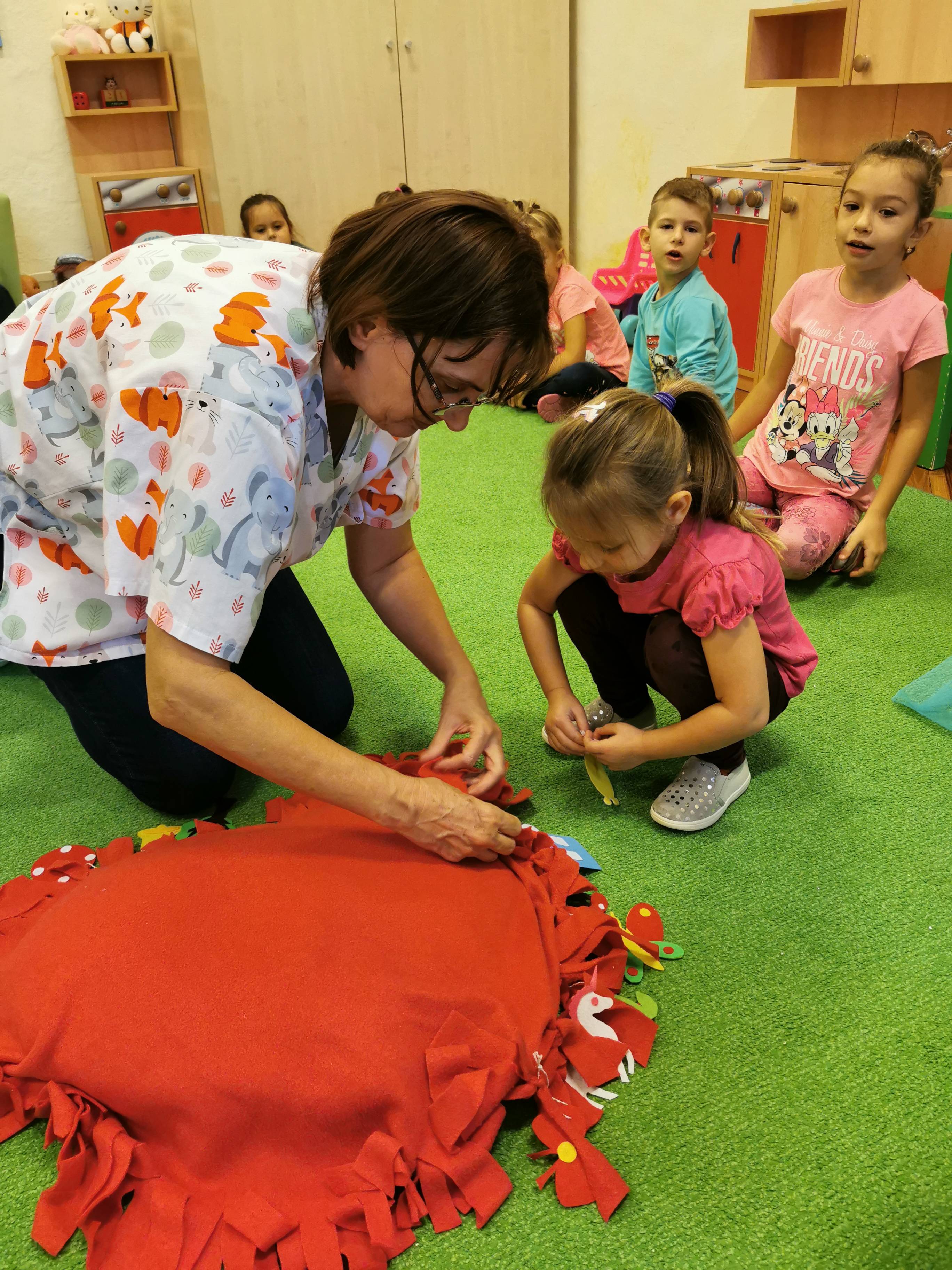 A Katicák izgatottan várták, az első Boldogságóra foglalkozást. Megbeszéltük előre, hogy ezeket a napjainkat különös figyelemmel a kedveskedésnek, a szeretet kifejezésre fordítjuk, még inkább igyekszünk megértőnek, jószívűnek lenni. Az előkészületeket már látták néhányan, amikor is, egy,- már nem használatos párnát kimosva újra elővettem, és egy piros plédből kivágtam a huzatot, majd bevágtam a széleit. A gyerekek filcből készült jeleit, még a Jézuska hozta, így teljes egészében újrahasznosított anyagokat használtunk a megvalósításhoz.