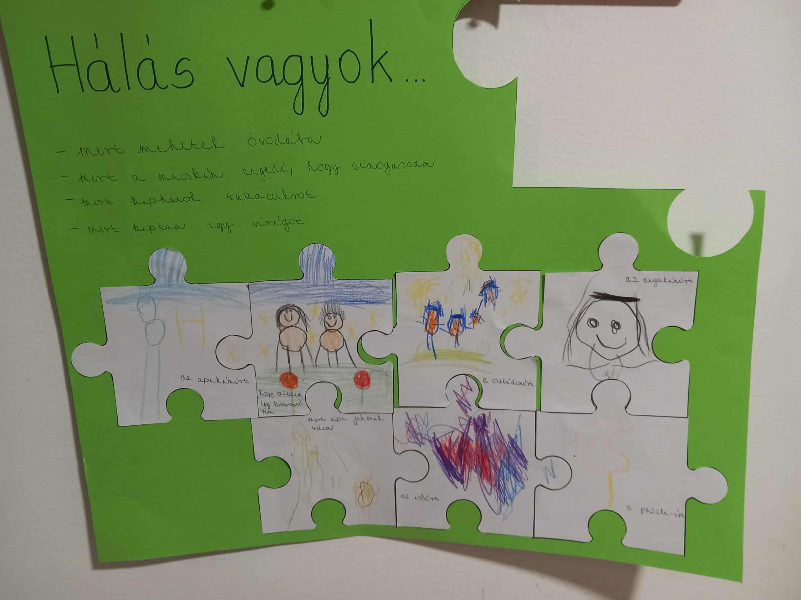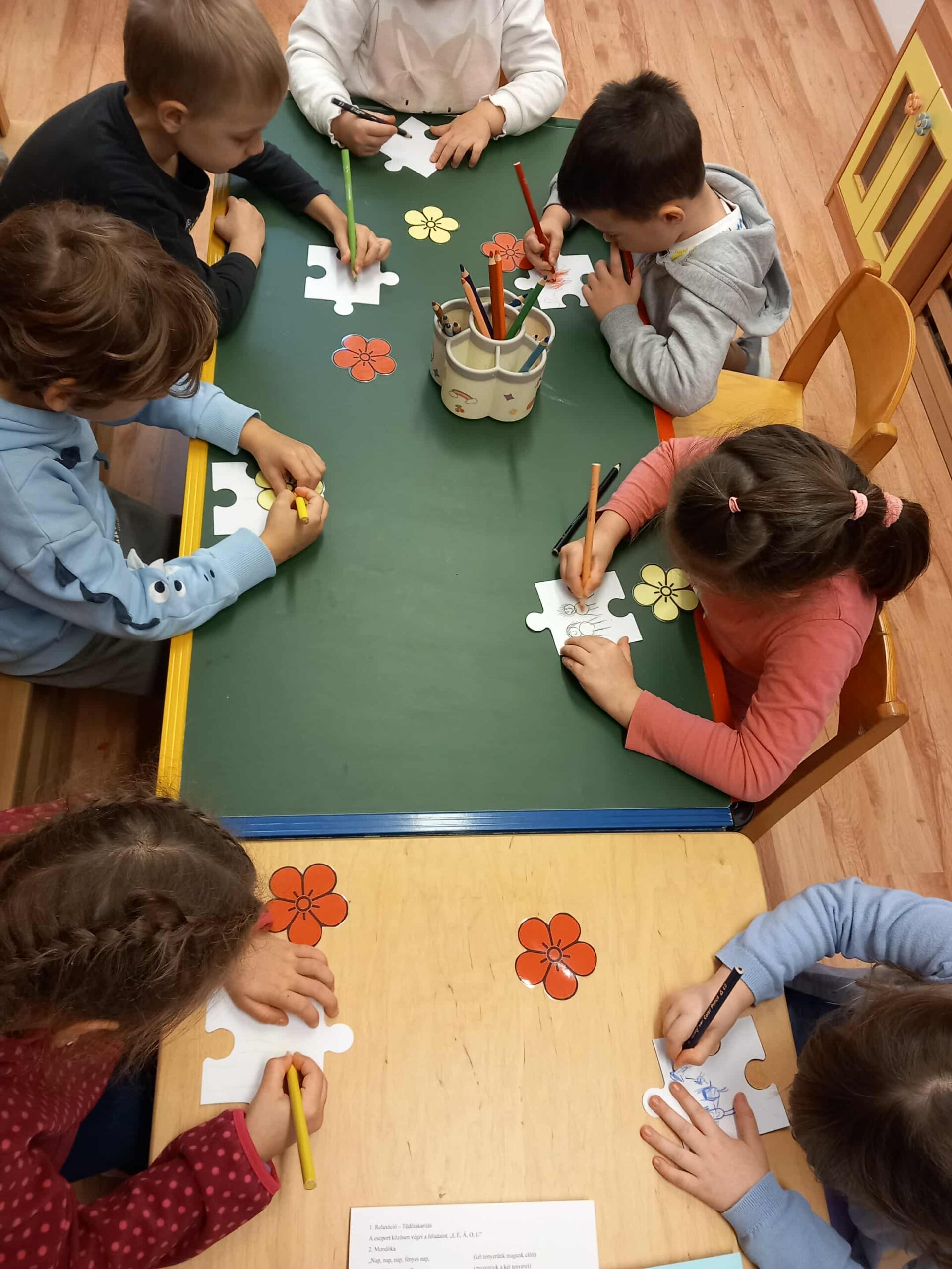 A gyermekek rászínezik a puzzle sablonra amiért hálásak, majd összeillesztjük a puzzledarabokat és egy nagy kirakót készítünk. Igény szerint a vágásnál segítséget nyújtok.