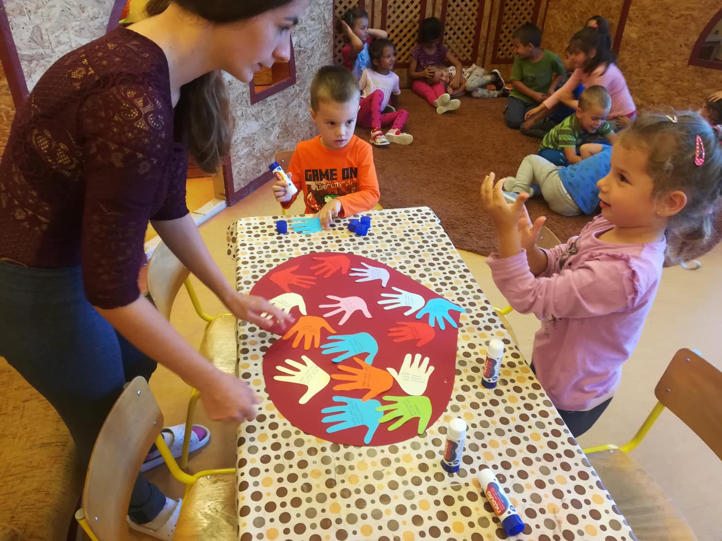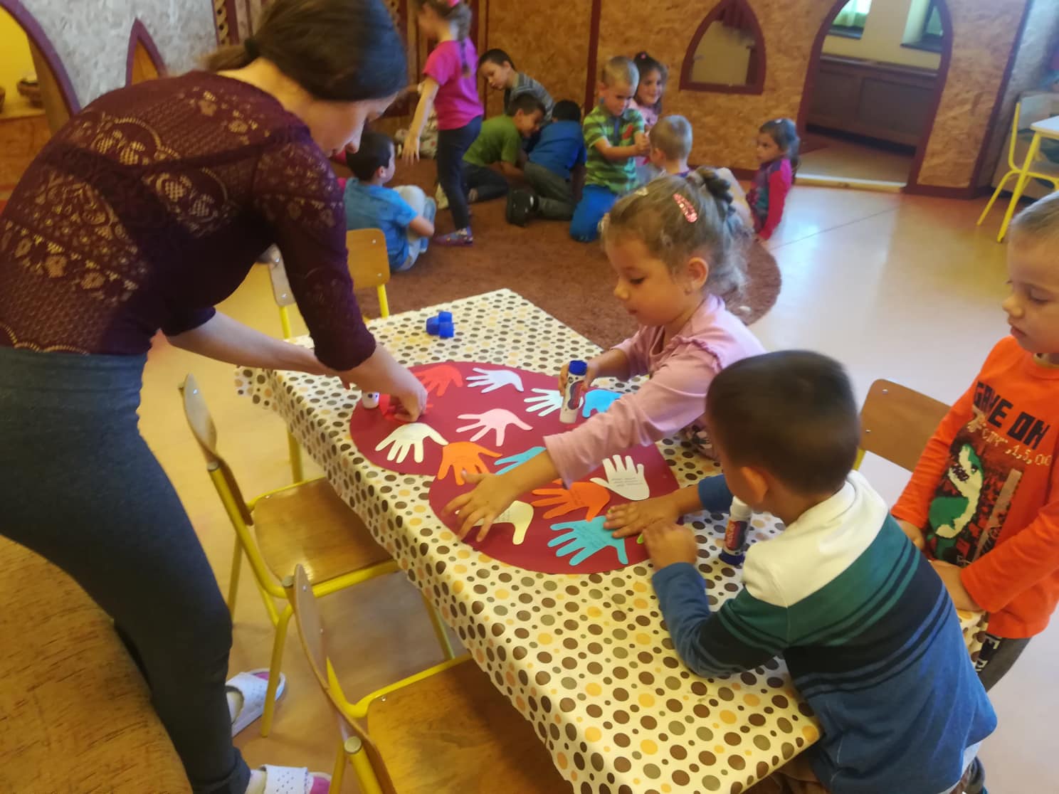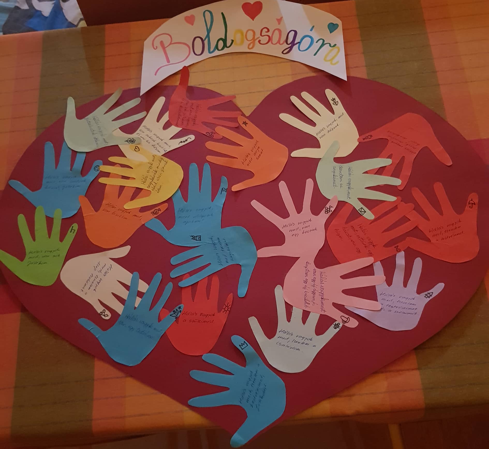 A gyerekekkel hála kezeket készítettünk ehhez a témához. Motiváltam őket a „Szép nap, ölelj most át” című dallal. Azután relaxációs gyakorlatokat végeztünk, majd pedig ” A hála fa történetét” olvastam fel a gyereknek. Beszélgettünk a háláról, amelyet a gyerekek jól megértettek. A kezekre ráírtuk azt, hogy a gyerekek miért/kiért hálásak. Befejezésként levezető táncra mozogtunk.