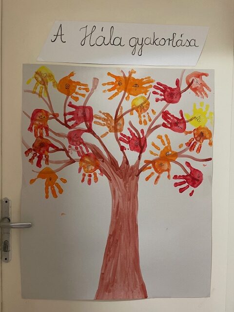 2020. Szeptemberétől kapcsolódtunk be a Boldogságóra Programba. Az idei tanévben az új kiscsoportos korú gyerekekkel is szeretnénk megismertetni a programot. Szeptember hónap témája: a Hála gyakorlása. Lelki beszélgetésekkel, relaxációs zenehallgatással, vándorjátékkal hangolódtunk rá a Hála gyakorlására. Kooperatív munkában elkészítettük a Hálafát, melyet elhelyeztünk a csoport öltözőjében jól látható helyre, amelyre a kisgyermekek, óvó nénik, és a dadus néni kézlenyomata került.