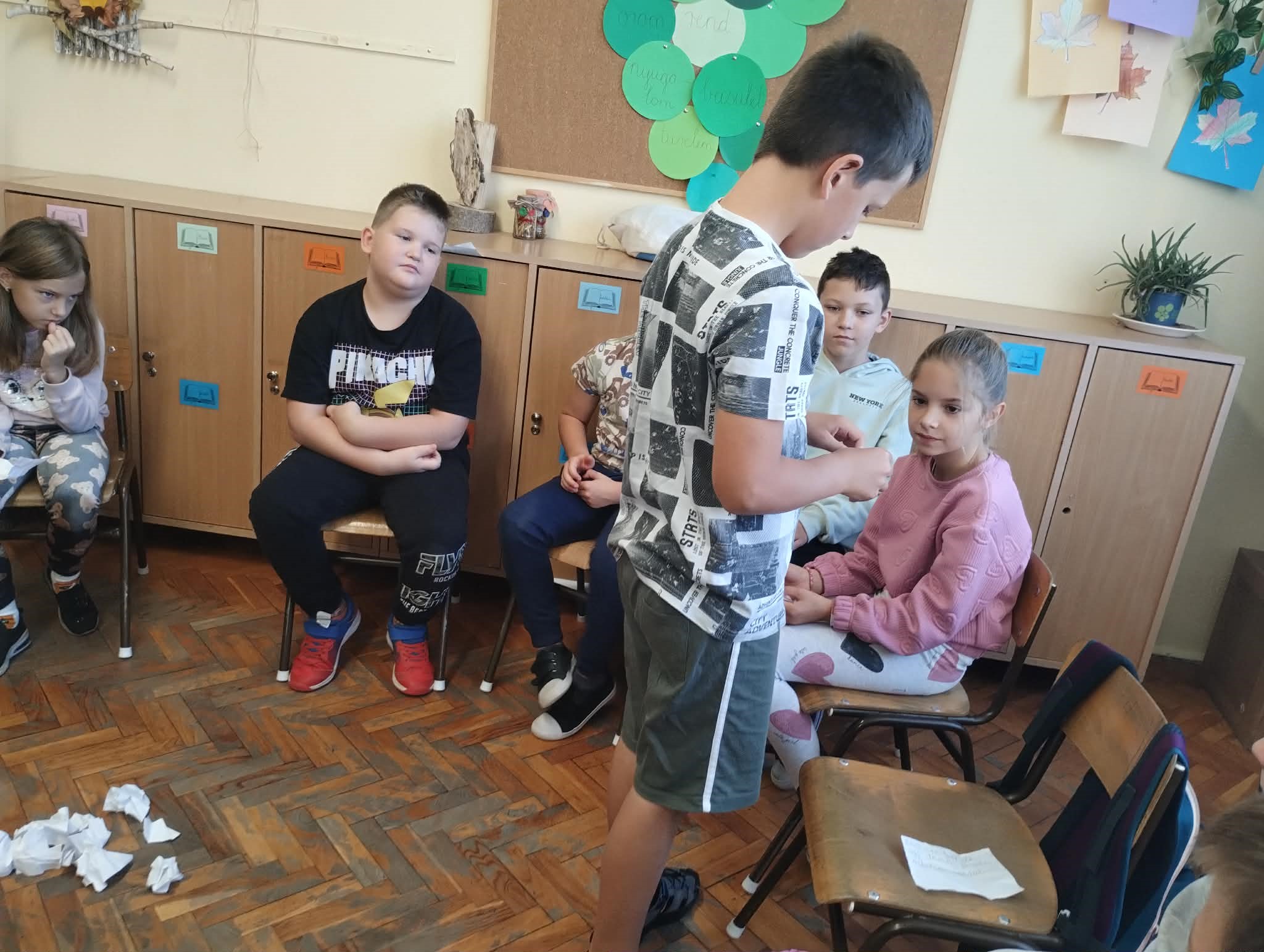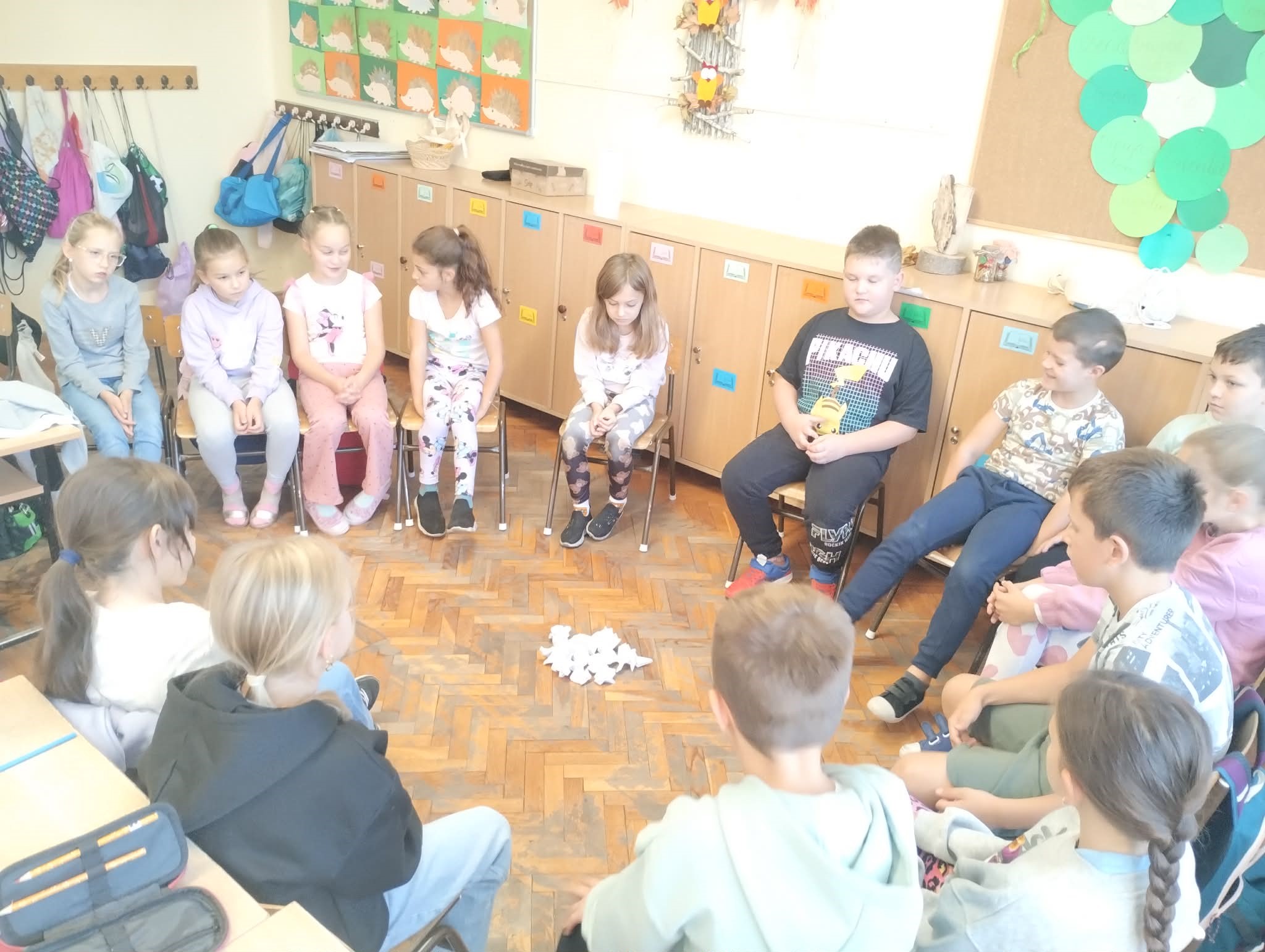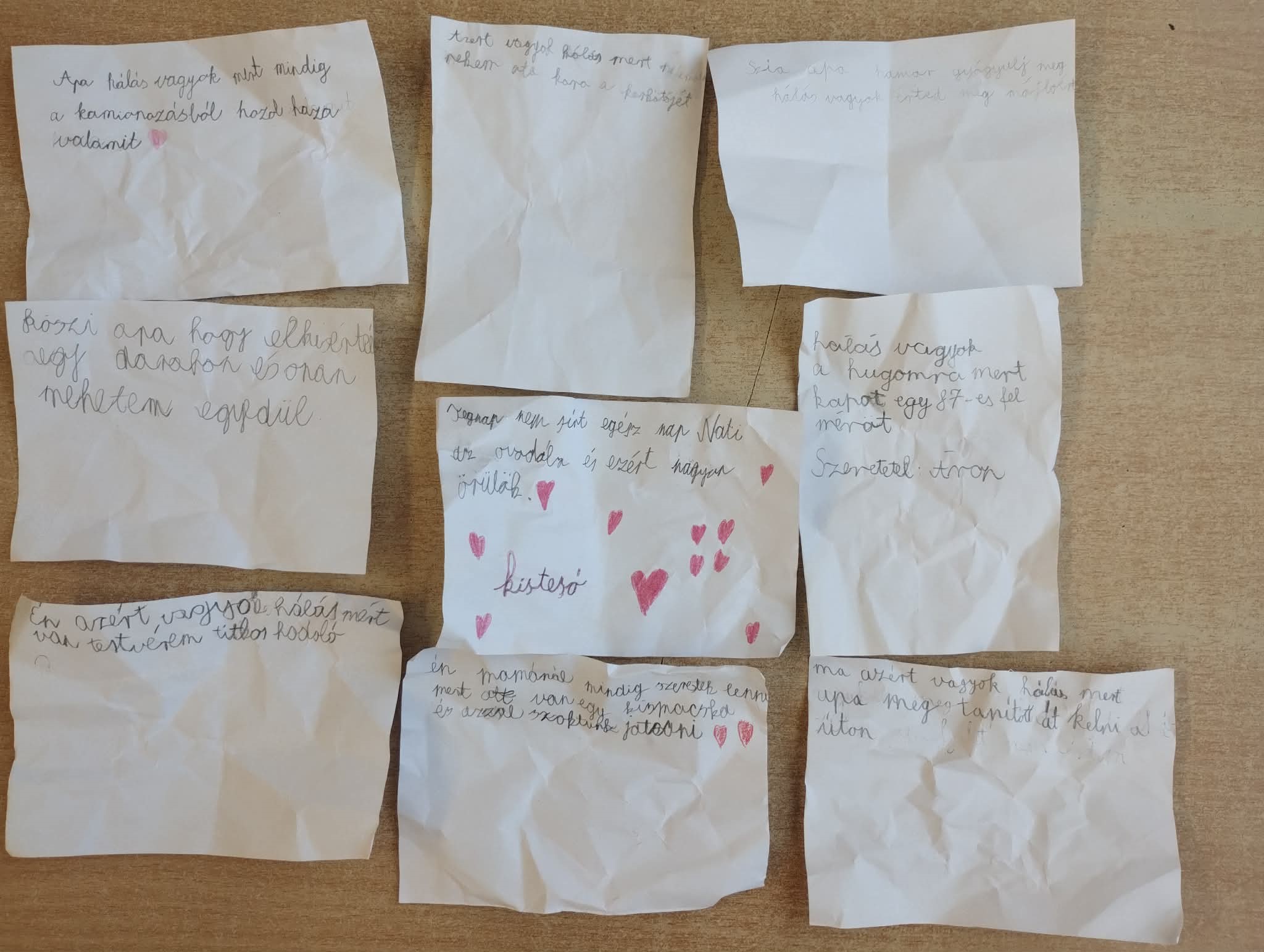Minden nap történik valami apró jó dolog, amiért érdemes hálásnak lenni.Az órán a háláról beszélgettünk. Mindenki leírt név nélkül néhány sort arról, amiért aznap hálás volt. Ezután felolvastuk a cetliket véletlenszerűen. Meghallgattuk egymás gondolatait, és megpróbáltuk kitalálni, ki írhatta az adott sorokat. A feladat segített abban, hogy észrevegyük a jó dolgokat, és jobban megismerjük egymást. Öröm volt hallgatni, hogy nem csak minden esetben magukra gondoltak a gyerekek, hanem valamelyik családtagjukra. Boldogsággal töltötte el őket is, mikor a másik társ kedves szavakat fűzött az irományához. Van, aki a megírt kis cetlijét büszkén vitte haza, és mutatta meg.