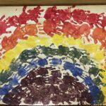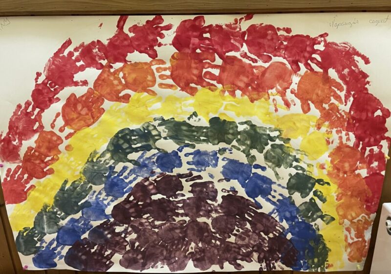 Többször is elmeséltük a Kis szivárvány meséjét, amibe a főhős -a kis szivárvány- hálás a barátainak a segitségükért, majd elkészült a Hálaszivárványt is a csoport kézlenyomatából.
