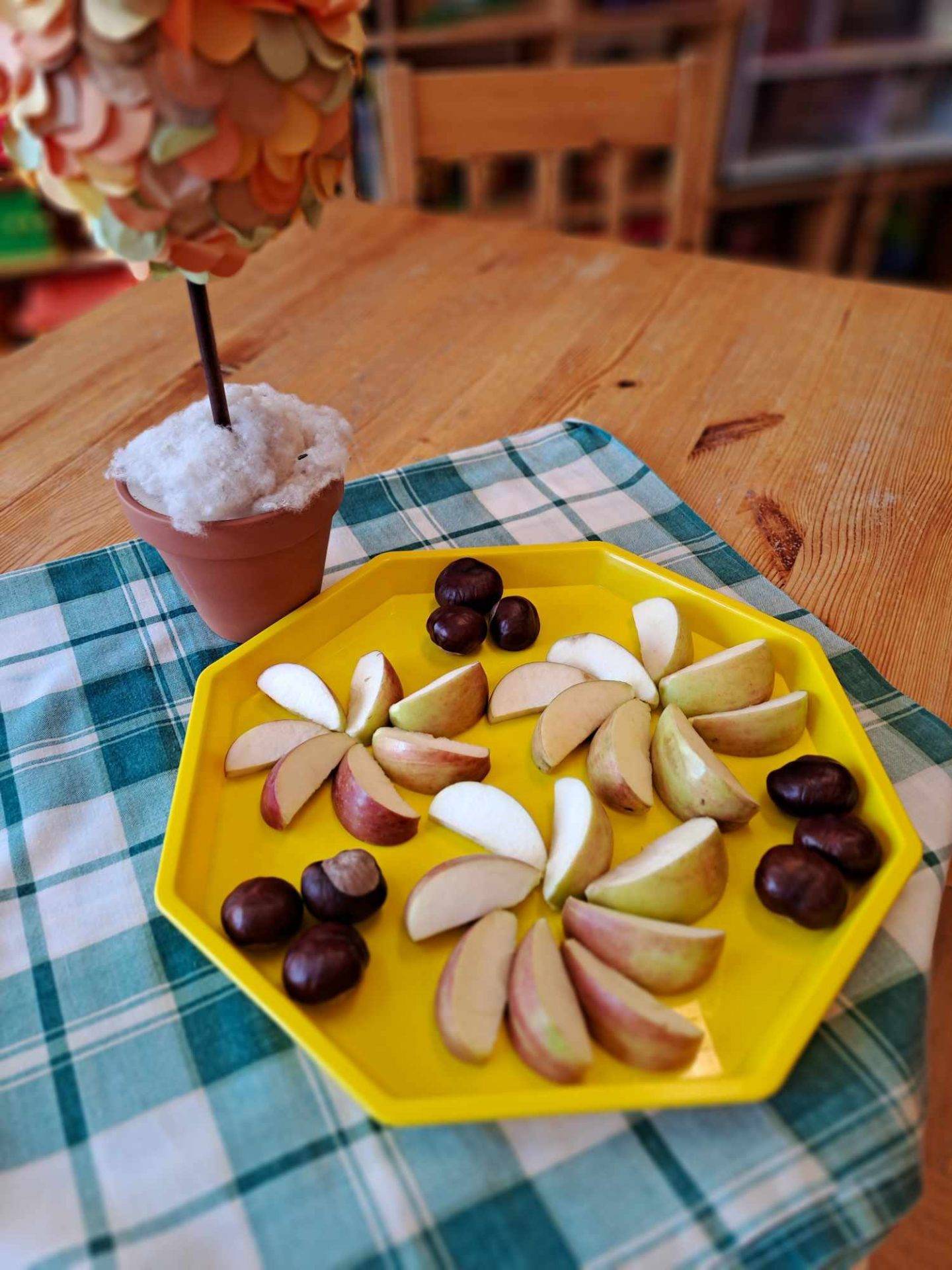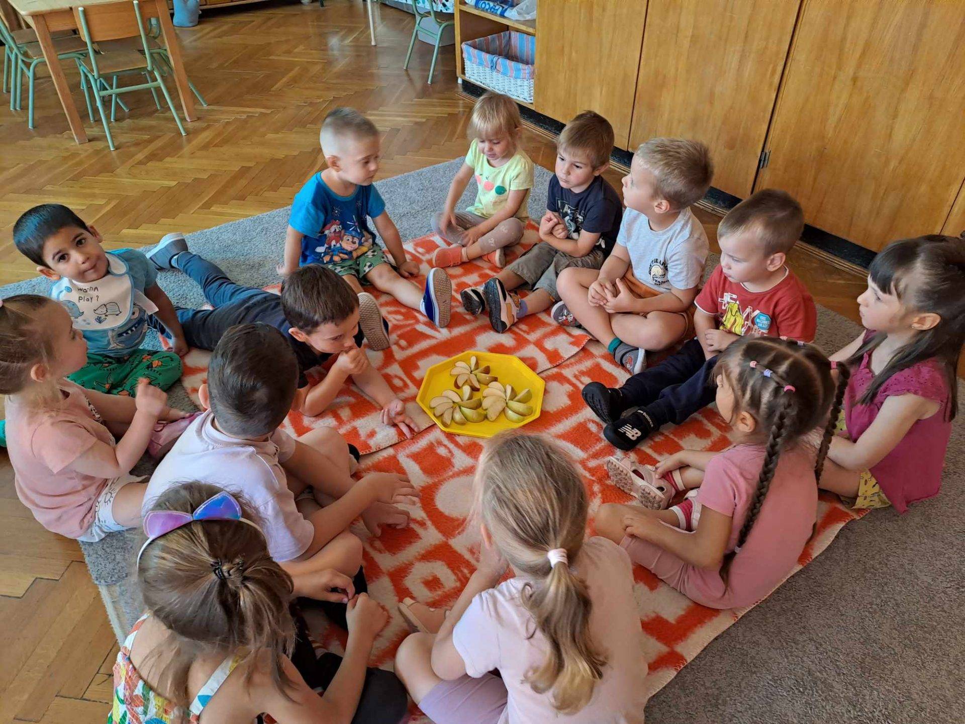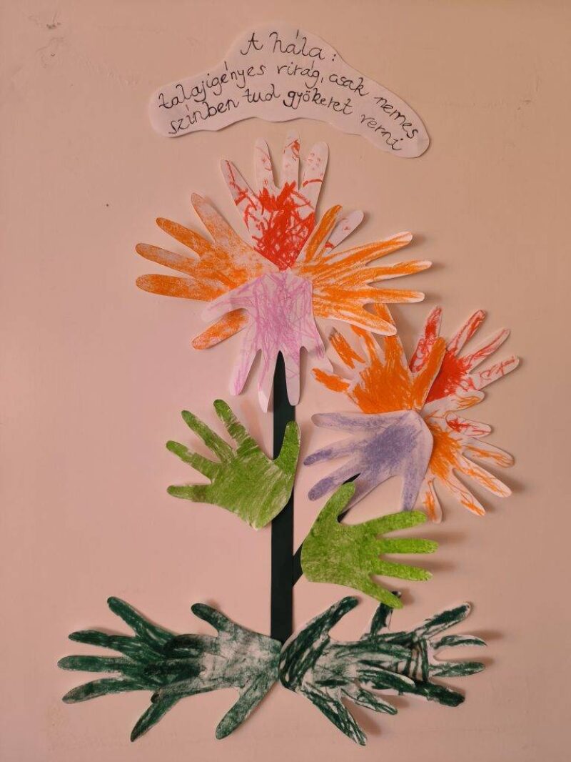 Ebben a hónapban a Hála fogalmával ismerkedett meg a csoportunk. Megbeszéltük hogy mit jelent hálásnak lenni valamiért vagy valakiért. Életkorukból adódóan a köszönet fogalma értelmezhetőbb volt számukra. Mindenki elmondhatta kinek szeretne köszönetet mondani. Az idősebb gyermekeink szépen megtudták fogalmazni hogy miért mondanak köszönetet szüleiknek, nagyszüleiknek az őket körülvevő felnőtteknek, barátaiknak. Közösen elkészítettük a csoportunk egységét jelképező hálavirágot. A nagyobb gyerekek zöldre,míg a kicsik számukra kedves színnel színezték ki a kezeket. Az idősebb gyermekeink kezei a szilárd talajt míg a kicsik kezei a velük együtt növekedő virágokat jelképezi. A tevékenység zárásaként Gryllus Vilmos: Őszi falevél című dalára mi is falevelekké váltunk és örömteli tánccal zártuk a napot. Jól elfáradtunk és pihenésképpen közösen elfogyasztottuk a csoport kedvenc gyumölcsét. Nagyon jó hangulatban telt a délelőtt már várjuk a következő alkalmat.
