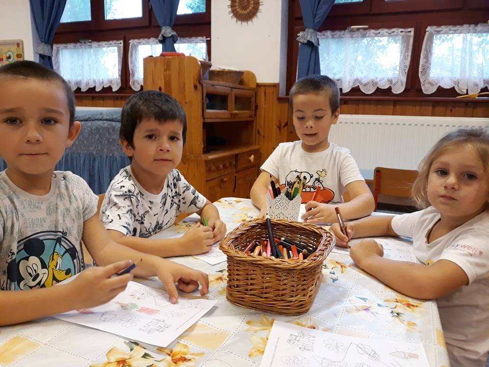 „Elővarázsoltam” a mesedobozt és beszélgetést kezdeményeztem a gyermekekkel. Megpróbáltuk közösen kitalálni, hogy mi lehet benne, mit lehetne ezzel a dobozzal kezdeni, mit láthatunk rajta. Már nagyon kíváncsiak voltak, hogy mi lehet a dobozban. A mese (Maci bajban van) bábjait rejtettem el benne. Nagyon tetszett nekik a mese, többször is elbáboztuk a hónap folyamán. Kiszíneztük a hála jelének virágát, amiből hálakertet készítettünk, valamint kiszínezték azokat a dolgokat, tárgyakat, személyeket, amelyekért hálásak. Igazából mindent kiszíneztek, nem tudtak választani! 🙂