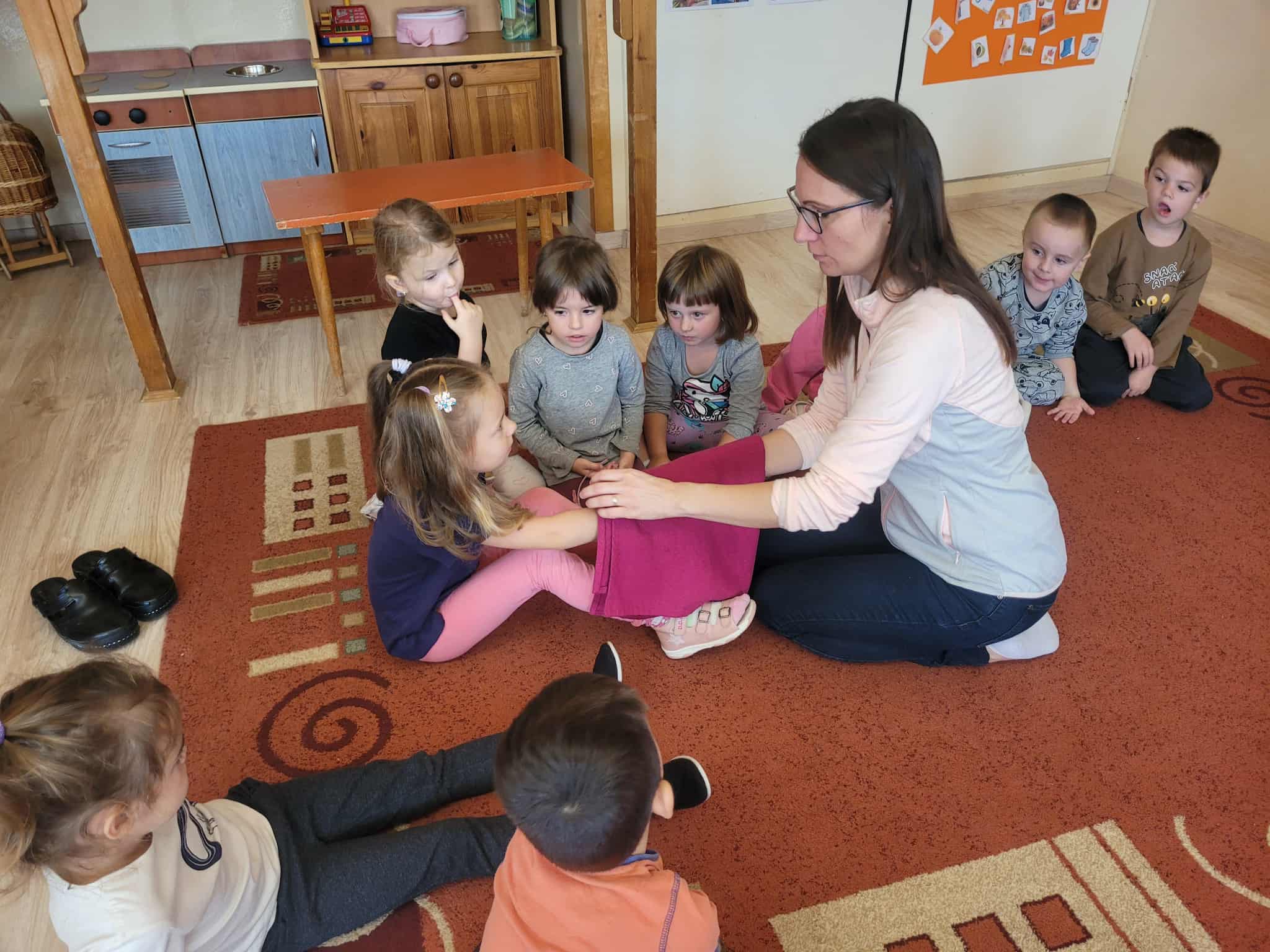 A népmese napján Benedek Elek által gyűjtött Az aranypálca című mesét hallhatták tőlem. A mese illusztrációjához előre készített képeket gyűjtöttem, így a mesét később a gyerekek is elmondhatják maguk közt. A mesében elhangzott „jó tett helyében jót várj” közmondást többször is említettem szeptember hónapban a beszélgetéseink során, így az már ismerős volt a gyerekek számára. A királyfi önzetlen segítségnyújtása jó példa a gyerekek számára, akire gond és baj esetén lehet számítani. A babakonyha előtt az asztalra a gyerekek is finomabbnál finomabb ételeket tettek és meghívták egymást vendégségbe. Öröm volt látni az önzetlenségüket, illetve azt, mennyire hálásak tudnak lenni egy-egy kedves szóért, tettért.