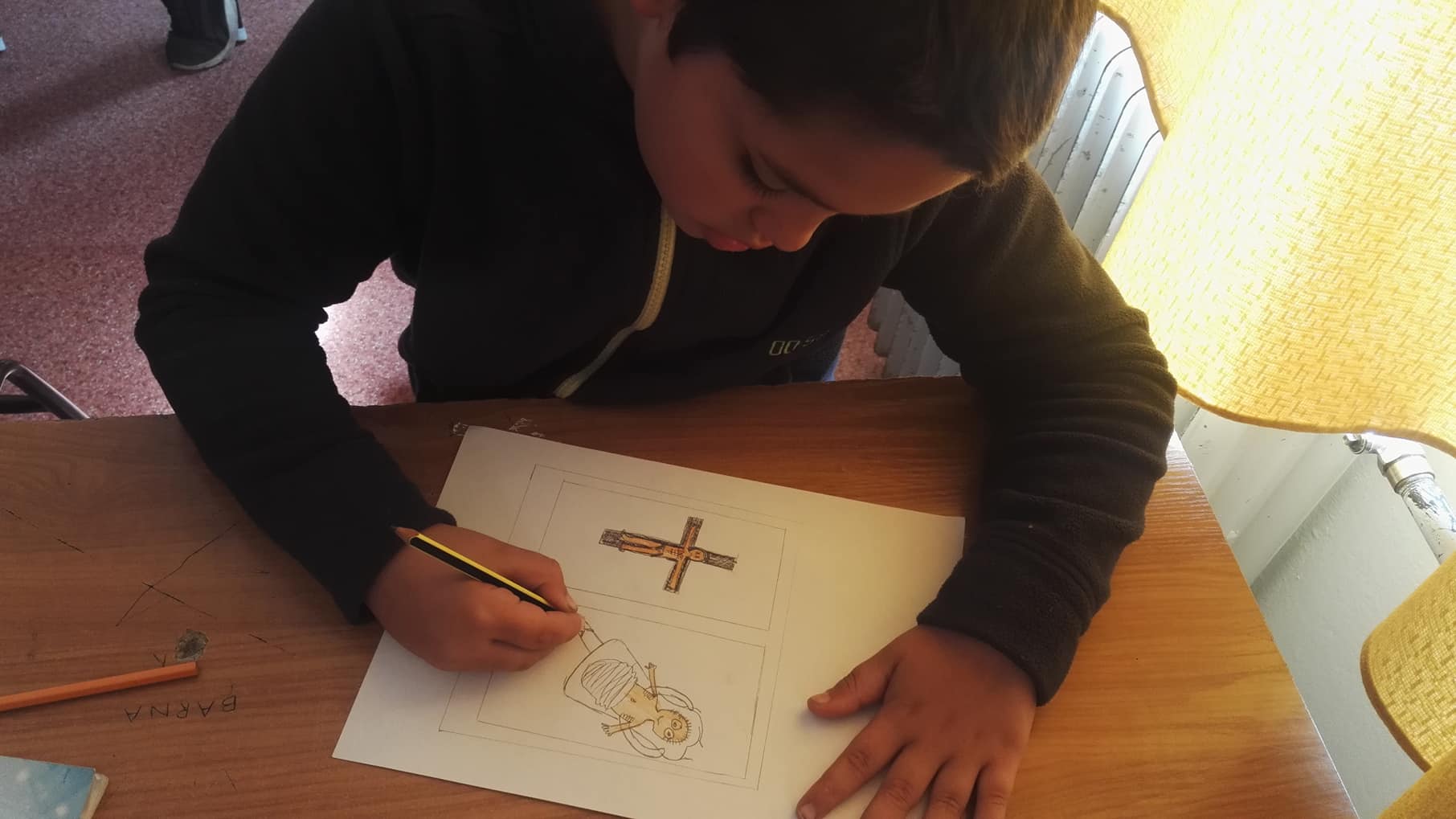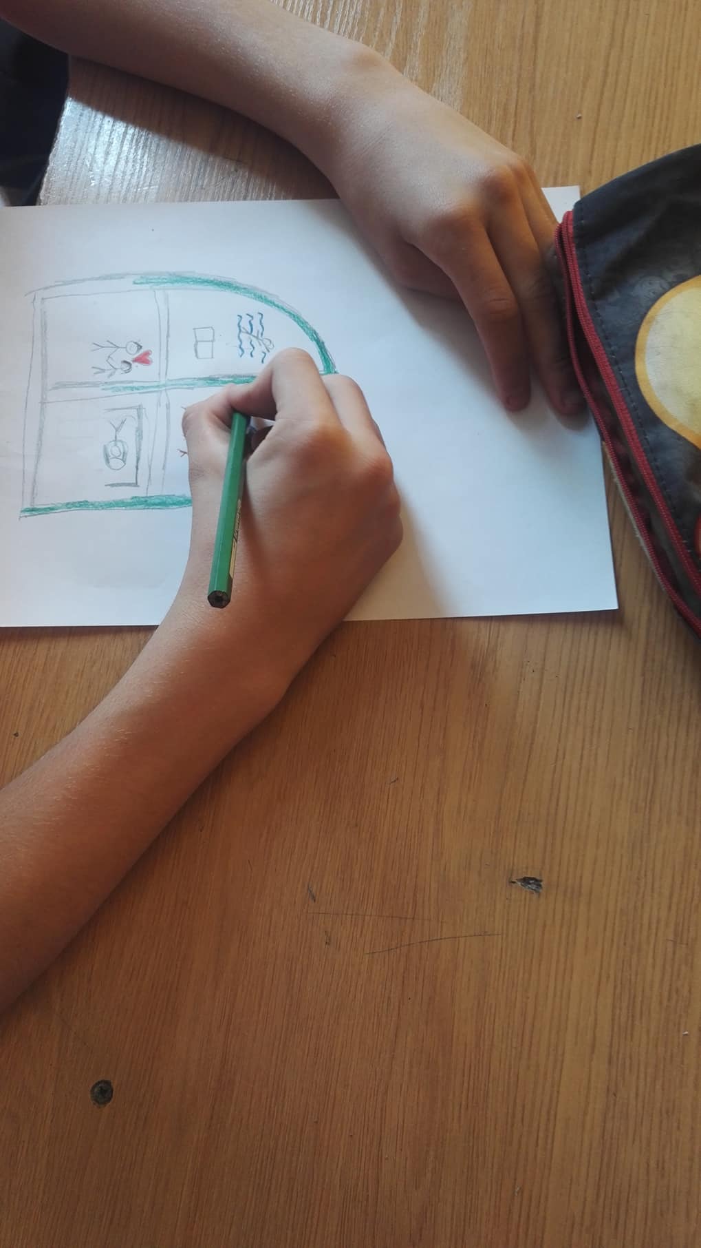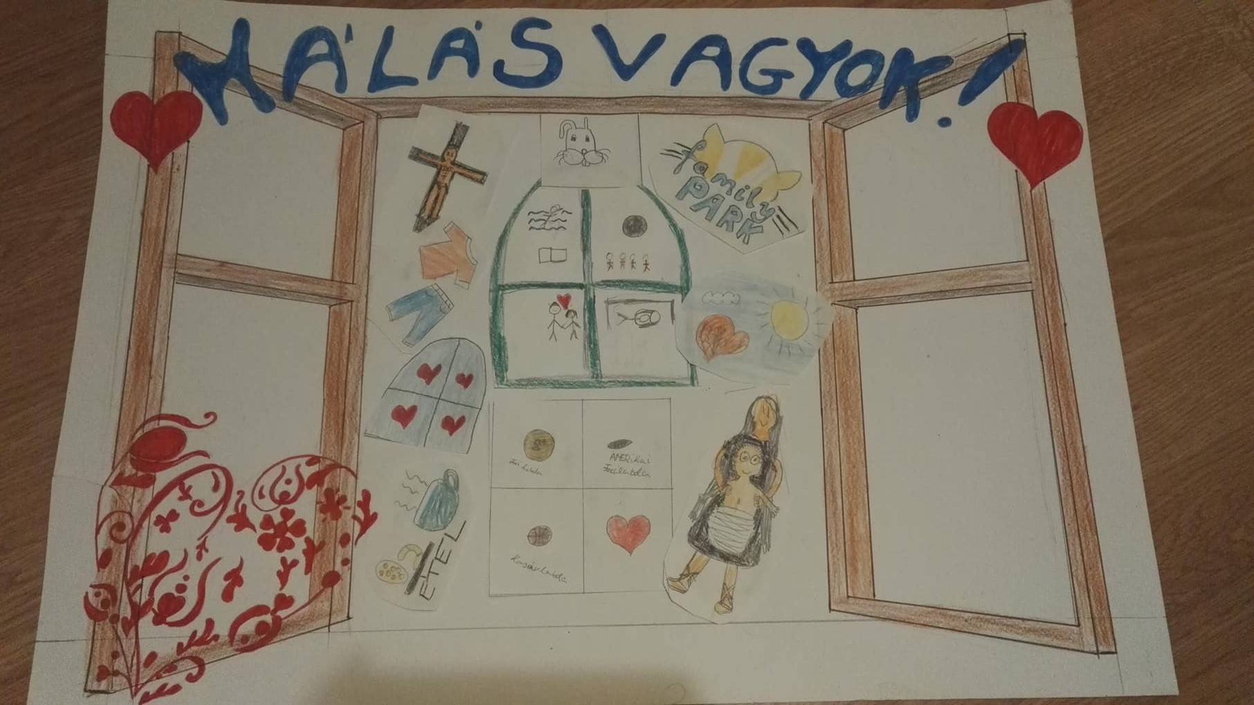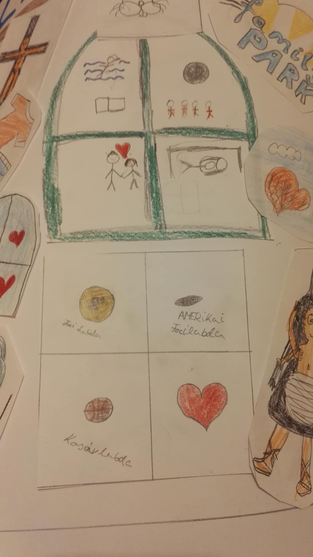 Az óra utolsó felében az alkotáson volt a hangsúly. Előre elkészítettem nekik az ablakkeretet, majd mindenkinek egy kis lapocskát osztva neki láttak a rajzolásnak. Nagyon érdekes volt szemlélni, ahogyan próbálták az érzelmeket, gesztusokat is kifejezni a rajzukban.