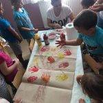 Ezután elkészítettük a történetben szereplő Hálafát. Egy előre megrajzolt csupasz fára, a gyerekek színes tenyérlenyomatokat mintáztak falevél gyanánt. A kész fa nagyon tetszett mindenkinek, hisz „egy darab” mindenkiből.