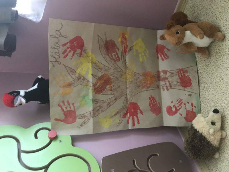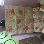 Ezután elkészítettük a történetben szereplő Hálafát. Egy előre megrajzolt csupasz fára, a gyerekek színes tenyérlenyomatokat mintáztak falevél gyanánt. A kész fa nagyon tetszett mindenkinek, hisz „egy darab” mindenkiből.
